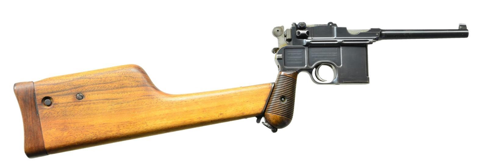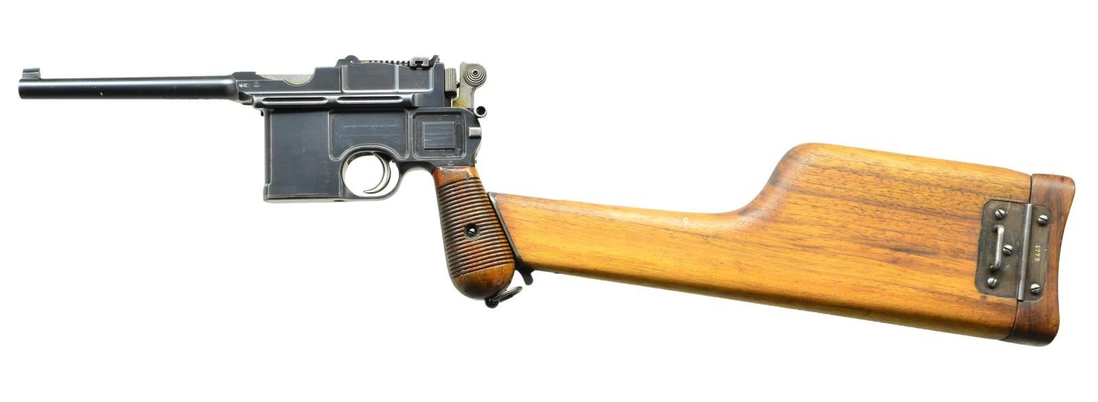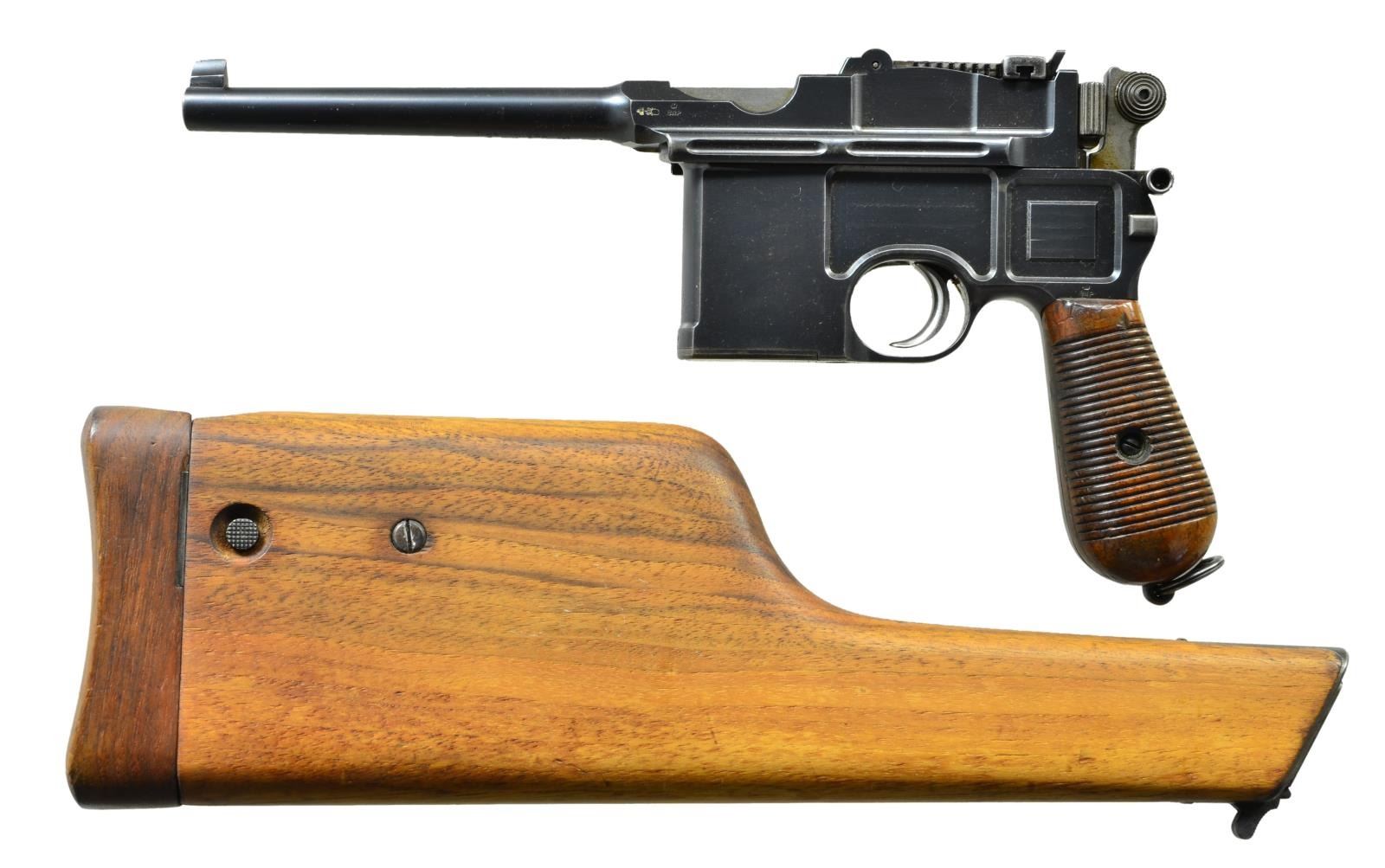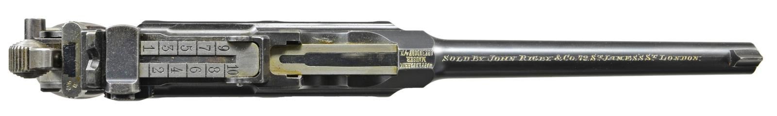MATCHING STOCK. Cal. 7.63mm. S# 1778. Standard early production conehammer w/ 5.5" bbl., fixed front sight & pinned 1-12 rear sight. Long extractor & independently secured firing pin. Top of chamber w/ usual 3 line address. Crown /"C"/"U"" on left side of bbl. extension; antler proof on right. Inspection markings under bbl. Matching S# on back of frame & on upon disassembly, on all usually numbered parts including the rear sight assembly & each of the grip panels. Dry grease precluded removal of the firing pin. British proofed w/ pressure test markings on bottom of bbl. & crown / "BNP" on left side of bbl. extension & left side of frame immediately over grip. Top of bbl. hand inscribed "SOLD BY JOHN RIGBY & CO. 72. ST JAMES ST LONDON" within faint scribe marks. UNATTACHED ACCESSORIES: complete w/ factory matching stock, the number appearing on the top portion of the hinge rather than the lug. CONDITION: approx. 97% bright original rust blue w/ usual high point wear, especially front of mag. well & early toning of the front & back straps. Comparable condition fire blued parts that show no suggestion of enhancement. Very bright bore w/ sharp rifling. Perfect manual mechanics. VG plus stock w/ lightly refinished wood & lug whose upper arm has been touched up w/ cold blue. A superb & classic early conehammer, w/ matching stock, marked by one of the best known British retailers.(01-21637/LMA). ANTIQUE. $6,000-9,000.