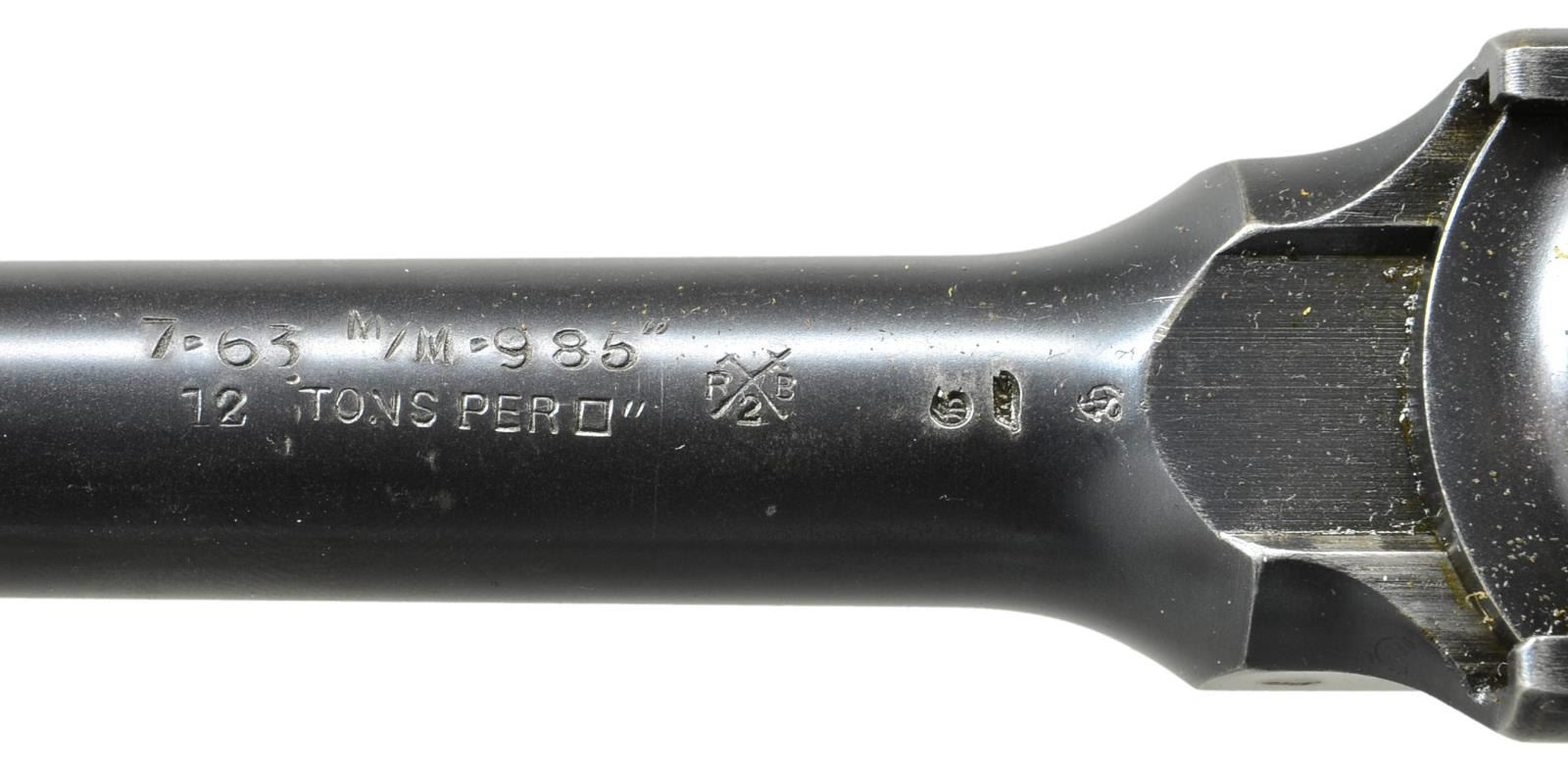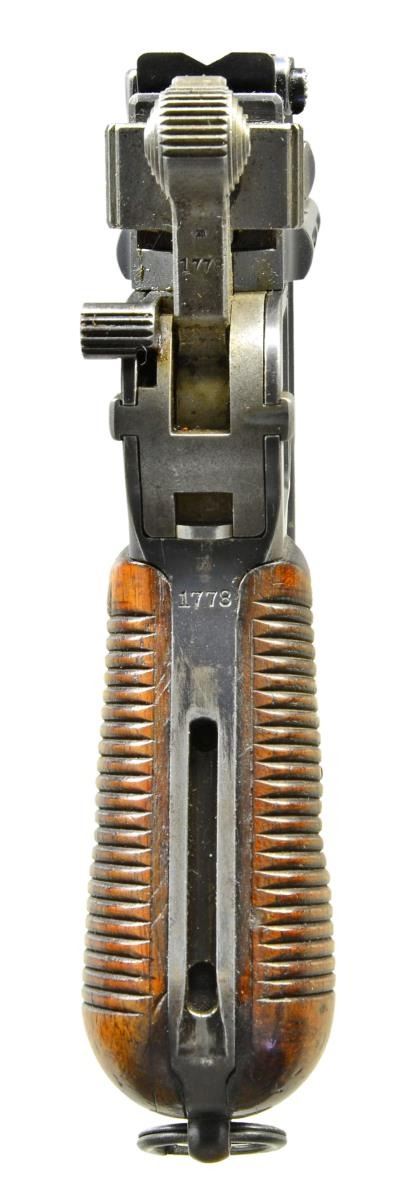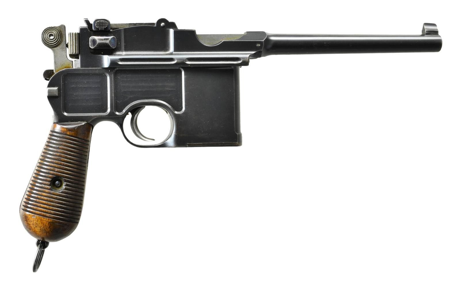 MATCHING STOCK. Cal. 7.63mm. S# 1778. Standard early production conehammer w/ 5.5" bbl., fixed front sight & pinned 1-12 rear sight. Long extractor & independently secured firing pin. Top of chamber w/ usual 3 line address. Crown /"C"/"U"" on left side of bbl. extension; antler proof on right. Inspection markings under bbl. Matching S# on back of frame & on upon disassembly, on all usually numbered parts including the rear sight assembly & each of the grip panels. Dry grease precluded removal of the firing pin. British proofed w/ pressure test markings on bottom of bbl. & crown / "BNP" on left side of bbl. extension & left side of frame immediately over grip. Top of bbl. hand inscribed "SOLD BY JOHN RIGBY & CO. 72. ST JAMES ST LONDON" within faint scribe marks. UNATTACHED ACCESSORIES: complete w/ factory matching stock, the number appearing on the top portion of the hinge rather than the lug. CONDITION: approx. 97% bright original rust blue w/ usual high point wear, especially front of mag. well & early toning of the front & back straps. Comparable condition fire blued parts that show no suggestion of enhancement. Very bright bore w/ sharp rifling. Perfect manual mechanics. VG plus stock w/ lightly refinished wood & lug whose upper arm has been touched up w/ cold blue. A superb & classic early conehammer, w/ matching stock, marked by one of the best known British retailers.(01-21637/LMA). ANTIQUE. $6,000-9,000.