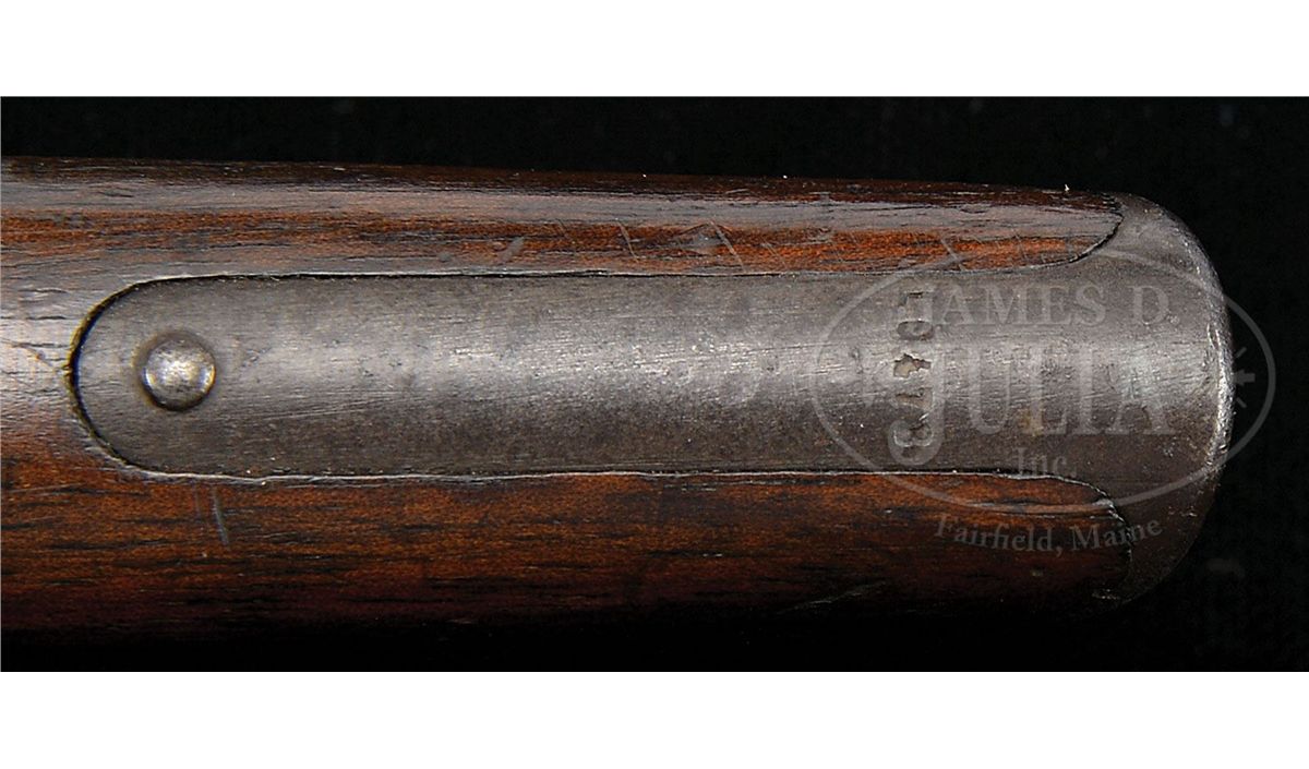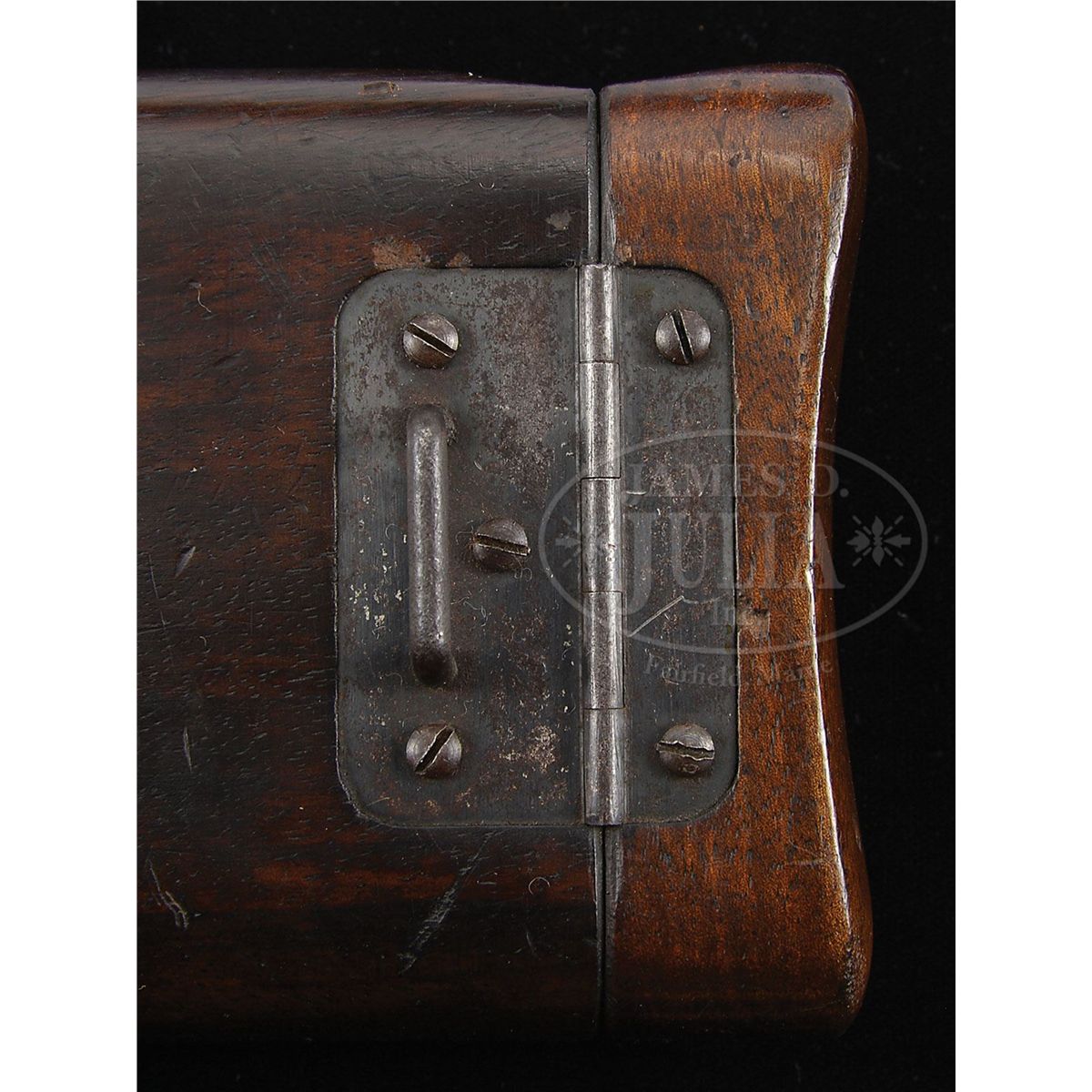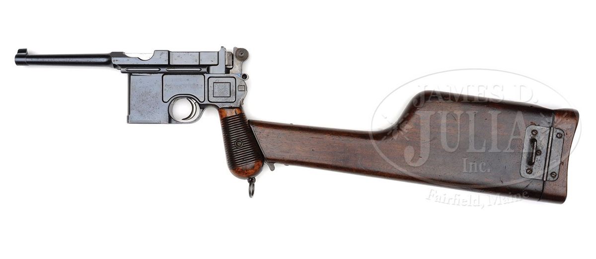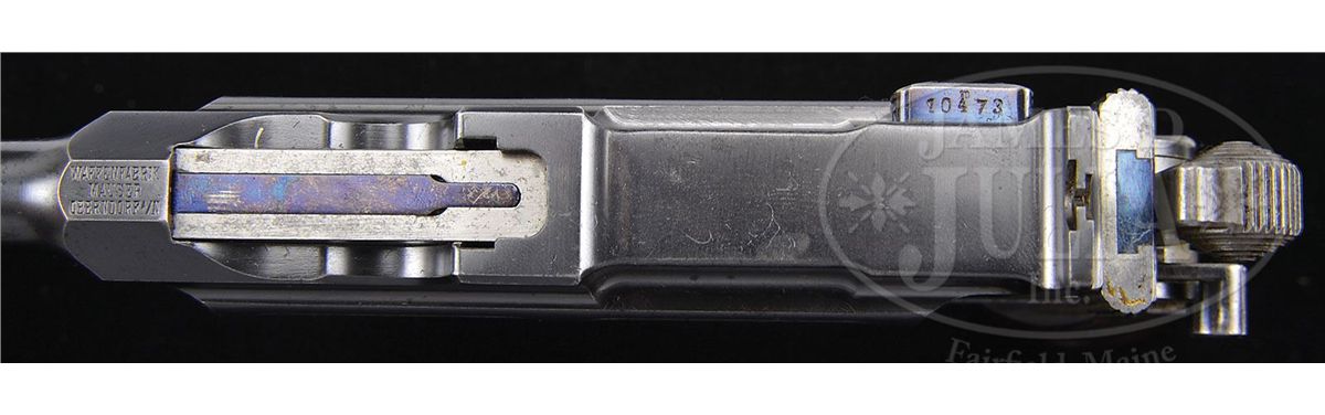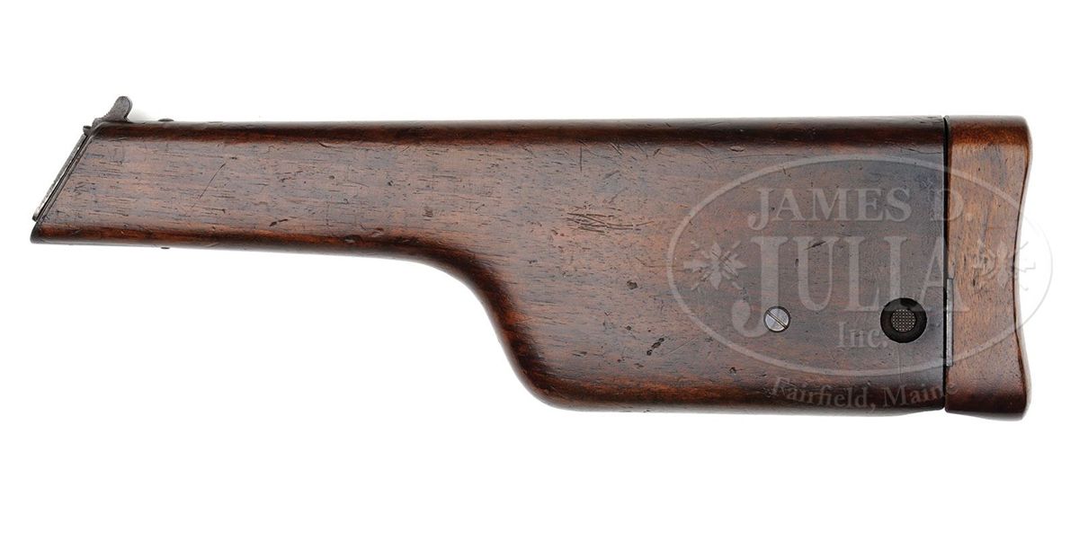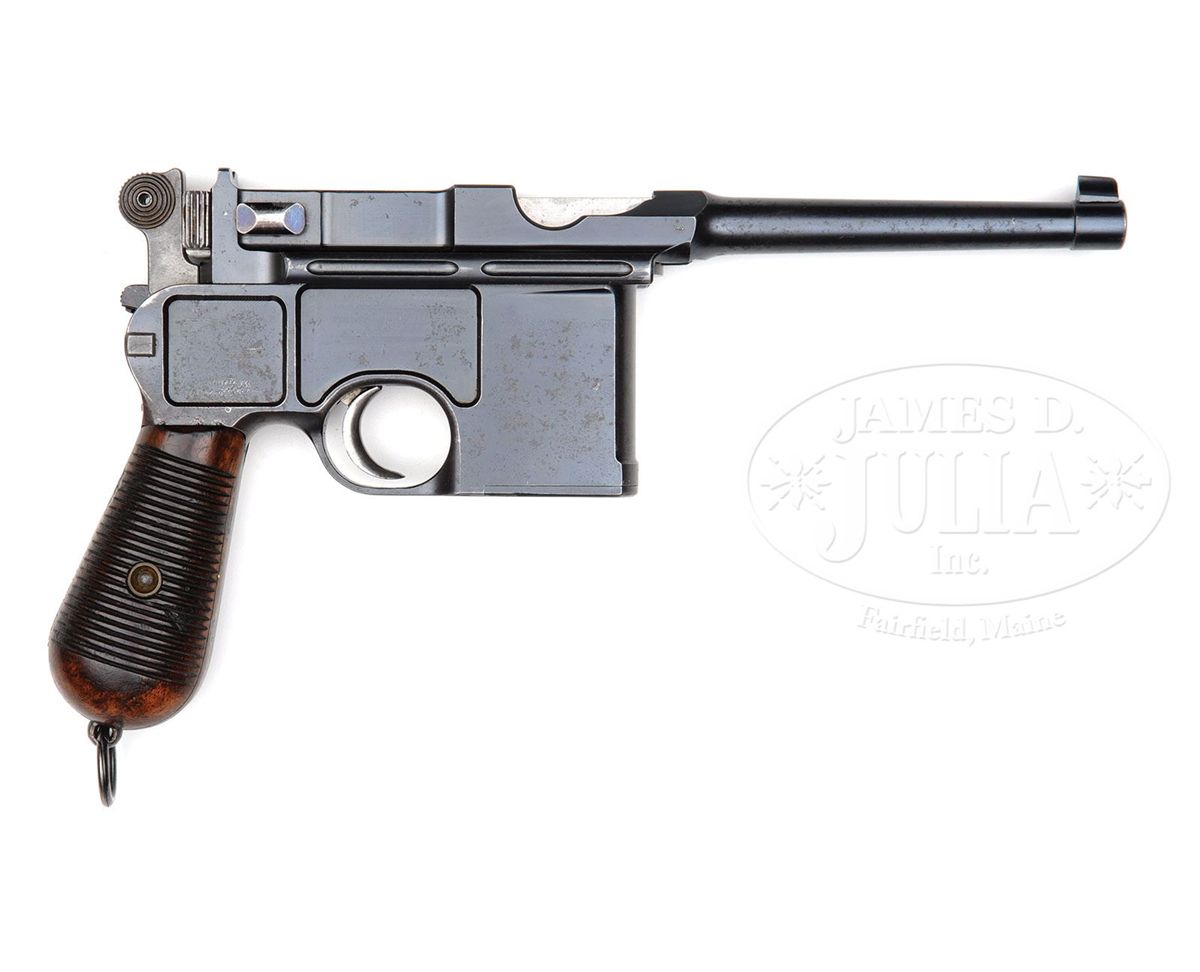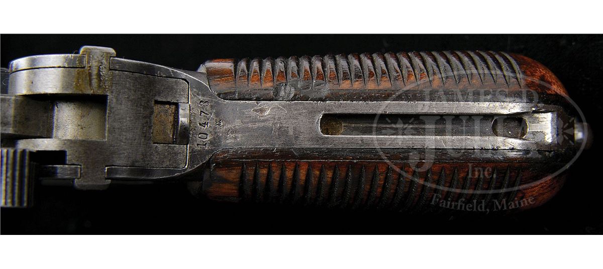 SN 10473. Caliber 7.63mm. Conehammer with 4.75" bbl and fixed rear sight. Usual chamber address. Crown U marking on left side of bbl extension. Antler proof on right side. Early bolt with long extractor and separately retained firing pin. Later Conehammer frame with raised island in the rearmost recess on the left side. Full serial number on backstrap just below locking lever. Detailed disassembly shows all matching serial numbers (including the firing pin) and grips whereby the full serial number was struck inside each panel. Original lanyard ring. Accompanied by all original matching shoulder stock with the full serial number applied in small numerals across the top of the stock lug. PROVENANCE: Joseph J. Schroeder, Jr. Collection. CONDITION: Original 80-90% blue with scattered flecks of discoloration and frosting. A few small spots of pitting on the frame just above each grip panel. Front and back straps gray-brown from handling. Comparable or slightly better condition all original fire blue on extractor, bolt stop, firing pin retainer, and safety. Original grips retain most of the varnish with some staining. Excellent near mirror bore with sharp rifling and minimal corrosion. Perfect mechanics. Original stock has much of its varnish, no cracks, but is oil stained with scattered nicks and dings. Stock lug has largely transitioned to a gray but shows no modification from its original factory form. Oxidation on looped hinge consistent with the condition of the stock. No internal modifications of the lid. A very nicely presenting and all original fixed sight Conehammer rig whose antique status should make it even more attractive. 4-48558 LMA35
