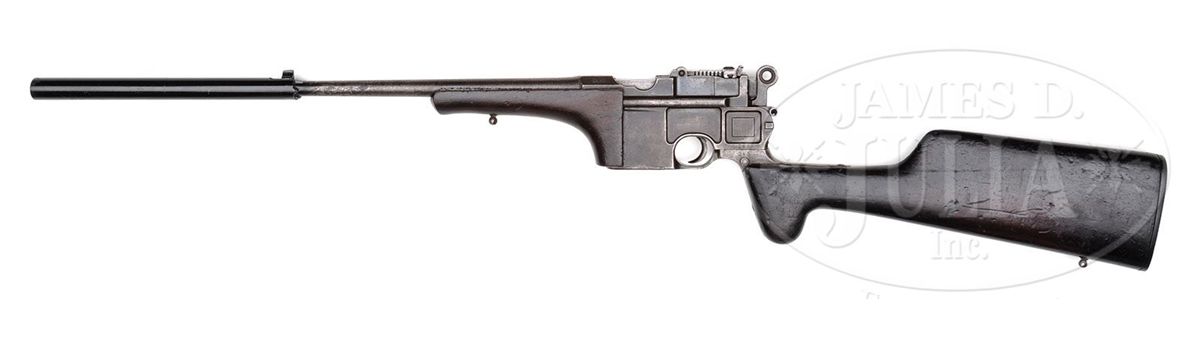 SN 245. Caliber 7.63mm. Mauser made very few early Large Ring Transitional Carbines whose features largely reflected contemporary pistol production. This example was originally fitted with an 11.75" bbl and had a slip-in 50-500 rear sight. Discovered overseas, it was then necessary to weld an extension onto the bbl to increase its overall length to an importable 20". Chamber is marked with the usual address and the serial number 245, on the left chamber flat, is repeated on the left lower portion of the frame where matched to the corresponding stock lug. Matching numbers are readily seen under the sight assembly, on the bolt stop, on the firing pin retainer and on the back of the hammer. Detailed disassembly was not affected to check the internal numbers. As expected for a carbine of this era it has an early bolt with a long extractor and an independently secured firing pin. The trigger group is the same as used in Mauser's Conehammers. The forearm and buttstock are of original length and configuration though the buttplate is a homemade replacement secured with original screws. Both the stock and forend are equipped with eyelets but there are no swing swivels. PROVENANCE: Joseph J. Schroeder, Jr. Collection. CONDITION: This untouched and largely brown gun still has some original blue in protected areas, namely the rearmost portion of the bbl extension and inside the trigger guard. As expected, the small parts are similarly oxidized with superficial corrosion. The stock lug is heavily oxidized with the two screw heads seemingly rusted in place. Neither the forend nor the buttstock appear to have been refinished though the wood is dark with staining and numerous dings and nicks. The bore is surprisingly good with easily discernible rifling amidst mild-moderate corrosion. Perfect mechanics. The appearance of this rare carbine would be enhanced considerably by removing the welded on extension that is no longer necessary, given its antique status. 4-48544 LMA41