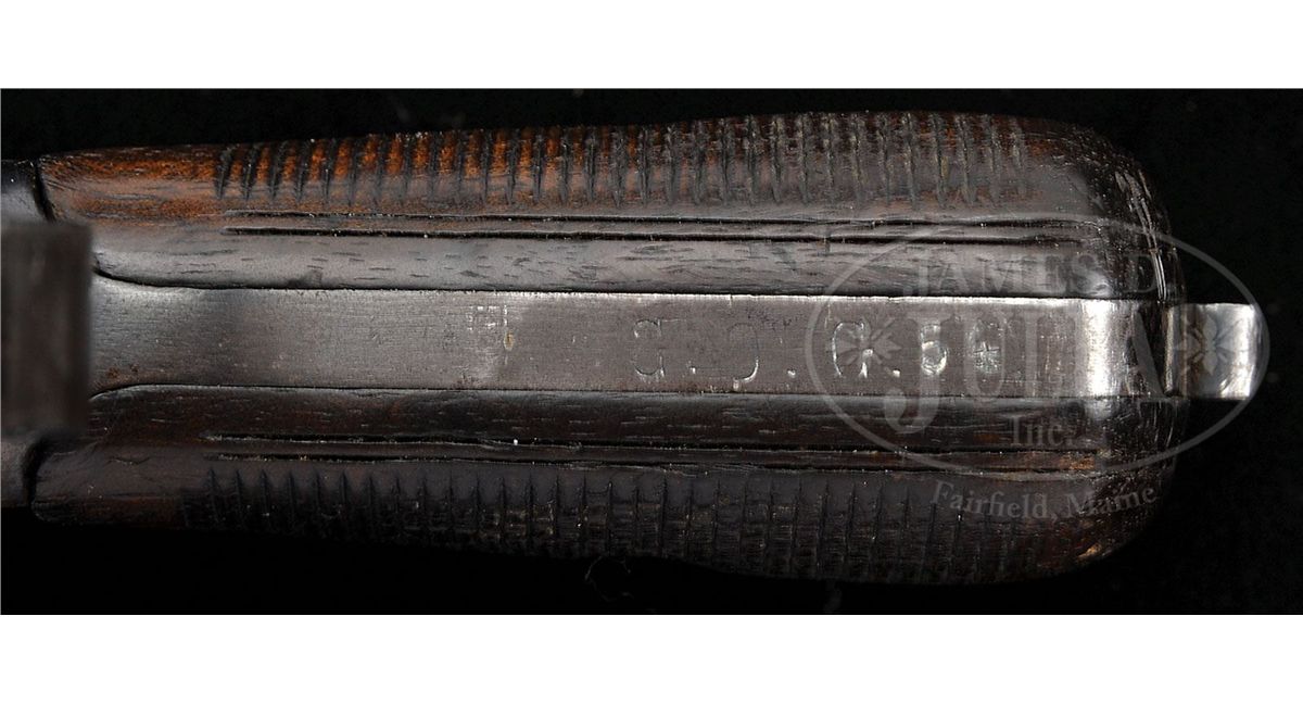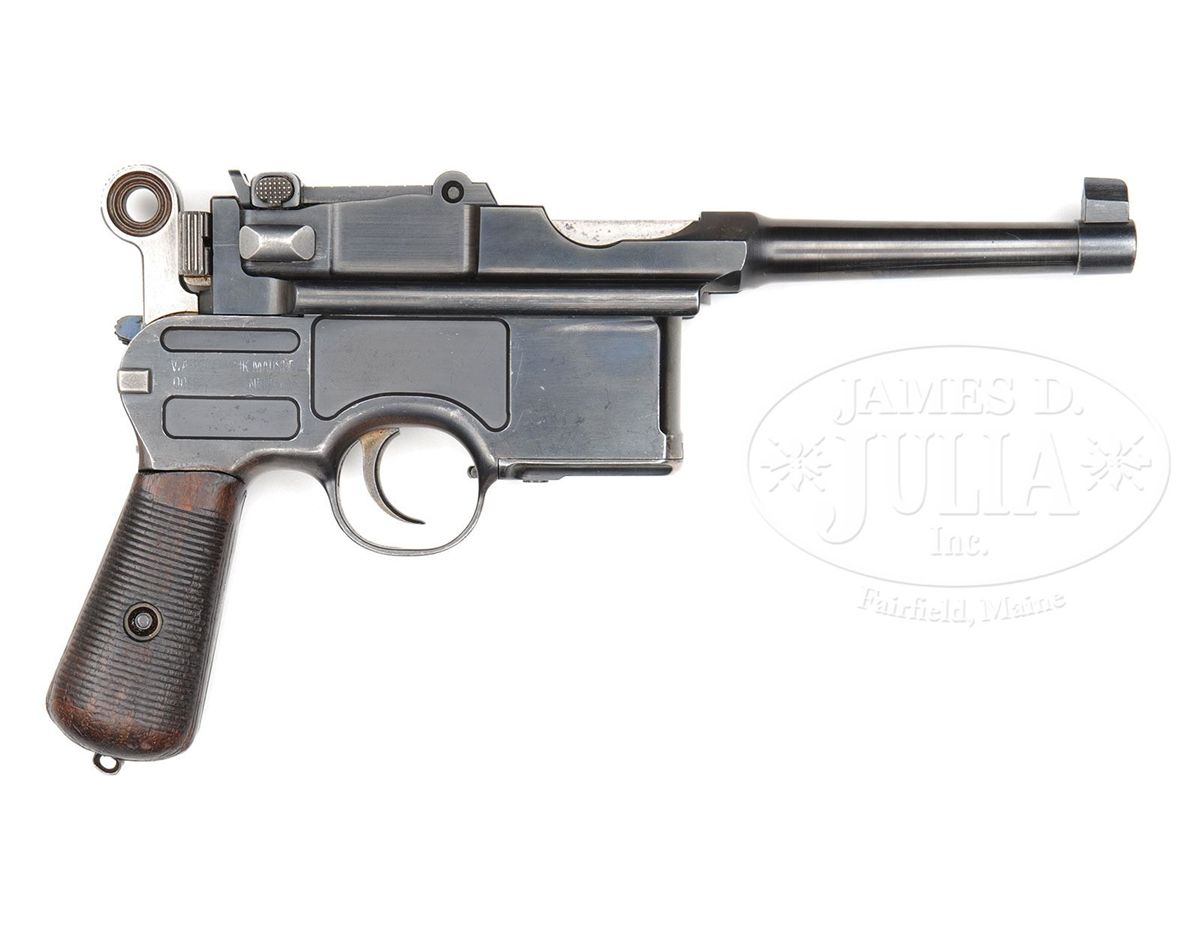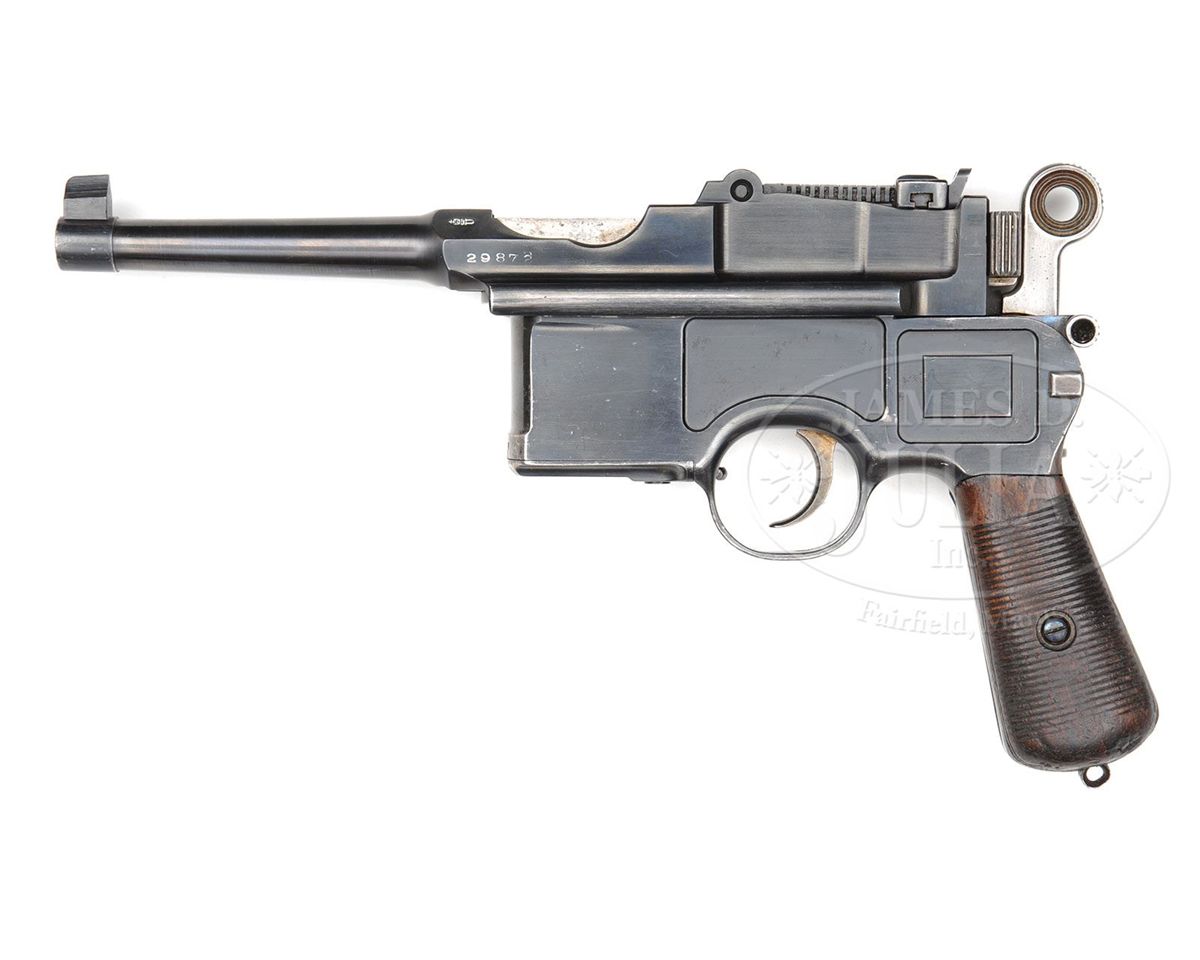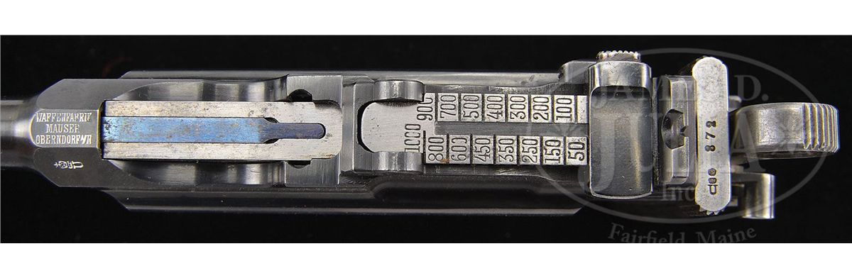 SN 29872. 7.63mm Caliber. Very unusual six shot reworked by Mauser in the 1930s with a 4" bbl and 50-1000 slip-in rear sight. Crown U proofed on the left side of the chamber flat. Full serial number on the left side of the bbl extension. No proofing on the right side. Two lug firing pin. Standard two line address on the right side of the frame that is slotted for a shoulder stock. The gun reflects an interesting mixture of early and late features in that it has the early long extractor and large ring hammer but a later bbl extension with sold rails as typical for M1930 Commercials. Matching numbers except for the hammer, subframe and locking lever that are separately matched to #29908. This gun was originally used by the Oldenburg Police as reflected by the "G.O.G. 54." marking on the frontstrap and specifically mentioned in Don Maus' book History Writ in Steel: German Police Markings 1900-1936, Page 247.. PROVENANCE: Collection of Joseph J. Schroeder. CONDITION: Bright 95% salt blue finish as reworked by Mauser in the 1930s. Comparable condition extractor and safety. The sight assembly and bolt stop are salt blue while the trigger has much of its original straw. Mirror bore with sharp rifling. Perfect mechanics. Extremely unusual six shot reflecting the "old and new" in addition to use by the German Weimar era police. 4-48564 LMA5