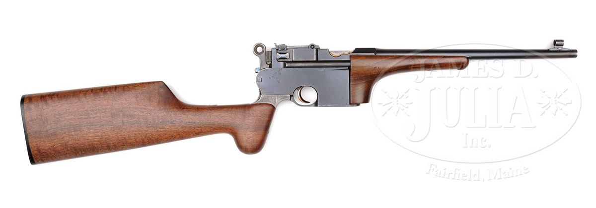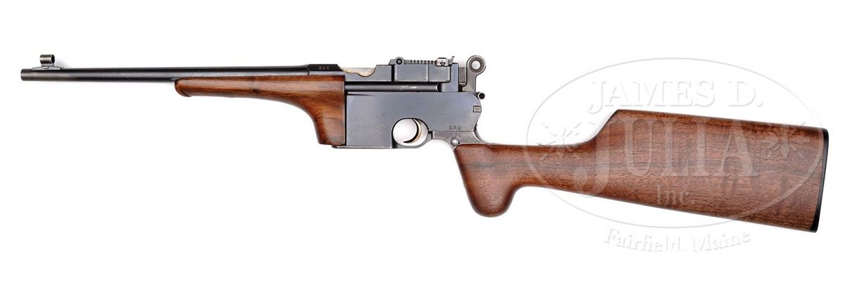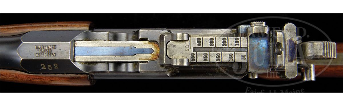 SN 252. Caliber 7.63mm. Mauser made approximately 200 Large Ring Flatside carbines. This example has a 12" bbl with a hooded, drift adjustable bead front sight and a slip-in 50-500 rear sight. The elongated chamber is marked with the Mauser address while the serial number 252 is on the left chamber flat. Right side of the frame is unmarked while the serial number is repeated on the left side of the frame and on the left side of the stock iron at their juncture. The #252 is additionally marked under the rear sight bar, on the bolt stop, on the firing pin retainer, and the back of the hammer. No disassembly was affected to check the internal details. The extractor, cursor, bolt stop, firing pin retainer, and safety were fire blued while the trigger was very lightly strawed. Neither the forend nor the buttstock had attaching swing swivels. The buttplate is an original Mauser with an intertwined "MW". Sold in the same carrying case that was used by Joseph Schroeder to transport this carbine for display. This black plastic case measures 18.5" x 19.5" x 5", has two non-lockable brass latches, steel reinforced corners, and a foam interior. PROVENANCE: Joseph J. Schroeder, Jr. Collection. CONDITION: Original blue with early toning. Touch up cold blue was addressed to the front of the bbl, the first 2-3", as reflected by the gray tone under bright illumination. Scattered pin points of oxidation of each side of the frame that is more pronounced on the floorplate. The fire blue on the extractor, cursor, firing pin retainer, and safety are in keeping with the overall appearance of the gun. The bolt stop has been re-fire blued with shallow pitting under the finish. Most of the metallic blue on the stock lug has faded to a brown-gray. Both the forend and buttstock have been lightly sanded and refinished. There is slight marring of the two screws used to secure the lug to the buttstock. Excellent condition buttplate. Very good bore with easily discernible rifling amidst mild corrosion. Perfect mechanics. Although the bbl is thinned at the muzzle and the wood furniture refinished, this is a very presentable, desirable, and mechanically perfect Flatside, scarce under any circumstance. 4-48545 LMA43