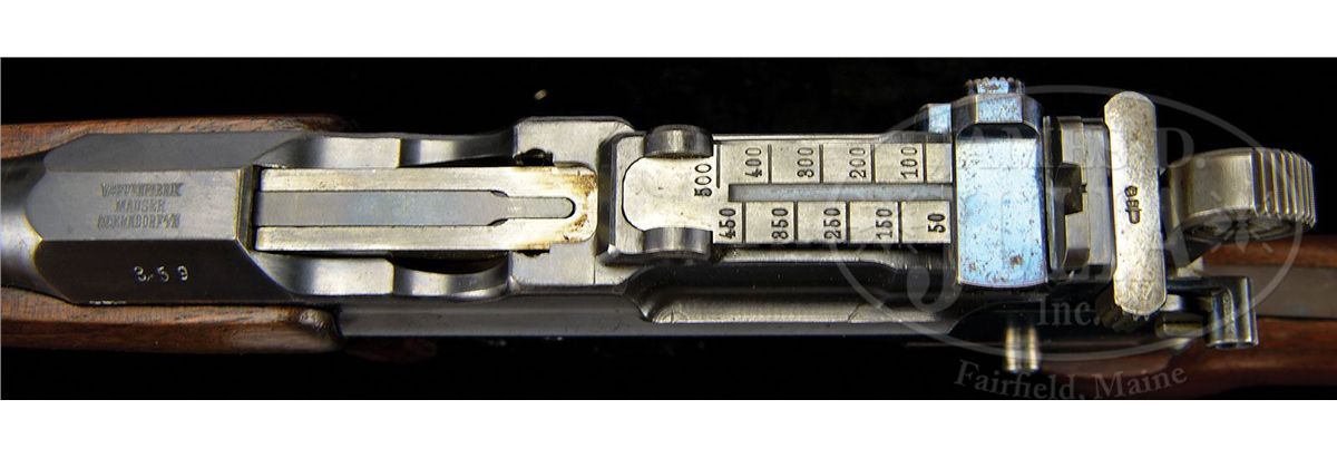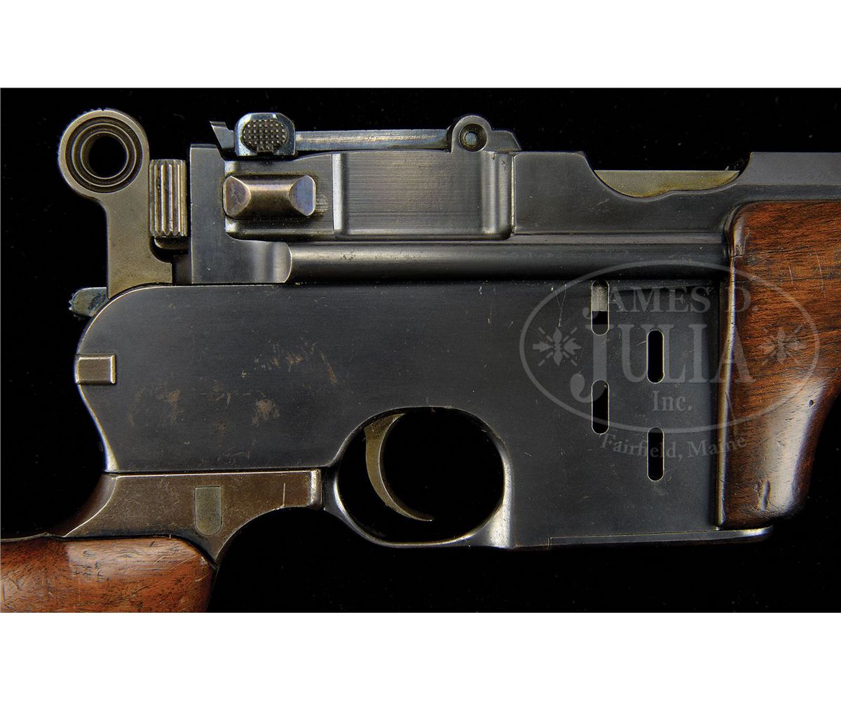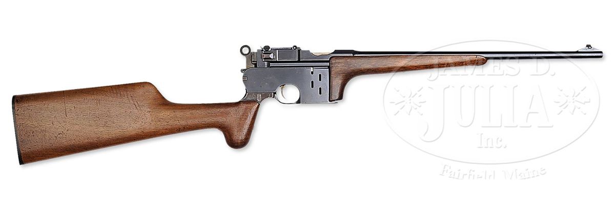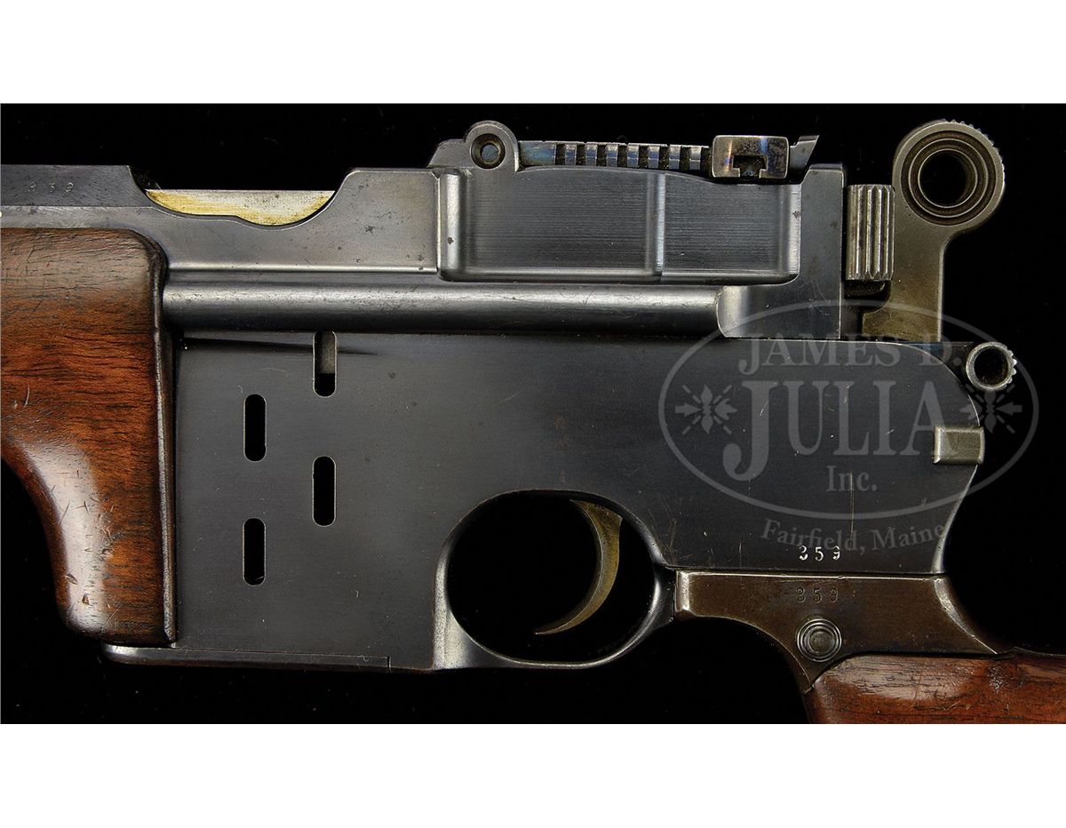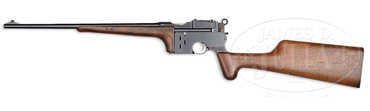 SN 359. Caliber 7.63mm. This Large Ring Flatside Carbine has a screwed in 16" bbl with a dovetailed front bead and a slip-in 50-500 rear sight. Normally, Mauser carbines did not have screwed in bbls; this example may have been a special order or rework. The top of the elongated chamber is marked with the usual Mauser address. The serial number 359 is on the left chamber flat and the Crown U marking is on the left side of the bbl extension where exposed over the wooden forend. Typical solid rails on the bbl extension. Transitional bolt with a long extractor (whose surface has been reworked or is a replacement) and a single lug firing pin. The frame is unmarked but fenestrated with four vertical slots on each side to act as a cartridge indicator. The serial number 359 is repeated on the left side of the frame and on the stock lug on either side of their juncture. Other components that are externally marked 359 include the sight bar, bolt stop, the back of the bolt, back of the hammer, and the back of the subframe. Detailed disassembly to check the internal components was not effected. The forend is 9-3/8" long and the full length buttstock has an original Mauser buttplate with the MW logo. There are no swing swivels. PROVENANCE: Joseph J. Schroeder, Jr. Collection. CONDITION: A strong and bright 98% original rust blue. There is only a minimal color gradient/differential at the point of bbl juncture into the receiver. Most of the metallic blue from the stock lug has faded to a mellow brown. Attaching screws are still nicely slotted. Original fire blue on the sight cursor, bolt and safety is in commensurate condition as is the original straw on the trigger. Forend and buttstock retain most of their original thick varnish with a scattering of handling nicks and dents. Bright bore with easily discernible rifling and only mild corrosion. Perfect mechanics. This is a very unusual carbine whose screwed in bbl invites speculation, while the slotted receiver, pictured in Mauser's literature, reflected an unsuccessful attempt to provide a cartridge indicator. Very few examples remain as testimony to this effort. An extremely thought provoking gun, it invariably graced Joseph J. Schroeder's Mauser displays. 4-48546 LMA44