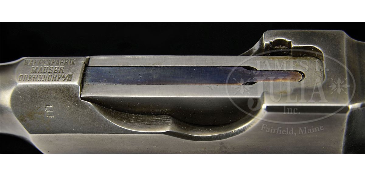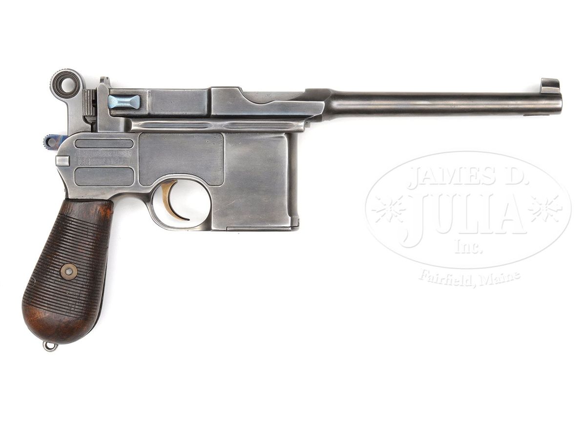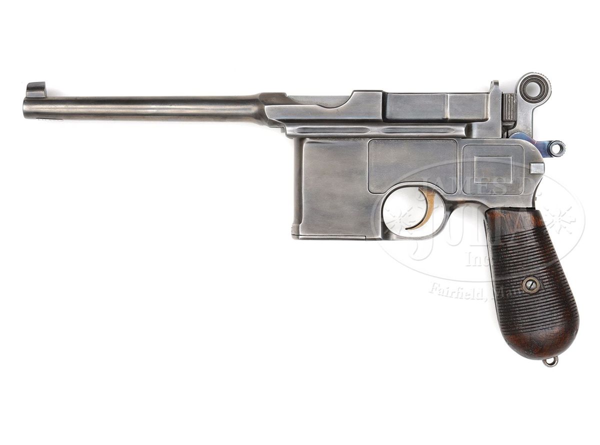 SN E/48012. Caliber 7.63mm. Large Ring Hammer pistol with 5.5” bbl and fixed rear sight. Usual chamber address. No external serial numbers and no proof marks indicating this to be an in-house test gun, not intended for sale. “E” marked on left chamber flat in usual serial number location; no marking on right side. Long extractor fitted to later bolt with 2-lug firing pin. Later form safety that is rotated up to engage. The letter “E” is repeated on the back of the hammer, subframe, locking lever and on the back of the frame just below the locking lever this being one of a range of experimental C96 pistols with letter rather than numerical serial numbers. Small parts generally fire blued except strawed trigger. Finely serrated grips. PROVENANCE: Collection of Dr. Geoffrey Sturgess. CONDITION: Traces of cold blue over buffed surface with no original finish. “E” marking was added after the surface reworking. Extractor has been re-heat treated. There is no fire blue on the bolt stop that appears uniformly grey. Non-factory replaced firing pin. Dark, oiled grips with bruises and scattered nicks. An unusual Large Ring pistol, with a transitional bolt and later safety, whose developmental features should interest every C96 collector. 4-53017