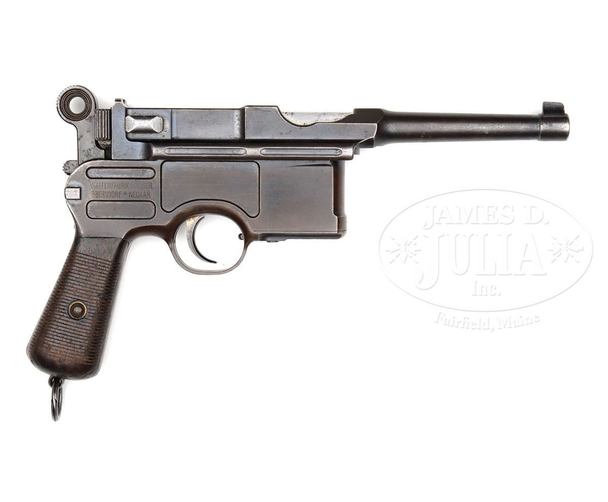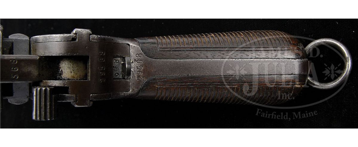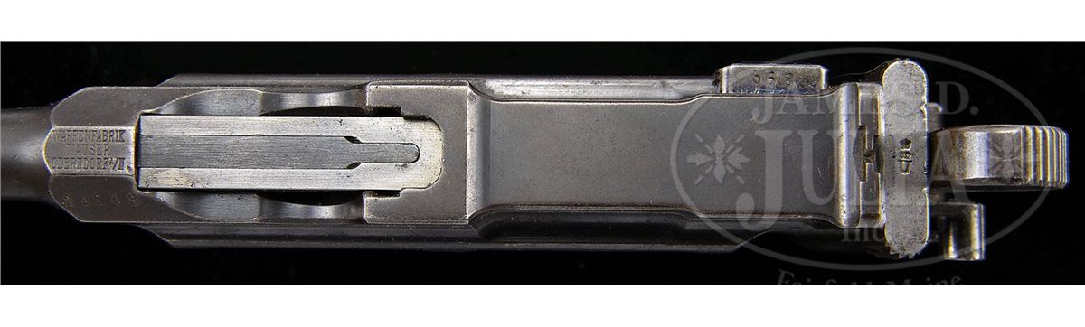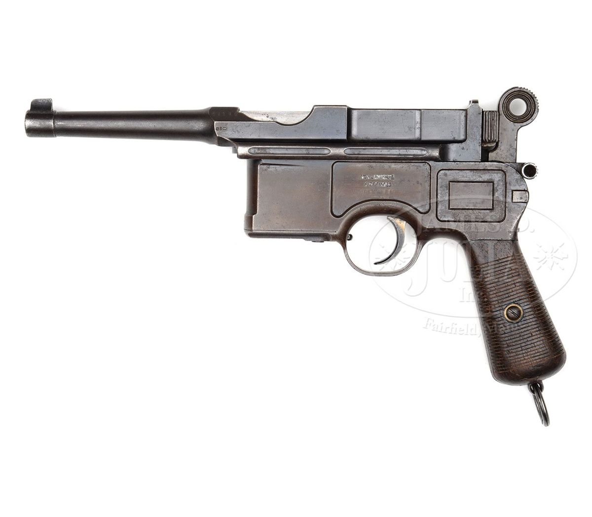 SN 29568. Caliber 7.63mm. Very unusual Large Ring six shot with 4" bbl and fixed rear sight. Crown U marked on the left side of the chamber flat and antler proofed on the right side. Long extractor and large ring hammer. Single lug firing pin. Standard two-line address on the right side of the frame. Imported by Von Lengerke & Detmold as marked on the right side of the frame. Thin backstrap which was never slotted for a stock. Small parts fire blued with a strawed trigger. Standard walnut grips. All matching numbers on disassembly. PROVENANCE: Joseph J. Schroeder, Jr. Collection. CONDITION: Original condition with moderate oxidation. Brown toning of most of the bbl and frame with light pitting of the left frame around the rearmost recessed panel. Fire blue has largely faded from the extractor and bolt stop and most of the straw has faded from the trigger. Generally bright bore with shallow rifling. Perfect mechanics. One of the more unusual Large Ring six shots that was never slotted for a shoulder stock. 4-48563 LMA4