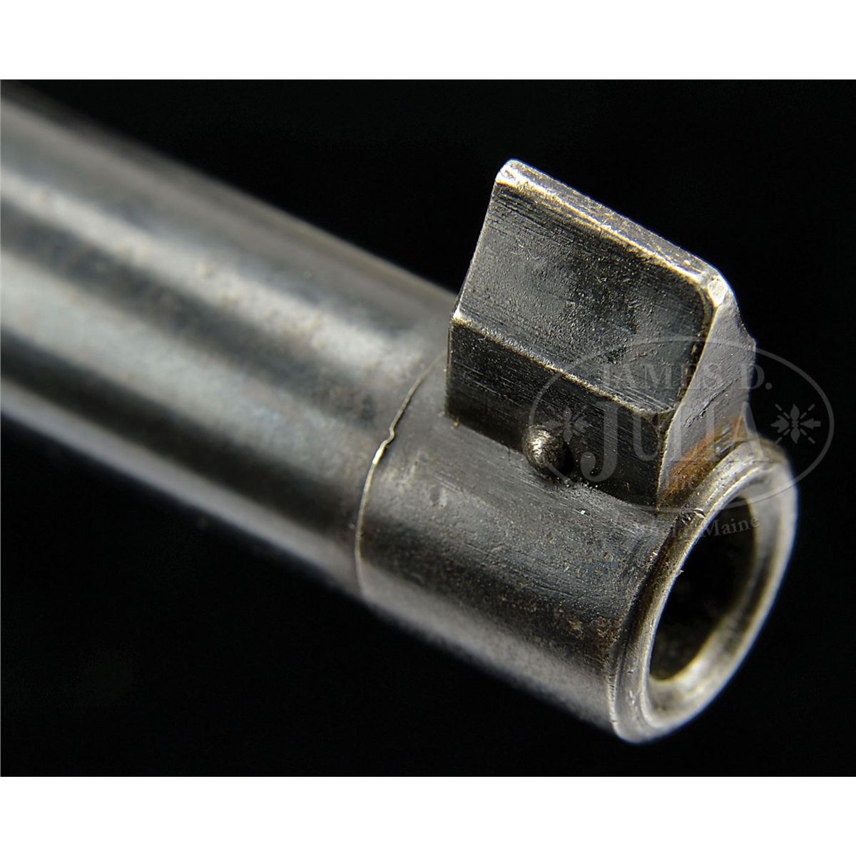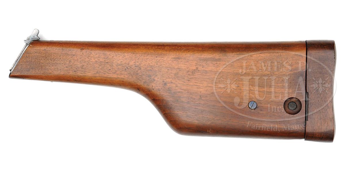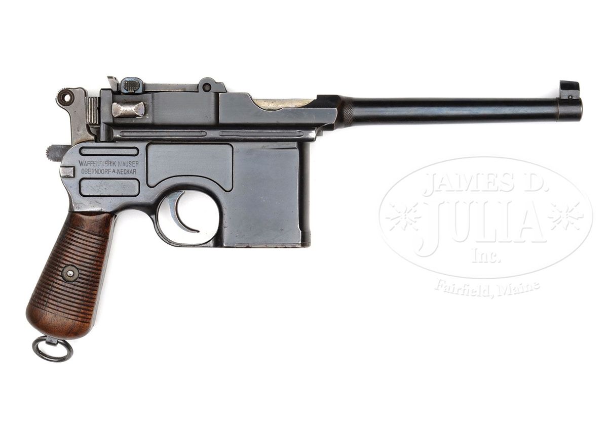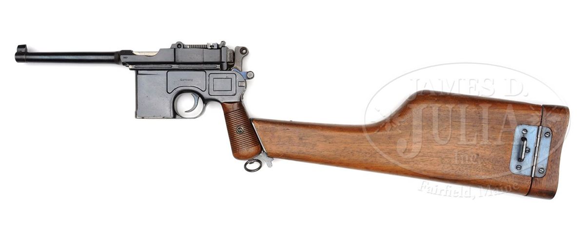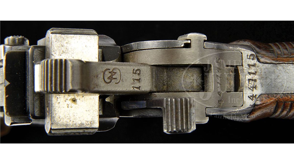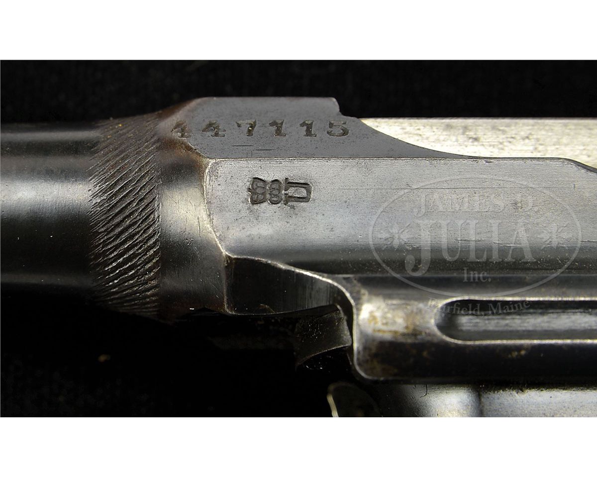 SN 447115. Caliber 7.63mm. One of a small group of factory rebarreled small ring Bolos in the 445,000-448,000 serial range which have a 5.5” barrel screwed onto an existing barrel extension. The juncture was hidden by knurling (“hash marks”) before finish. The front sight/barrel band was sleeved onto the barrel and pinned in place. As a later revision, the barrel assembly often appears darker than the frame. Standard chamber address with Crown-U on left side of bbl extension. No marks on right side. Standard slip-in 50-1000 rear sight. Short extractor and late NS marked hammer. Left side of frame marked “Germany.” Two line address on right side of frame. Small parts including trigger are heat treated to a fire blue. All visible numbers match. Wood grips with serrations. Original lanyard ring. Accompanied by original stock with looped hinge and unnumbered lug. PROVENANCE: Collection of Dr. Geoffrey Sturgess. CONDITION: Fine. 90%-95% original blue with areas of fading and sharp edge wear. Comparable condition fire blued small parts and wood grips. Bright bore and perfect mechanics. Near excellent Mauser stock with minor handling dings. Fire blue from lug is faded with no effort to enhance. One of the more unusual Postwar Bolos whose hash marked barrel reflects a true factory rework. 4-53031