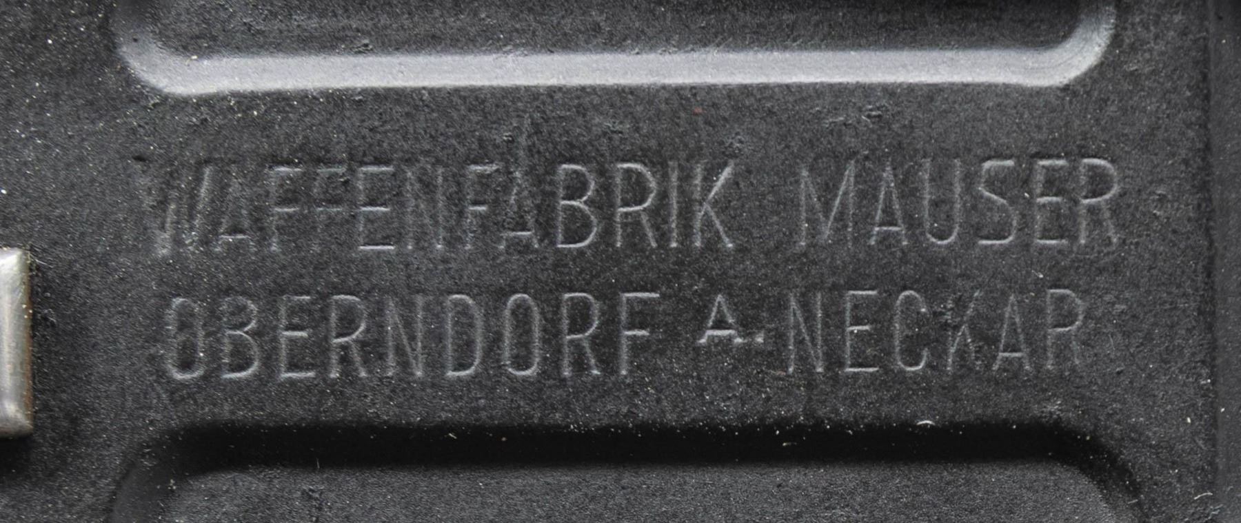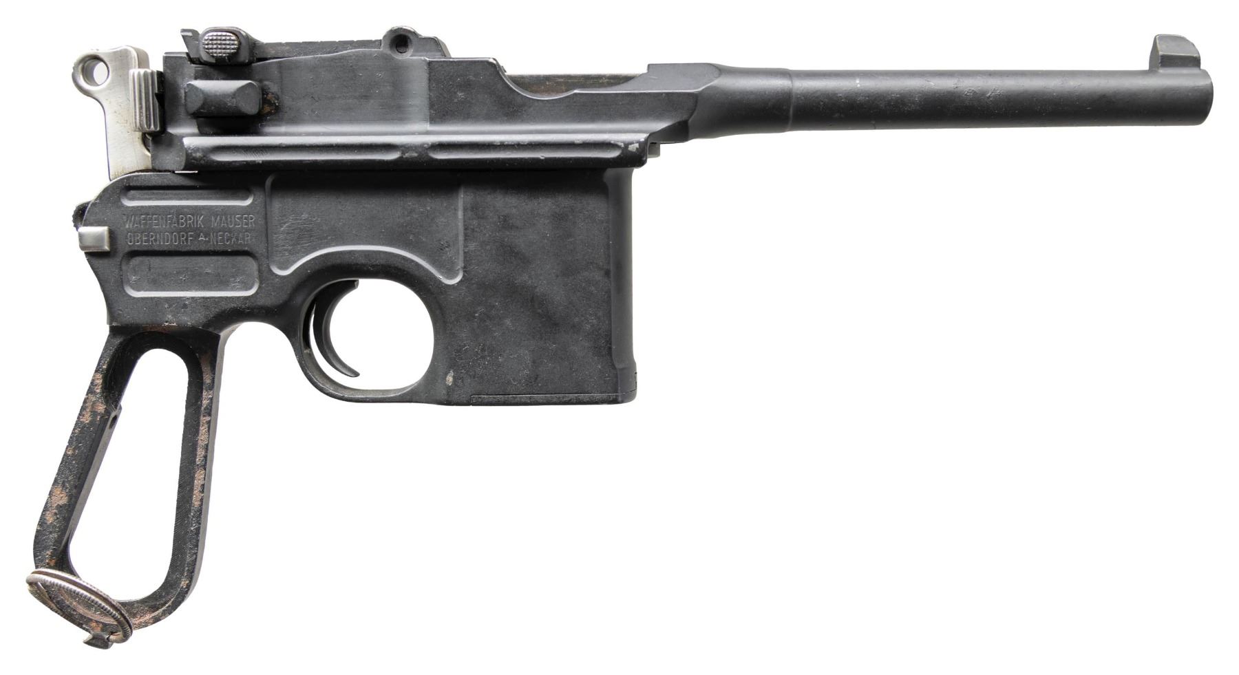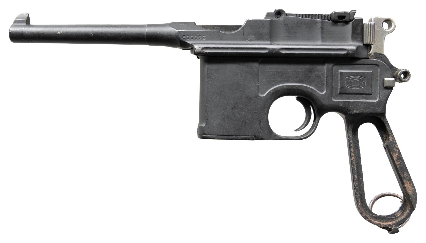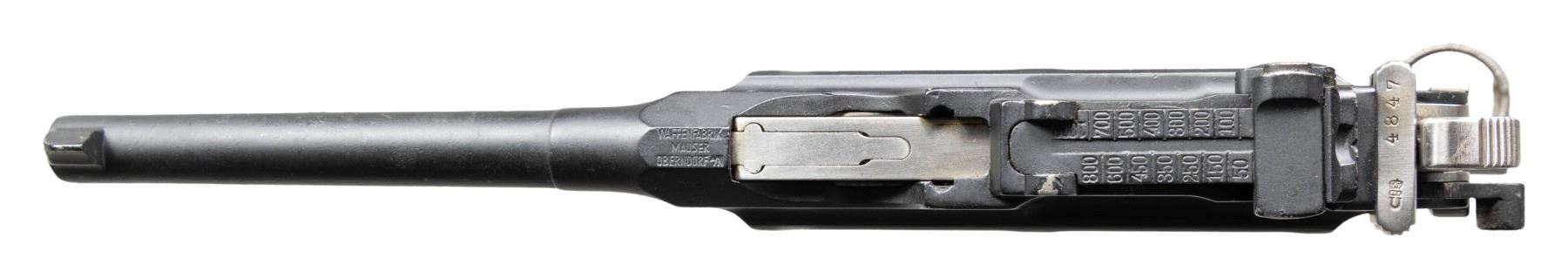 PISTOL. Cal. 7.63mm. S# 800073. Bbl. 5 1/4". C96 Model 1930 Commercial semi-automatic pistol mfg. by Mauser. Top flat of the faceted breech is marked with Mauser's 3-line address, with a double crowned "U" commercial proof marked on the left quarter flat, and the S# on the left flat. Underside of bbl. is Century Arms import marked. Left side of frame is marked with the Mauser banner logo on the milled island, with "WAFFENFABRIK MAUSER/ OBERNDORF A. NECKAR" marked on the right. Metal components exhibit a dull black enamel type finish overall, with the bolt and hammer having been polished in-the-white. Grips are absent. Standard fixed blade front sight with tangent V-notch rear sight graduated 50-1000. Matching numbers are present on the bbl./bbl. extension, frame (interior), sub-frame body, and floorplate. Bolt, follower, sear, and bolt stop housing are mismatched. Locking block is unnumbered. CONDITION: metal components retain the majority of their reapplied dull black enamel finish, showing scattered spots of wear and minor flaking, as well as scattered spots of bubbling and pitting beneath the finish overall. Bore exhibits consistent mild to moderate pitting, while retaining worn rifling throughout. Poor manual mechanics due to poor fitting of non-matching parts. (25-2694/MLW). CURIO. $200-300.