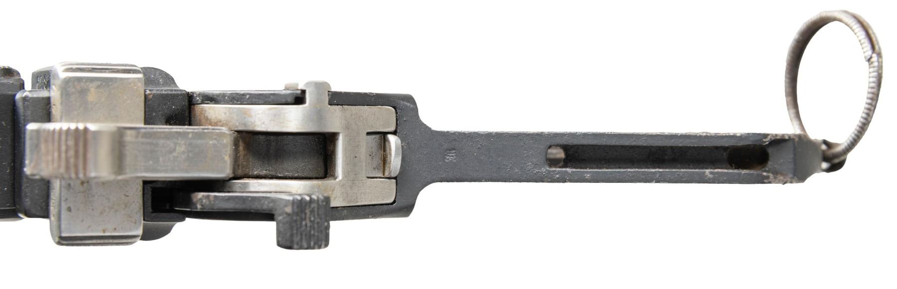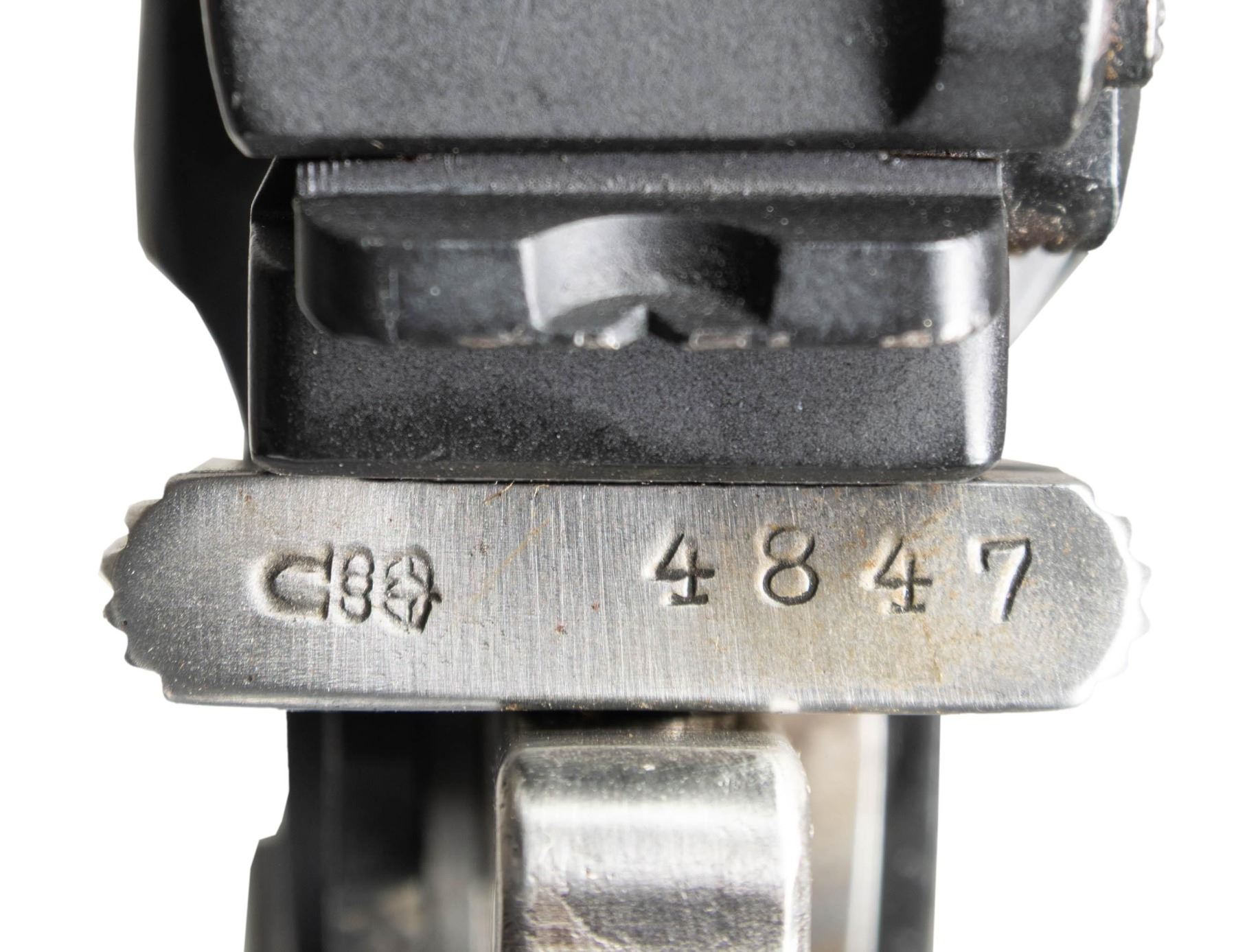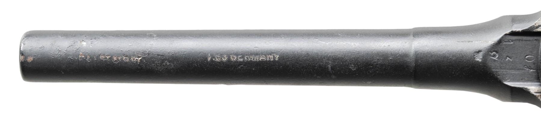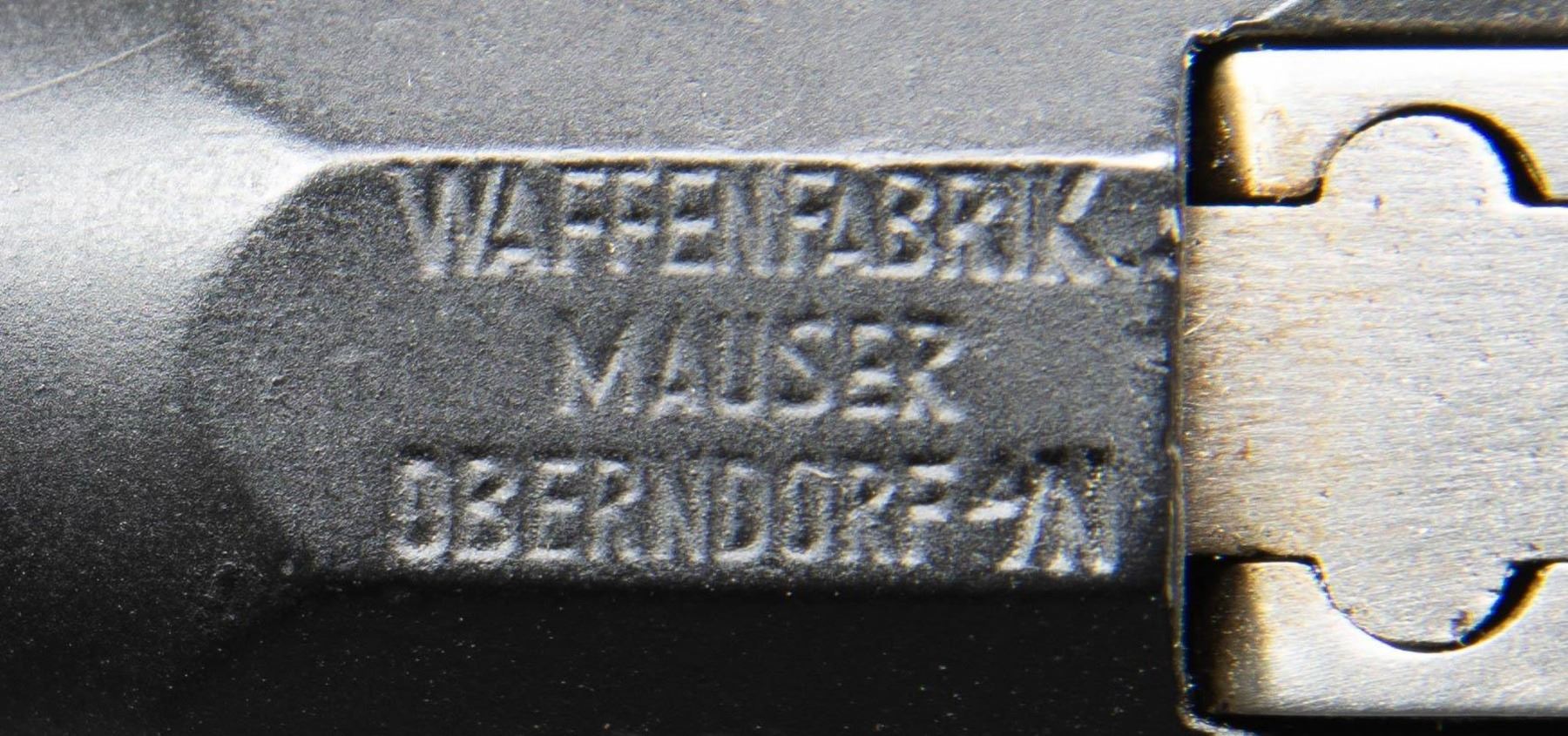 PISTOL. Cal. 7.63mm. S# 800073. Bbl. 5 1/4". C96 Model 1930 Commercial semi-automatic pistol mfg. by Mauser. Top flat of the faceted breech is marked with Mauser's 3-line address, with a double crowned "U" commercial proof marked on the left quarter flat, and the S# on the left flat. Underside of bbl. is Century Arms import marked. Left side of frame is marked with the Mauser banner logo on the milled island, with "WAFFENFABRIK MAUSER/ OBERNDORF A. NECKAR" marked on the right. Metal components exhibit a dull black enamel type finish overall, with the bolt and hammer having been polished in-the-white. Grips are absent. Standard fixed blade front sight with tangent V-notch rear sight graduated 50-1000. Matching numbers are present on the bbl./bbl. extension, frame (interior), sub-frame body, and floorplate. Bolt, follower, sear, and bolt stop housing are mismatched. Locking block is unnumbered. CONDITION: metal components retain the majority of their reapplied dull black enamel finish, showing scattered spots of wear and minor flaking, as well as scattered spots of bubbling and pitting beneath the finish overall. Bore exhibits consistent mild to moderate pitting, while retaining worn rifling throughout. Poor manual mechanics due to poor fitting of non-matching parts. (25-2694/MLW). CURIO. $200-300.