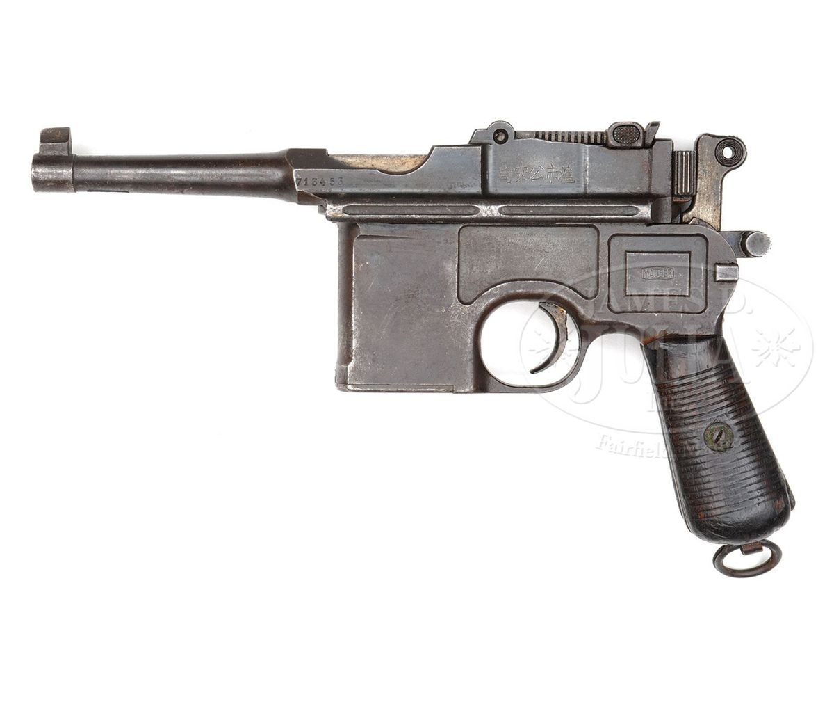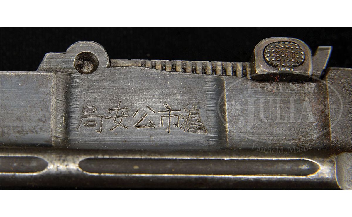SN 713453. Caliber 7.63mm. Standard Mauser Banner Bolo with 4” barrel and slip-in 50-1000 rear sight. Usual chamber address with Crown-U marking on left chamber flat. Full serial number on left side of barrel extension. The Shanghai Police markings were hand applied, on the left side of the bbl extension, below the rear sight. There are no markings on the right side. Short extractor, two-lug firing pin, and NS-marked hammer. The small, Mauser banner logo appears on the left side of the frame, in the rear panel. The right side of the frame has the usual two-line Mauser address. All visible numbers are matching. Correct wood serrated grips. Lanyard ring. PROVENANCE: Collection of Dr. Geoffrey Sturgess. CONDITION: About good. 40% blue, largely transitioning to a brown gun, in typical condition as returned from China. Bore shows hard use as do the dark, oil soaked grips with dents and minor losses. Although the Postwar Mauser Banner Bolo is a common variation, relatively few were marked by the Shanghai Police. 4-53032