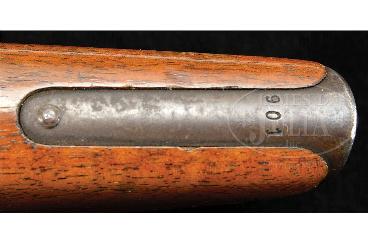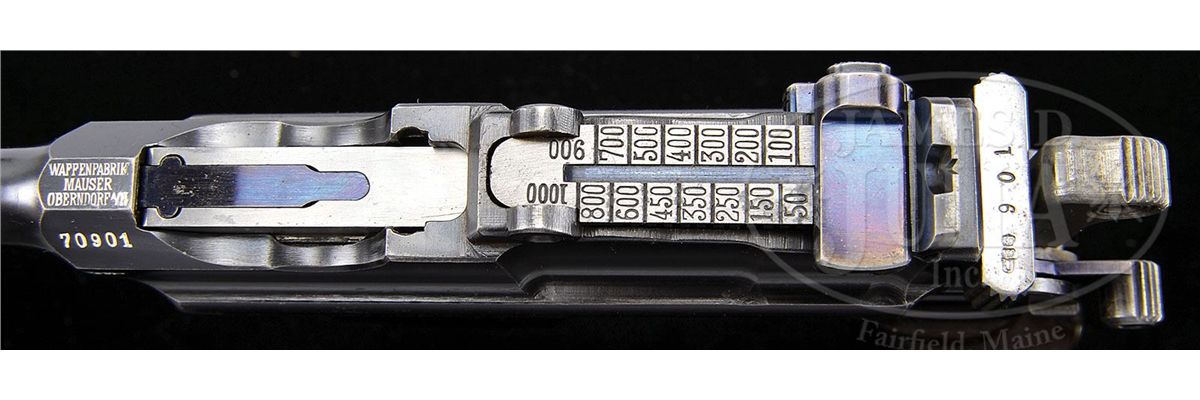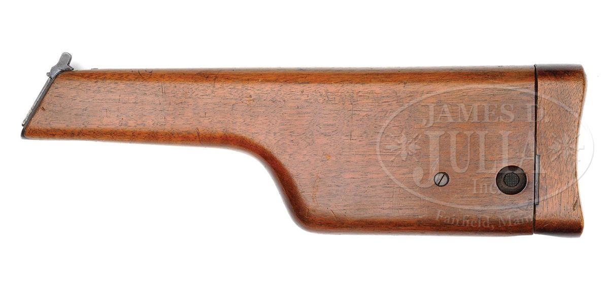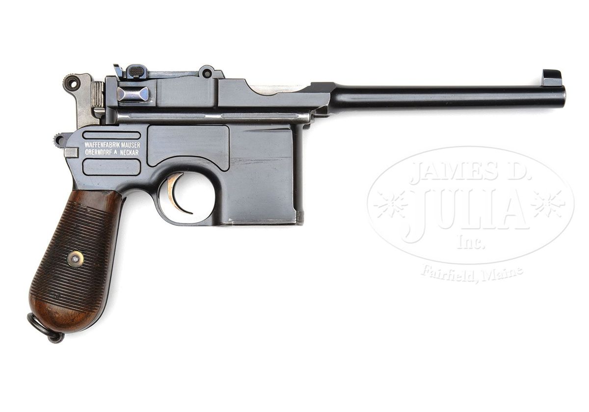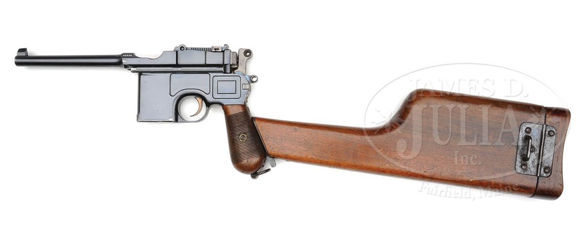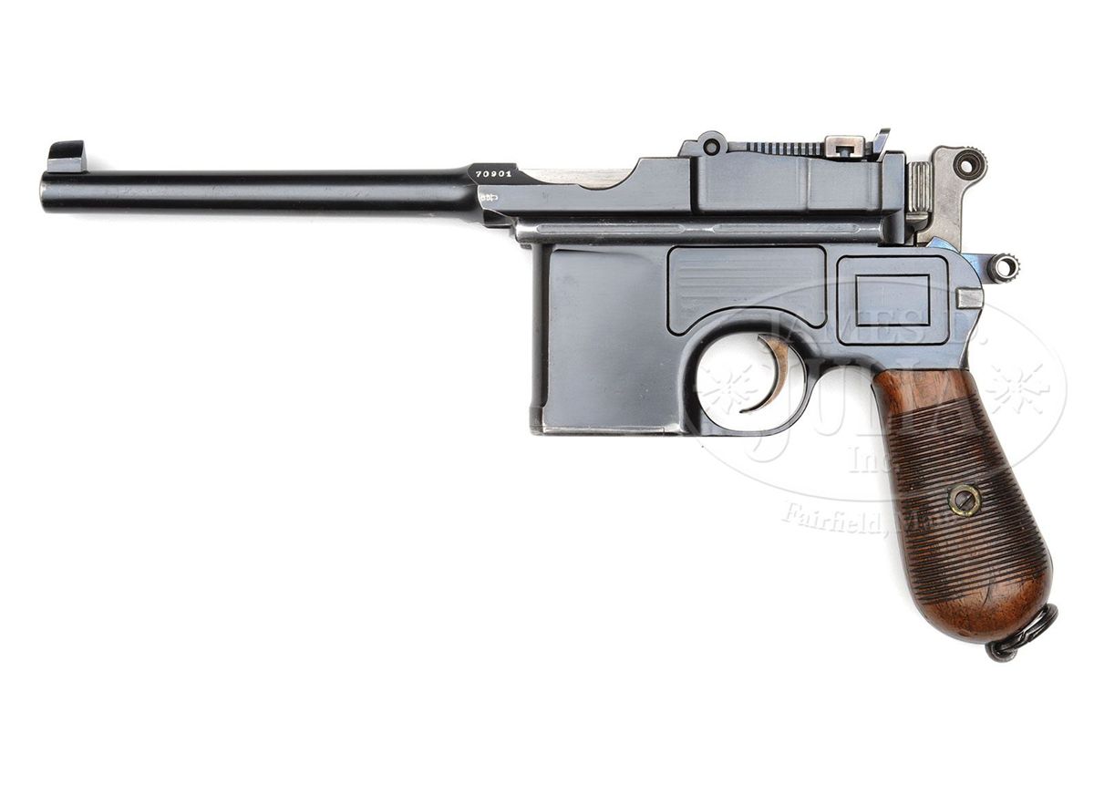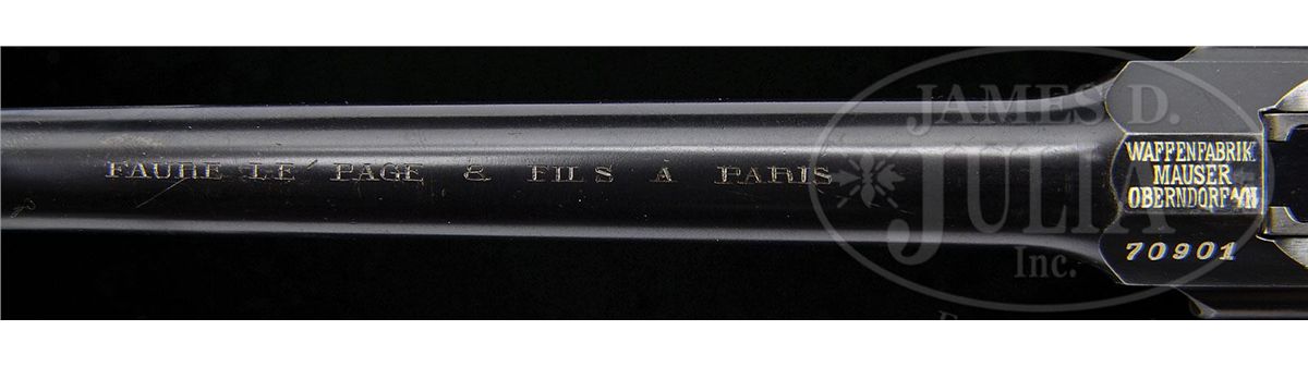 SN 70901. Caliber 7.63mm. Standard Pre-war Commercial with 5.5" bbl and 50-1000 rear sight. Usual chamber marking with full serial number on left side of chamber flat. Crown U on left side of bbl extension. No marking on the right side. Usual two line address on the right side of the frame and standard grooved walnut grips. The gun is remarkable in having the French retailer address "FAURE LE PAGE & FILS A PARIS" marked on top of the bbl. This mid-production example has fire blued small parts but still has the strawed trigger. All matching numbers on disassembly including the grips that have been stamped with the last three digits of the serial number. Original lanyard ring. Mirror-bright bore and perfect mechanics. Complete with a standard length all original stock whose matching lug is numbered 901. There have been no modifications inside the lid. PROVENANCE: Joseph J. Schroeder, Jr. Collection. CONDITION: Original bright blue estimated at 95-97% with most wear under the bbl and in front of the magazine well where in contact with the stock. Front and backstraps have largely faded to a brown patina from handling. Condition of the untouched fire blued small parts and the strawed trigger is in keeping with the presentation of the pistol. Grips have original varnish and sharply cut serrations with only minor handling dings. Excellent matching stock with only a few surface dings and no cracks. Lug has largely faded to a gray-brown-blue and scattered spots of patina are on the looped hinge. Overall, an excellent and all matching, no excuse, Pre-war Commercial with an interesting historic association conferred by the bbl inscription. 4-48574 LMA19