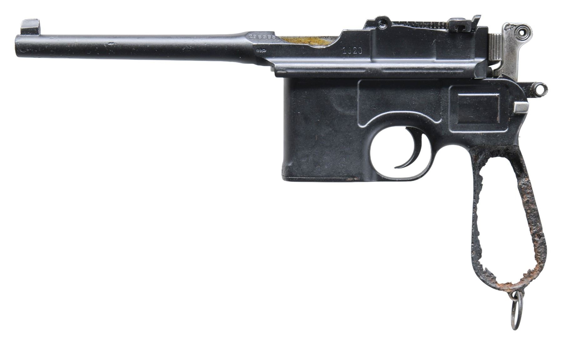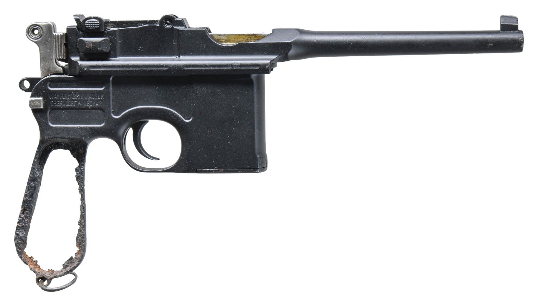 DATED UPPER. Cal. 7.63mm. S# 84136. Bbl. 5 1/2". C96 semi-automatic pistol mfg. by Mauser. The top flat of the faceted breech is marked with Mauser's 3-line address, with the S# marked on the left quarter flat, and a double crowned "U" commercial proof on the left flat, followed by a "1920" Treaty of Versailles stamp. Underside of bbl. exhibits a partially legible Century Arms import mark. Metal components exhibit a matte black finish overall, save for on the hammer and bolt, which are polished in-the-white. Fixed blade front sight with V-notch tangent rear sight graduated 50-1000. Matching numbers are present on the frame (barely legible), sub-frame assembly, locking block, and floorplate. Bbl./bbl. extension assembly is mis-matched. CONDITION: metal components retain the majority of their matte black finish, exhibiting varying degrees of pitting overall. Grip frame is heavily pitted and is prone to breakage if attempted to be fired. Bore exhibits consistent moderate pitting, while retaining fair rifling throughout. Proper manual mechanics. (25-2695/MLW). CURIO. $100-300.