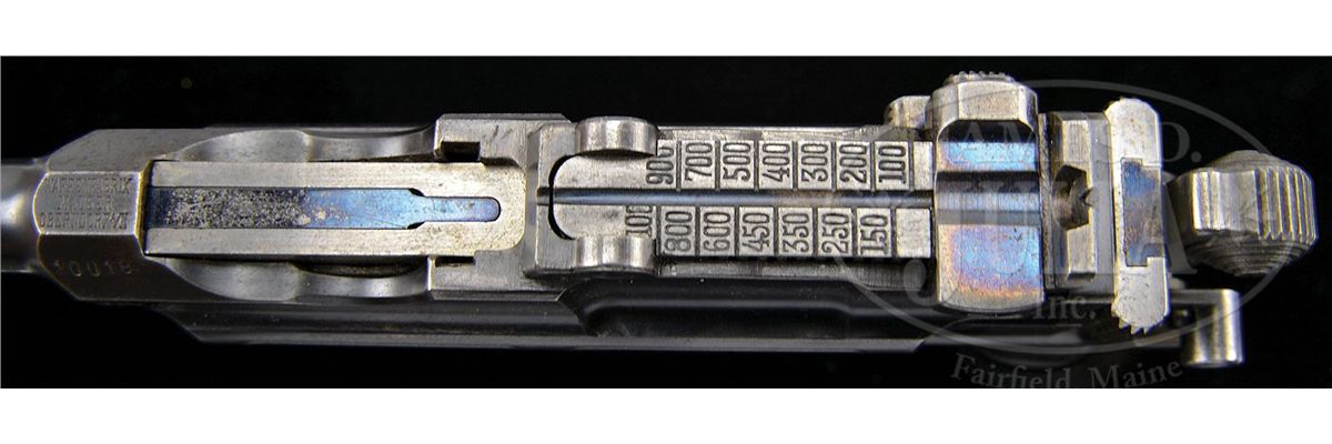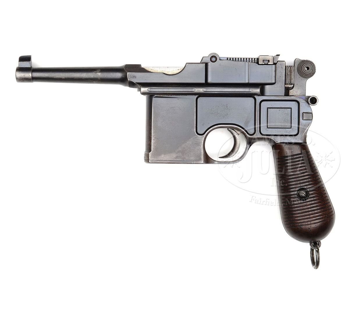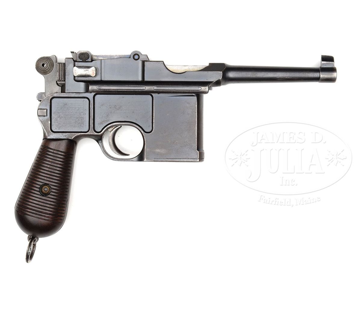SN 10018. Caliber 7.63mm. Late assembled Conehammer with Bolo-type bbl extension, 4" bbl and slip-in 100-1000 rear sight with grooved cursor. Sight bar groove extends throughout its entire length and is carried forward onto the bbl extension lug, as is typical for this late assembly or repaired Conehammer. Only a small number of guns have been noted with these characteristics, the majority having been reblued. Unlike most Conehammers the serial number was placed on the left bbl flat. Smaller Crown/U marking on the left side of the bbl extension. Early bolt with long extractor and separately retained firing pin. Detailed disassembly shows all matching numbers including the grips. PROVENANCE: Joseph J. Schroeder, Jr. Collection. CONDITION: 85-90% original blue with scuffs under the bbl and thinning in front and over each side of the magazine well. Frontstrap is grayed from handling. Original grips sharply grooved. Bright bore with shallow rifling showing oxidation from corrosive ammunition. Perfect mechanics. A very unusual Conehammer in fine original condition that would enhance any collection of early automatic pistols. 4-48557 LMA3