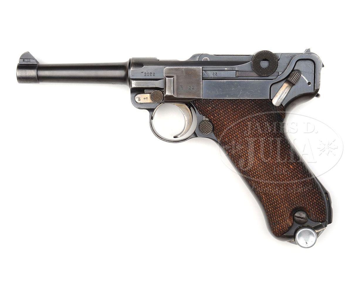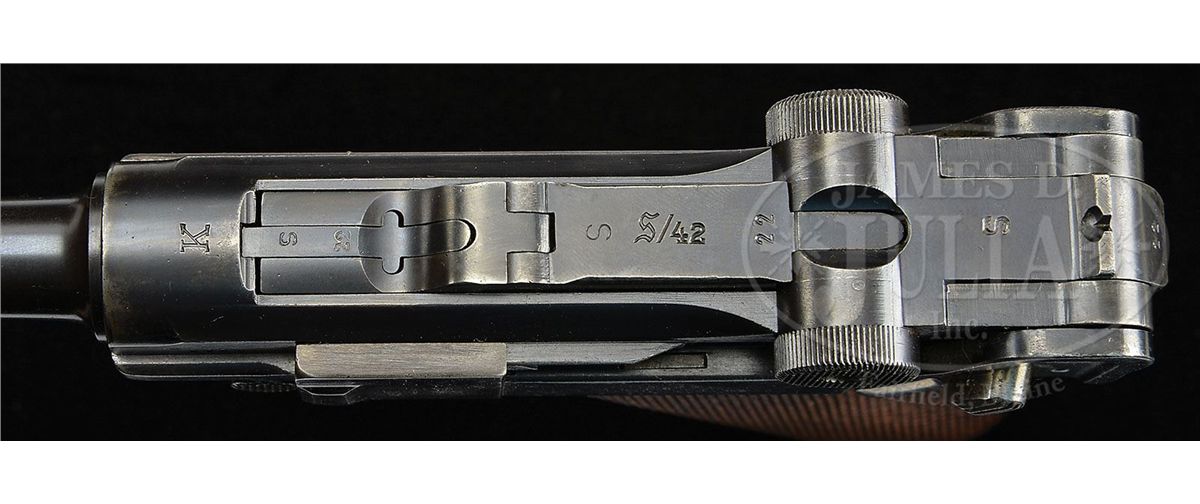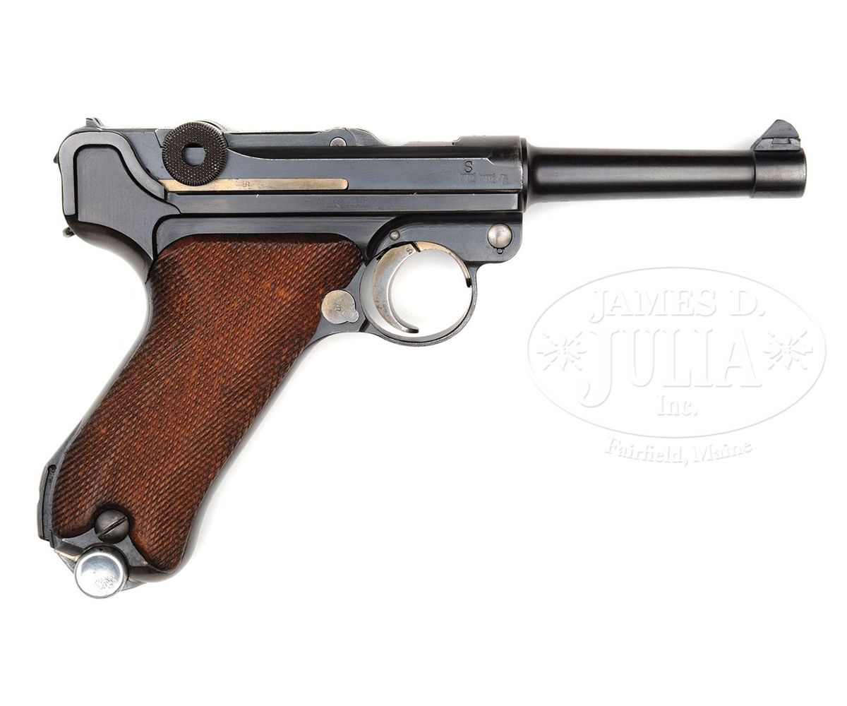 SN 2022. 9mm Parabellum. Early K Date with standard 4" bbl, drift adjustable front sight and fixed rear sight. K marking over chamber and middle toggle marked with scriptic "S/42". Left receiver marked with the serial number that is repeated under the bbl and on the forward frame. The right receiver is marked with a "S" surmounting correct proof marks. Disassembly shows all small parts variously marked with an "S", "S 22" or "22" as correct for this variation, including the grips. Correct magazine with a nickel body and factory matching aluminum base marked "S 2022+". CONDITION: Professional restoration or help has been directed to the bbl that has been polished and reblued. The sideplate has been lightly polished and touched up with cold blue. About 90% original blue remains on the receiver, toggle assembly, and the forward frame and trigger guard. Virtually all the blue has been removed from the front and backstrap that have been polished and artificially toned to a soft gray. About 40% original straw remains on the small parts that seem untouched. The firing pin has been renumbered and the flange of the toggle pin has been turned down and renumbered. A set screw has been inserted to extend through the forward frame, just behind the takedown lever, to act as a trigger stop. Bright bore with strong rifling amidst mild-moderate corrosion. Having a matching magazine is a real plus. 4-47803