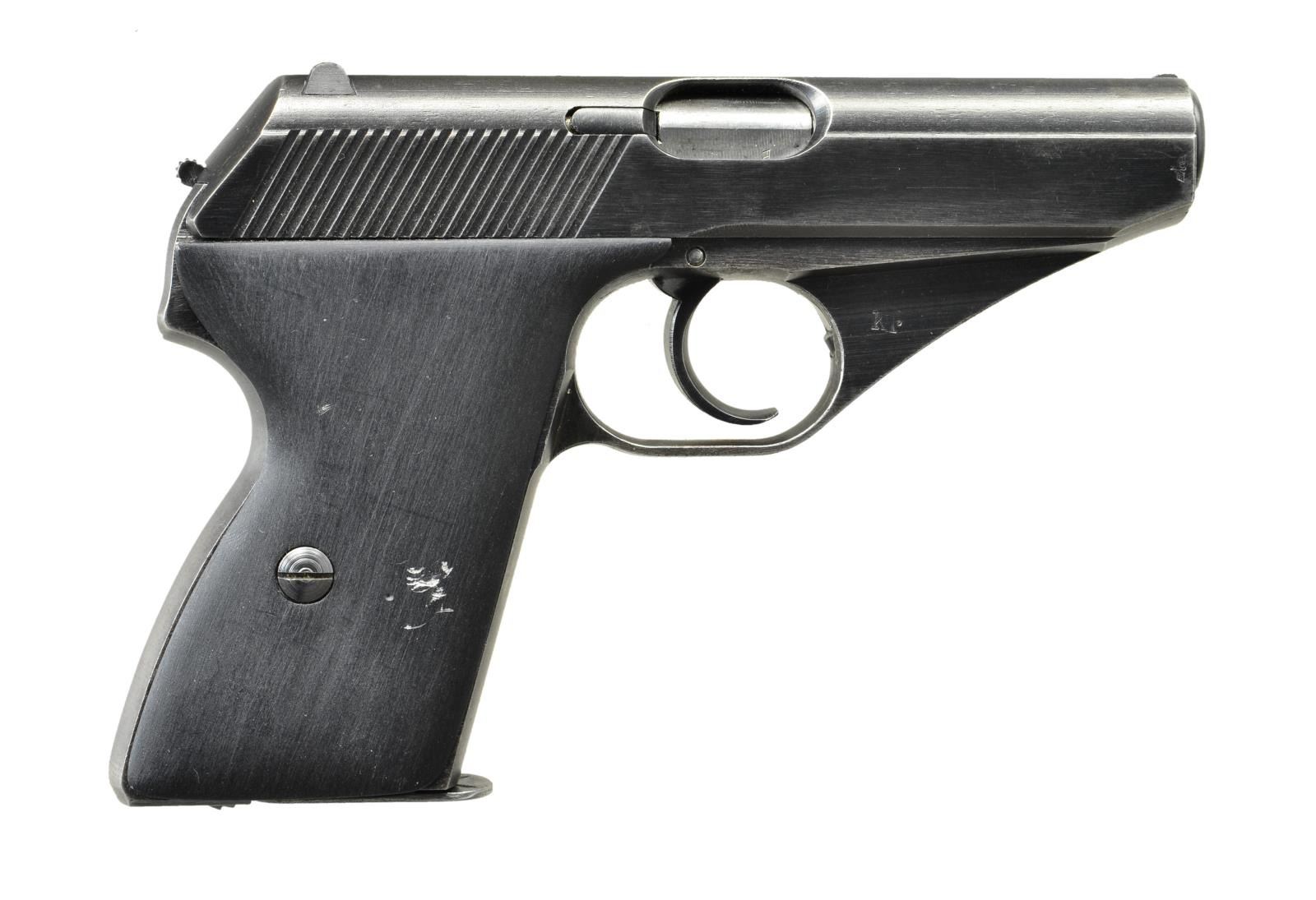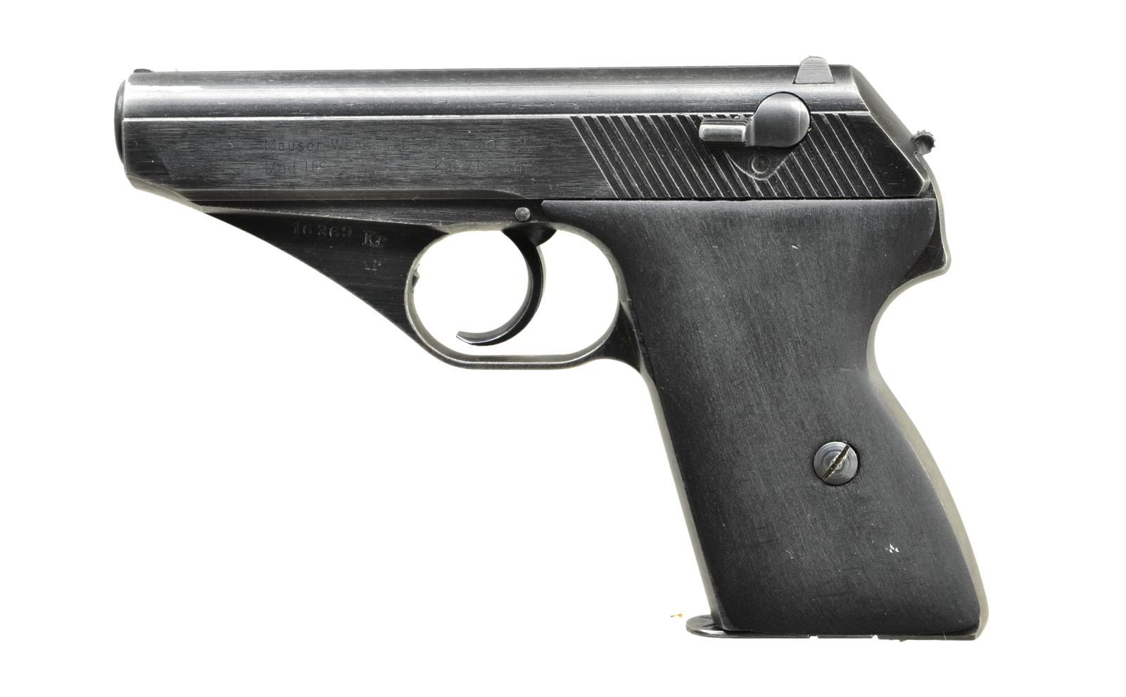 Cal. 7.65mm (32 ACP). S# 16369. Bbl. 3 3/8". Left side of trigger guard has serial number & an unknown "Kr" marking that appears twice. No serial number visible on front strap. Right side of trigger guard also marked "Kr". Front right of slide has eagle over N proof. Left side of slide has Mauser markings w/ Mauser banner logo. This pistol is possibly a postwar rework of some type. Smooth black hardwood grips. MAGS: 1-7 rd. CONDITION: grips show a few handling marks & light dings. Metal retains 60% original blue w/ scattered thinning & fading to gray. Very good bore. (22-3212/MJC). CURIO. $300-550.