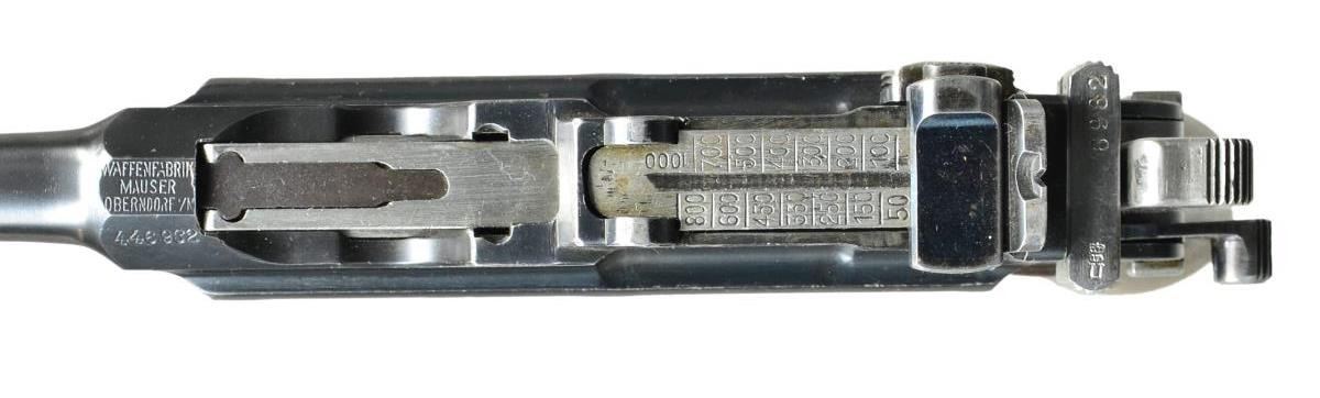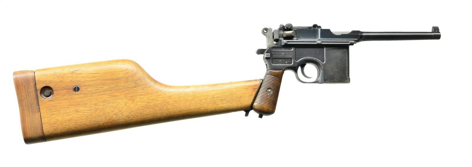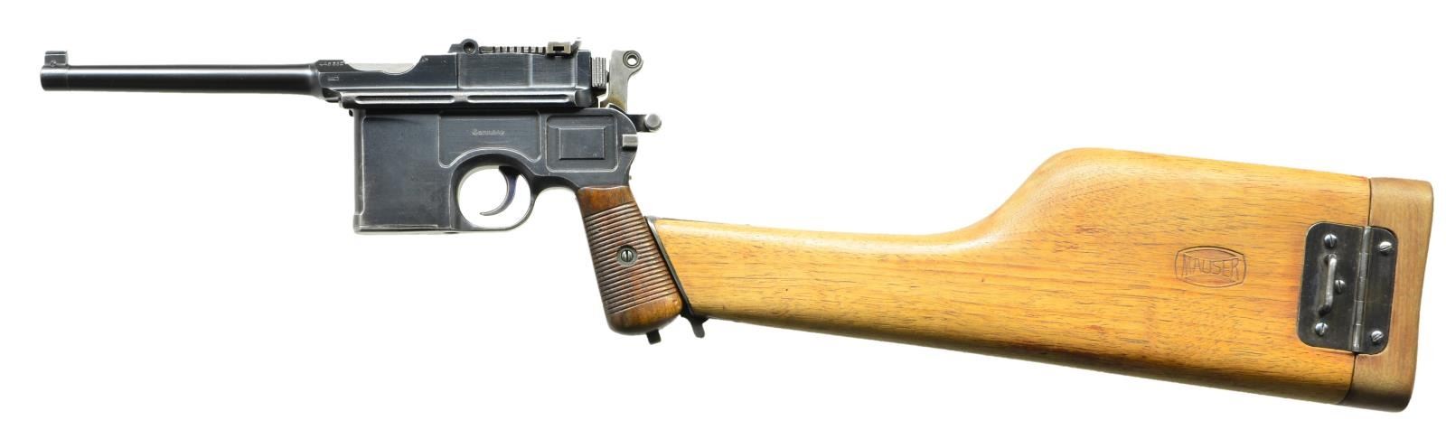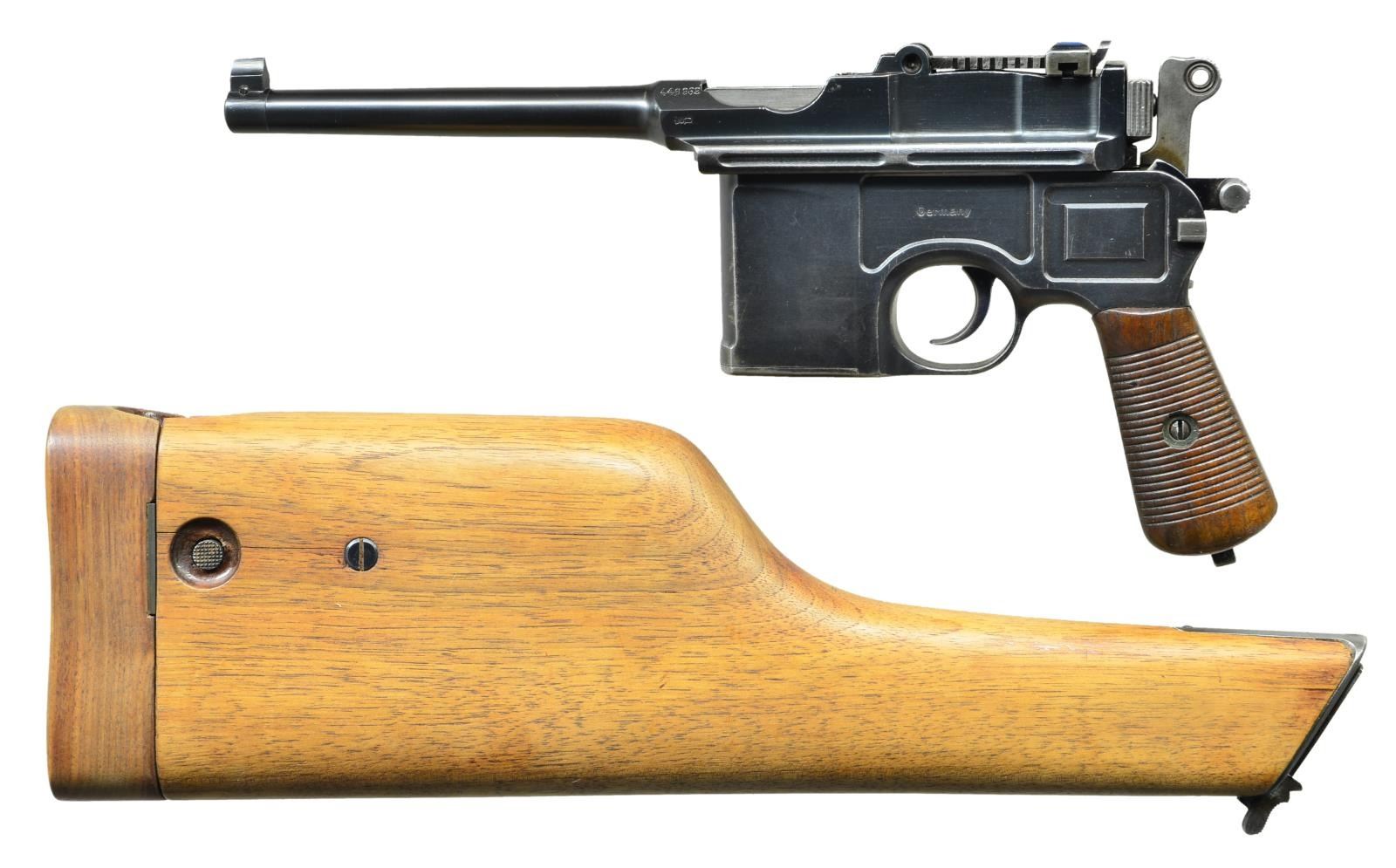 Cal. 7.63mm S# 446982. This is a Mauser C96 as made shortly after WWI as the factory converted its short bbl. Bolos to pistols w/ a longer bbl, hiding the juncture w/ hash marks, found in the 445,000-448,000 S# range, this pistol having had those hash marks removed. Now w/ a 5.5" bbl, a pinned front sight mounted on a bbl band & a 50-1000 graded rear sight. Short extractor, 2-lug firing pin & small ring hammer. Usual Mauser address on chamber w/ full S# on left chamber flat, Crown /"C" /"U" on left side of bbl. extension, "GERMANY" marked on left mid-frame panel as customarily applied to exported pistols. Right frame w/ 2-line Mauser address. Bolo wood grips. Lanyard ring absent. Disassembly shows all matching numbers except for an unnumbered follower (correct) & unnumbered grips (previous numbers having been removed). UNATTACHED ACCESSORIES: accompanied by a later production "Mauser" banner stock, lug numbered "547". CONDITION: VG-Excellent as partially restored, the restoration limited to the bbl./bbl. extension assembly & the extractor. Balance of pistol retains 92-95% rust blue, the sm. parts having comparable fire blue. Near excellent grips w/ oil staining & a scattering of dings. Stock & hinge have been refinished, the stock having a hairline crack through the lid release button, most of the fire blue on the lug having faded. Mirror bore. Perfect manual mechanics. (22-3102/LMA). CURIO. $3,000-5,000.