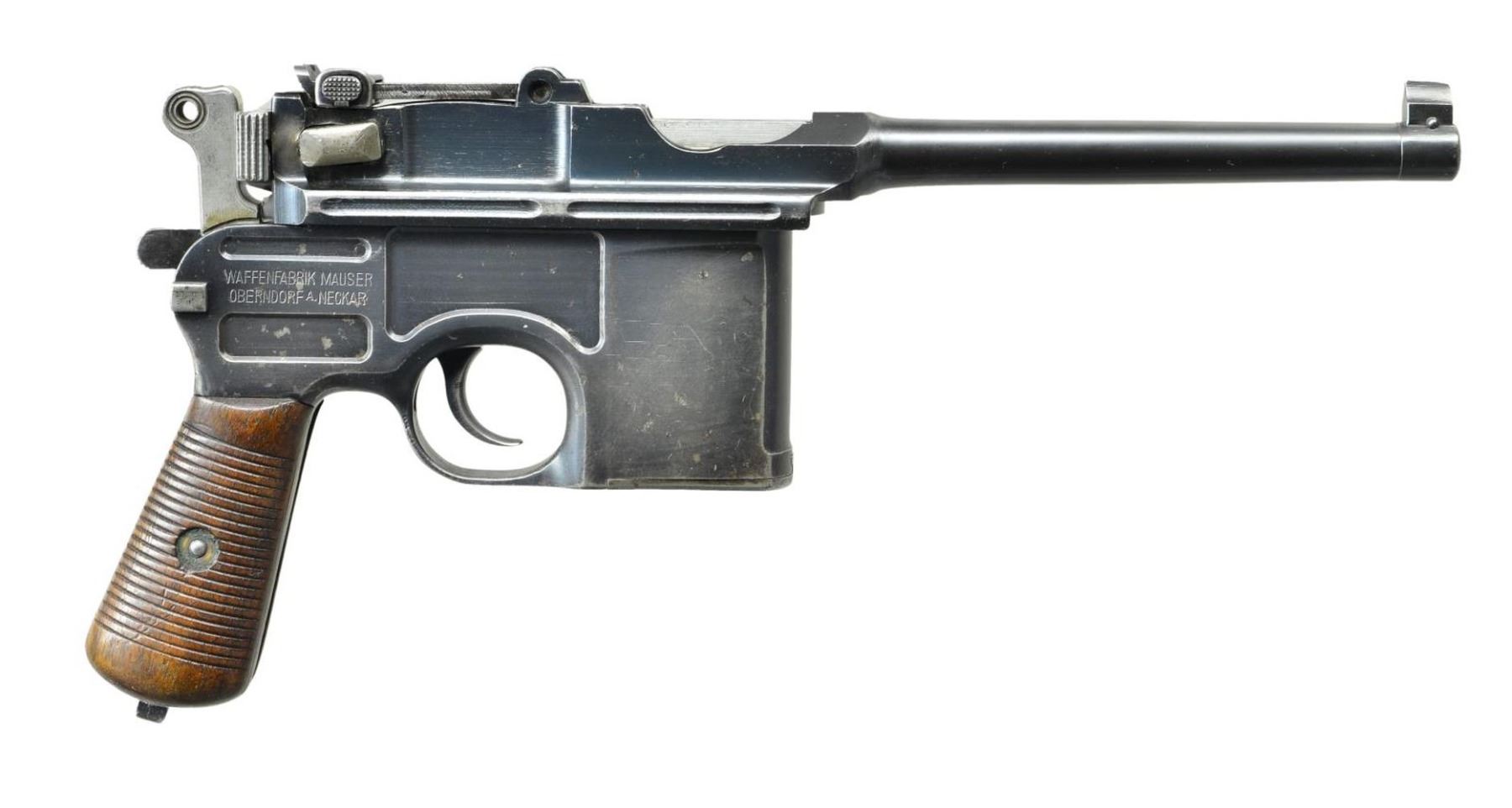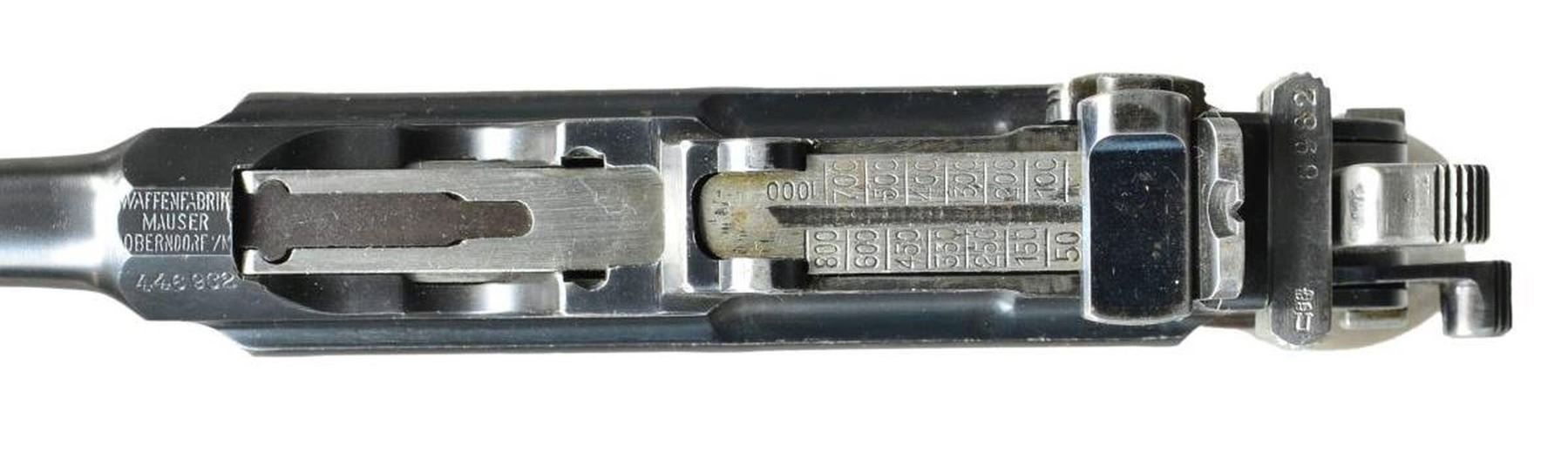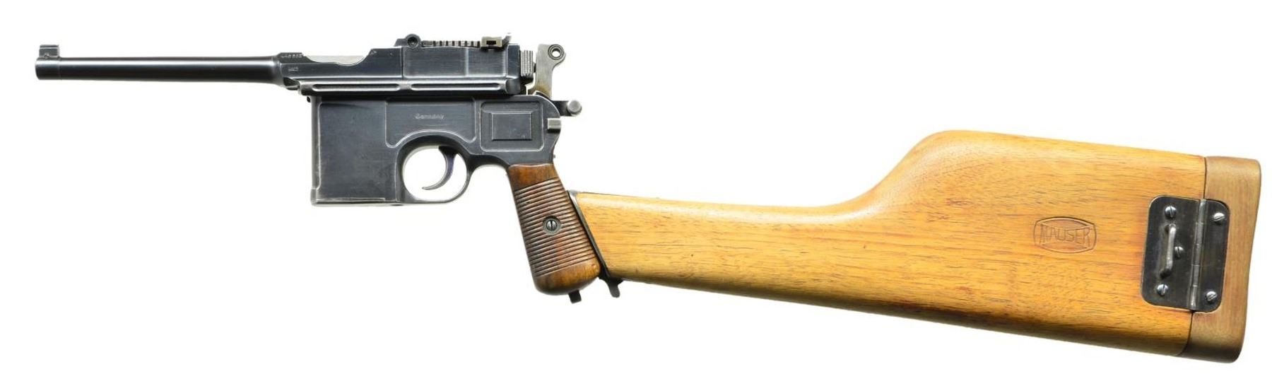 Cal. 7.63mm S# 446982. This is a Mauser C96 as made shortly after WWI as the factory converted its short bbl. Bolos to pistols w/ a longer bbl, hiding the juncture w/ hash marks, found in the 445,000-448,000 S# range, this pistol having had those hash marks removed. Now w/ a 5.5" bbl, a pinned front sight mounted on a bbl band & a 50-1000 graded rear sight. Short extractor, 2 lug firing pin & small ring hammer. Usual Mauser address on chamber w/ full S# on left chamber flat, Crown /"C" /"U" on left side of bbl. extension, "GERMANY" marked on left mid frame panel as customarily applied to exported pistols. Right frame w/ 2 line Mauser address. Bolo wood grips. Lanyard ring absent. Disassembly shows all matching numbers except for an unnumbered follower (correct) & unnumbered grips (previous numbers having been removed). UNATTACHED ACCESSORIES: accompanied by a later production "Mauser" banner stock, lug numbered "747". CONDITION: very good to excellent as partially restored, the restoration limited to the bbl./bbl. extension assembly & the extractor. Balance of pistol retains 92-95% rust blue, the sm. parts having comparable fire blue. Near excellent grips w/ oil staining & a scattering of dings. Stock & hinge have been refinished, the stock having a hairline crack through the lid release button, most of the fire blue on the lug having faded. Mirror bore. Perfect manual mechanics. (22-3102/LMA). CURIO. $2,000-3,000.