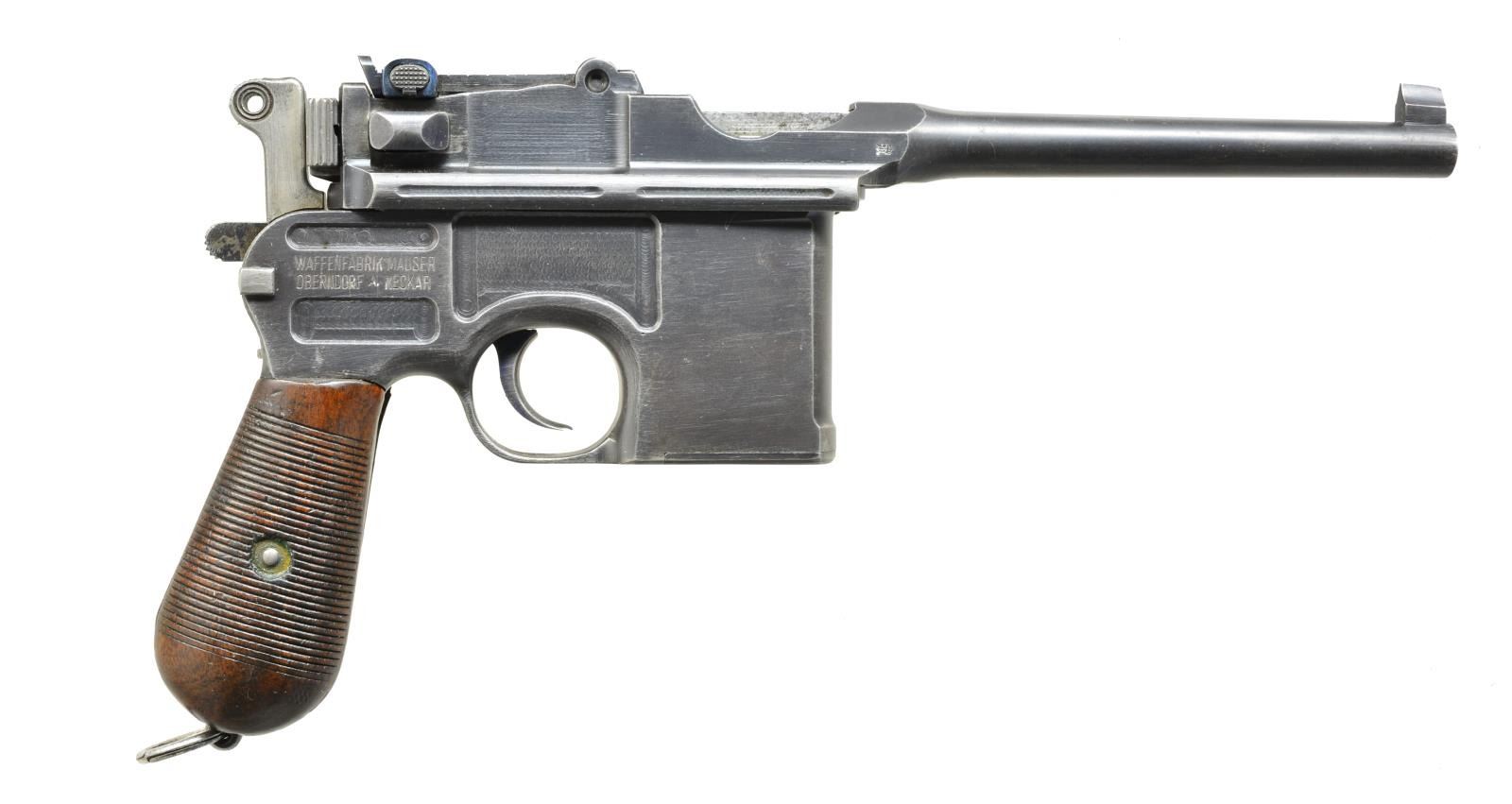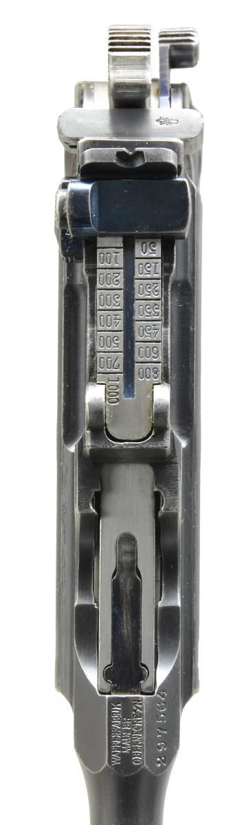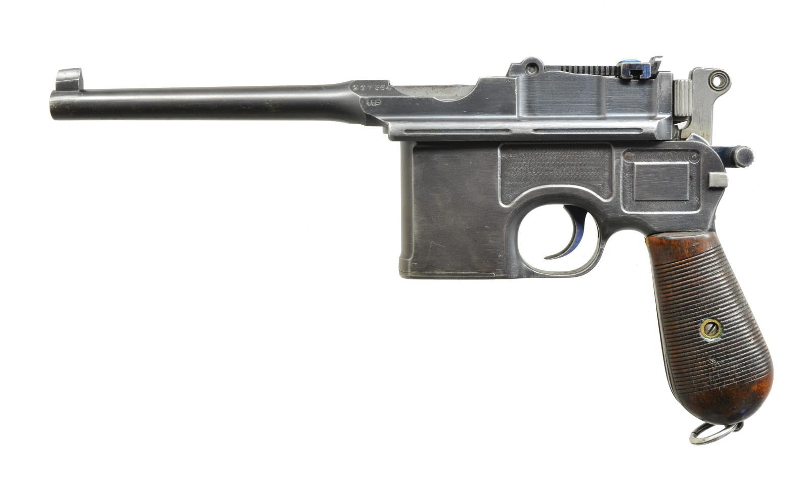 Cal. 7.63 Mauser. S# 297564. Bbl. 5 1/2". Matching numbered visible parts plus 34 groove grips & floorplate. Bolt not numbered; S on each side of cocking piece at bottom plus crown U on top. Mauser legend over chamber & right rear of frame. Lightening cuts on frame rails. Crown U on left front of receiver. 50-1000 Marked rear sight. CONDITION: good to very good overall appearance w/ faint spotty oxidation on bbl. Very nice vivid fire blued parts. Very light high point & function wear. Staining on sides of bolt at port; top & rear very good. Good grips w/ hand wear & light marks. Near excellent appearance of bolt face. Good bore w/ light wear & frosting. (20-3299/NW). CURIO. $1,500-2,200.