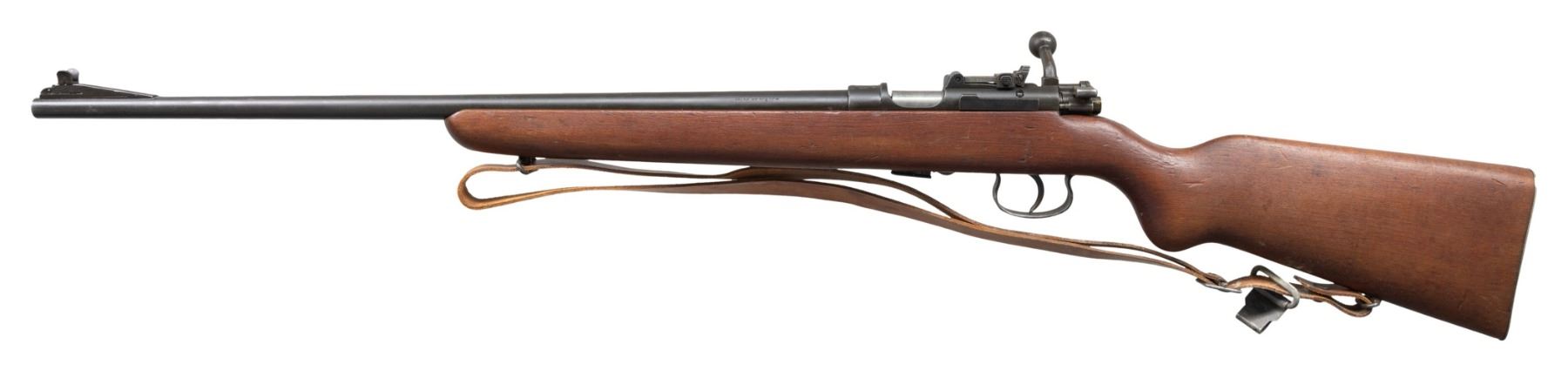 Cal. 22 LR. S# F18216. Bbl. 24" with Navy Arms import marking. Ramped blade front sight with M14 style ears. Aperture rear sight graduated to 150m. Matching numbers on receiver & bolt handle. Post-WW2 training rifle made under French occupation. Receiver ring has both MAS & Mauser Banner markings. Parkerized finish. Beech stock set with bottom mounted sling swivels & tan sling. MAGS: 1-5 rd. UNATTACHED ACCESSORIES: cardboard box marked "NMSAMA". CONDITION: stock shows scattered handling marks & dings. Metal retains 85% arsenal parkerized finish with scattered edge wear, handling marks & light oxidation. Action functions properly when hand cycled. Bright near excellent bore. (25-3074/MJC). CURIO. $250-450.