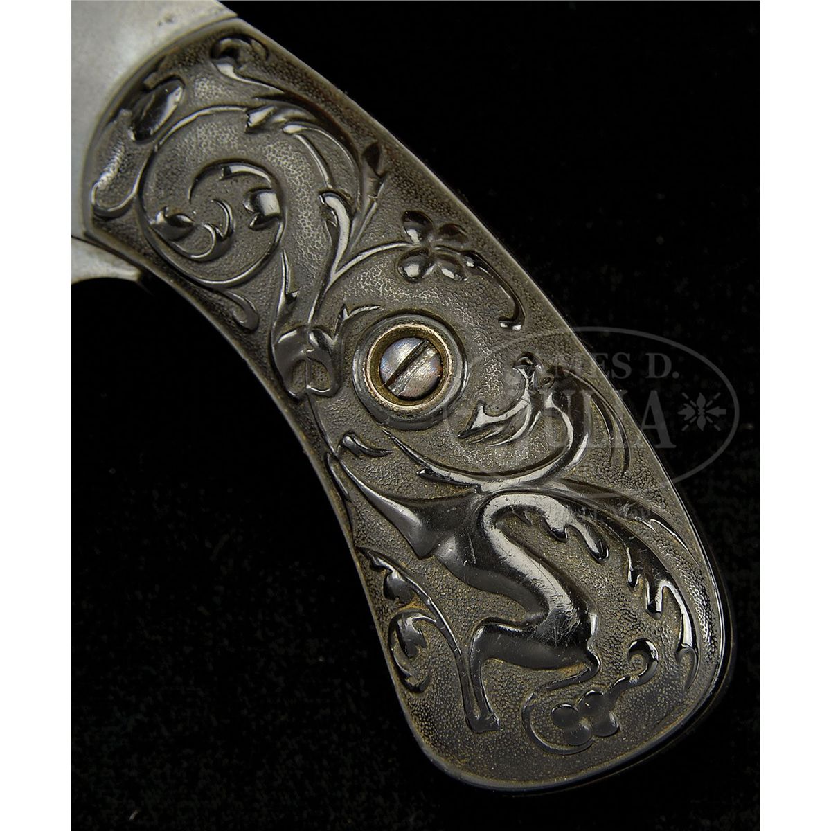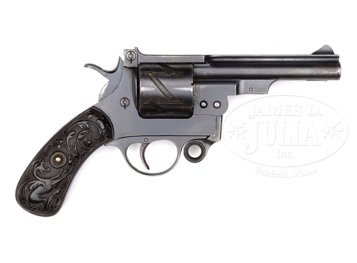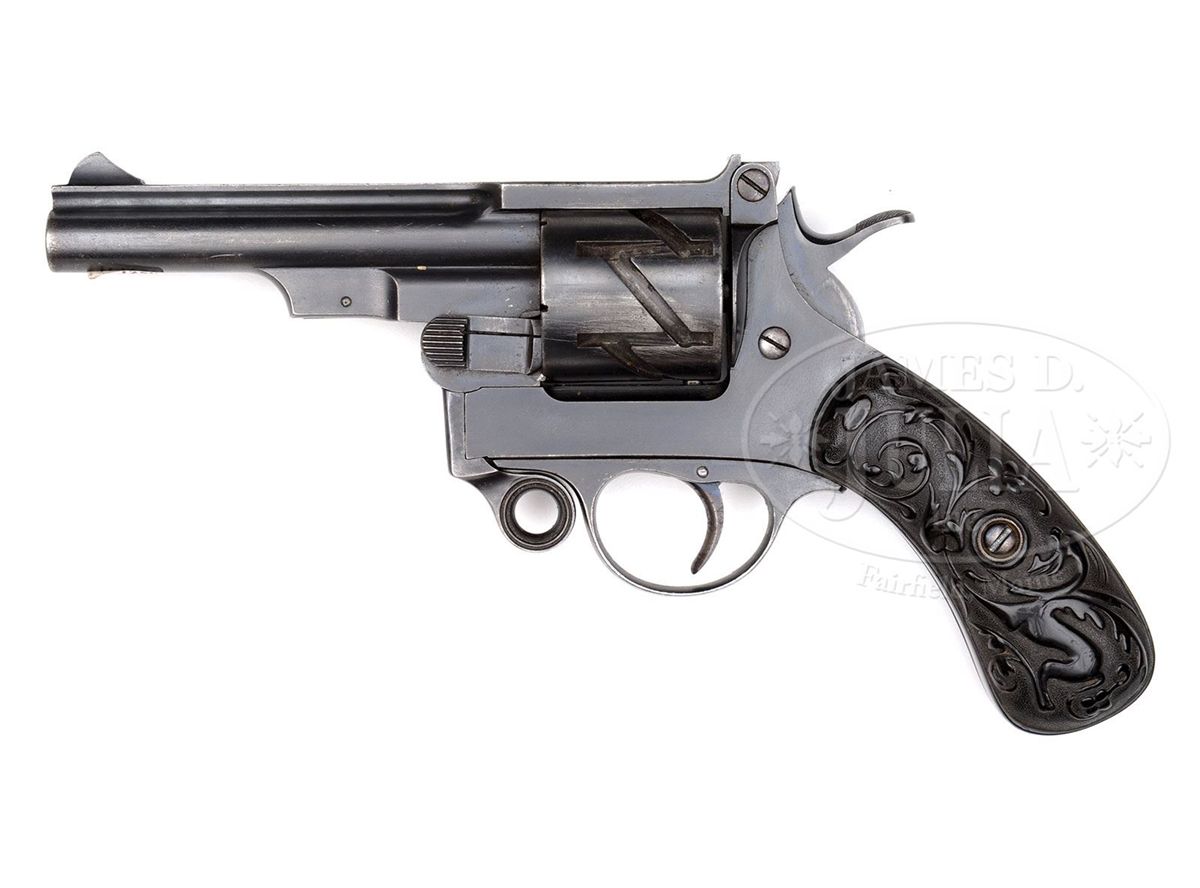 SN 106. Cal. 7.6mm Rimmed. Blue finish with 3-5/8" keyhole shape bbl that has integral front sight and fixed rear sight in the top strap. Frame is tip-up style with locking latch at the front and angled grip with 2-pc molded hard rubber grips that have dragon design. Cylinder is very unusual with Z-shaped grooves around outer diameter which are, in fact, rotating grooves for the cylinder. Cylinder rests on a pin which is in a groove and when the hammer is cocked it advances the cylinder to the next chamber for firing. Left front side of the bbl lug has a small thumb latch which is a cylinder lock that fits into a notch in the extended front rim of the cylinder and if not latched the bbl cannot be opened. Few of these revolvers have shown up in the U.S. because of their European calibers which are not generally available in the U.S. PROVENANCE: Collection of Dr. Geoffrey Sturgess. Ex-Visser collection. CONDITION: Very fine. Overall retains about 95% satin blue finish with light muzzle & sharp edge wear. Grips are sound showing light wear. Mechanics are crisp, bright shiny bore. 4-52568 JR389