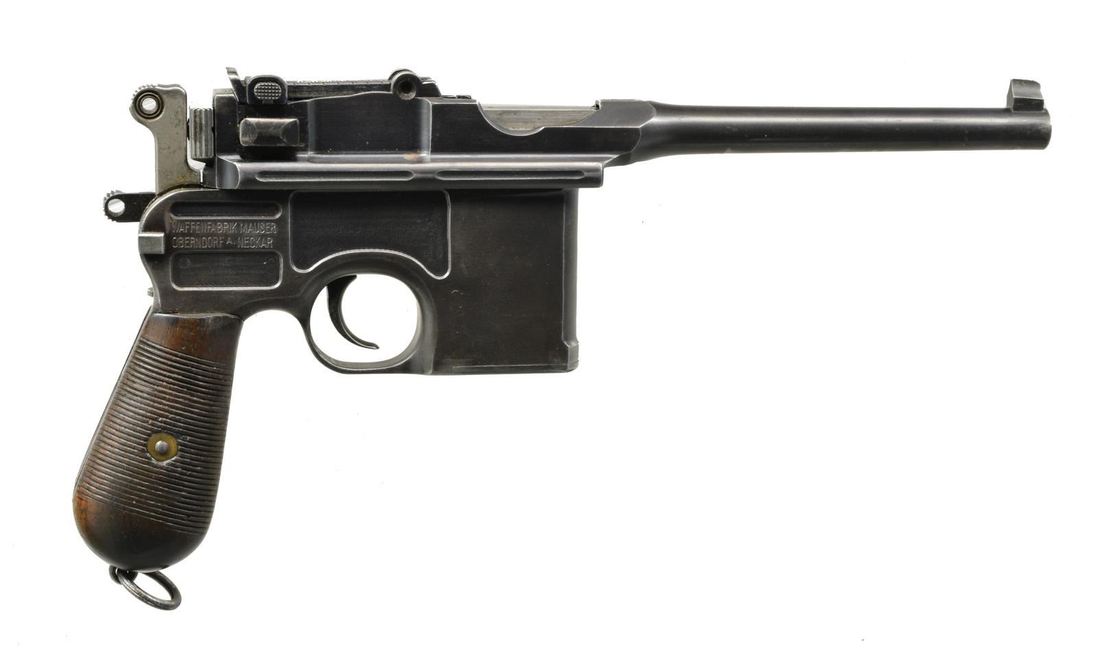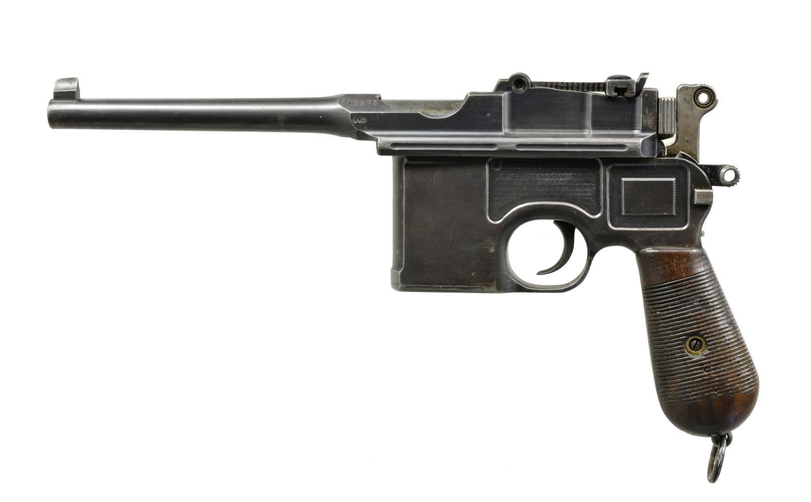 Cal. 7.63 Mauser. S# 216301. Bbl. 5 1/2". Standard pre war commercial example per S# range w/ all matching visible numbers plus floorplate & both commercial 32 grooved grips. Crown “U” proofs, 50-1000 tangent sight plus Mauser legend over chamber & right side of frame. Grooved receiver rails, standard hammer, stock slot & lanyard ring at butt. CONDITION: generally very good overall original appearance w/ thinning high point wear, light pitting on bottom of bbl., peppery oxidation, some scratches & fading of fire blued parts. Fair to good bore w/ lightly worn rifling & even fine pitting. (20-1541/NW). CURIO. $1,000-1,500.