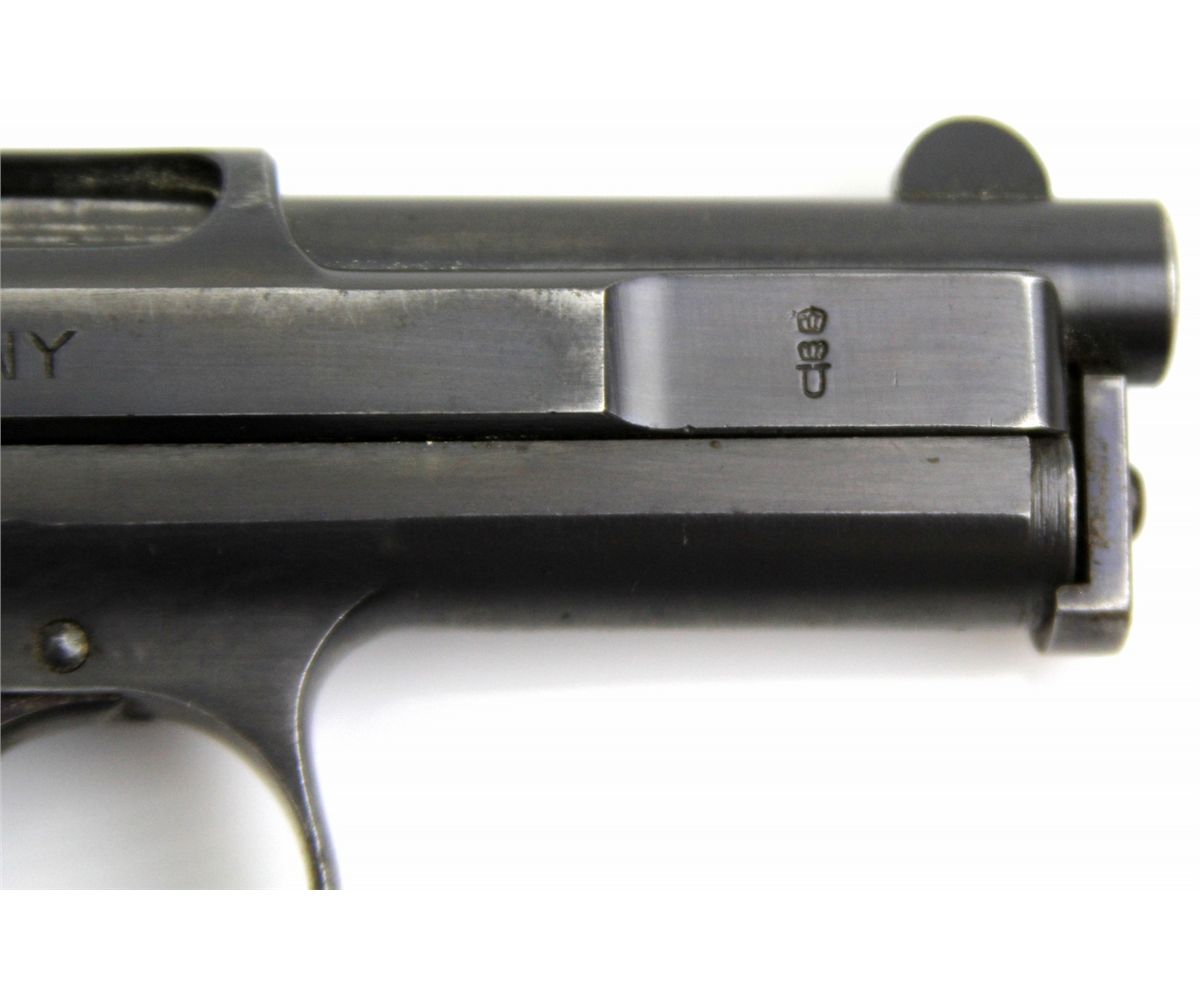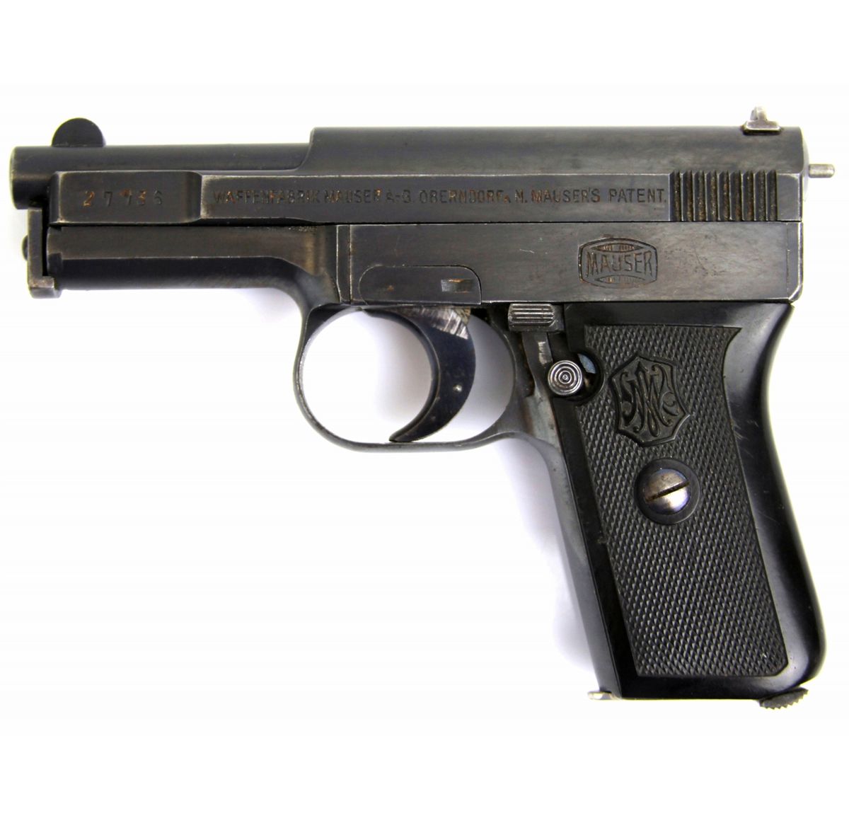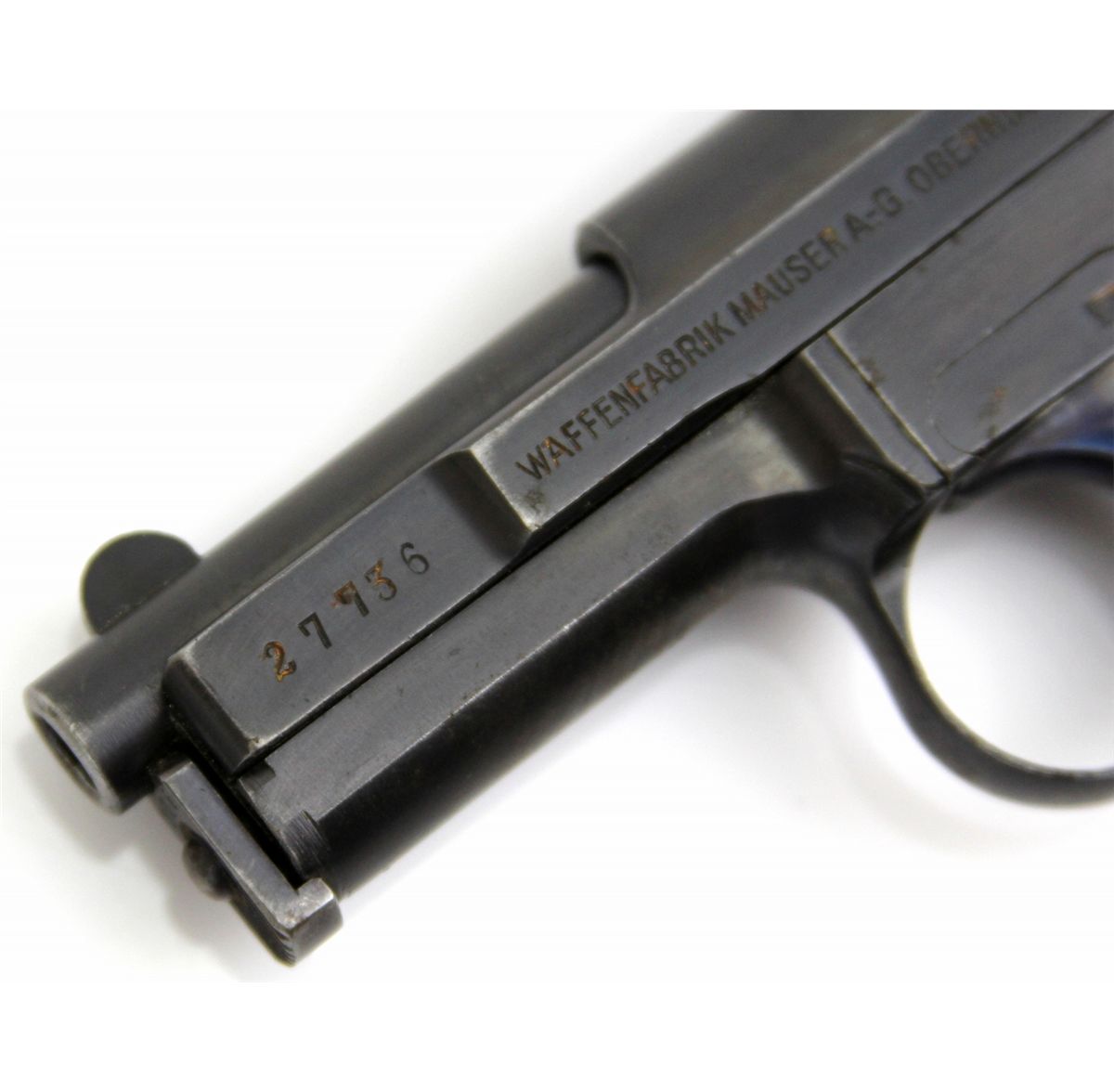 MAUSER MODEL 1910 PISTOL .25ACP Mauser Model 1910 pistol in .25ACP. Mauser patent line on left side of frame, with serial number towards muzzle, and Mauser logo below. Marked "GERMANY" on right side, with crown over "U" mark. Original Mauser hard rubber grips. Serial numbers on frame and slide matching. Type: pistol Manufacturer: Mauser Model: 1910 Caliber / Gauge: .25ACP Serial Number: 27736 Condition: Bore is good for the age, bluing about 85%, with minor thinning and edge wear, very good grips.
