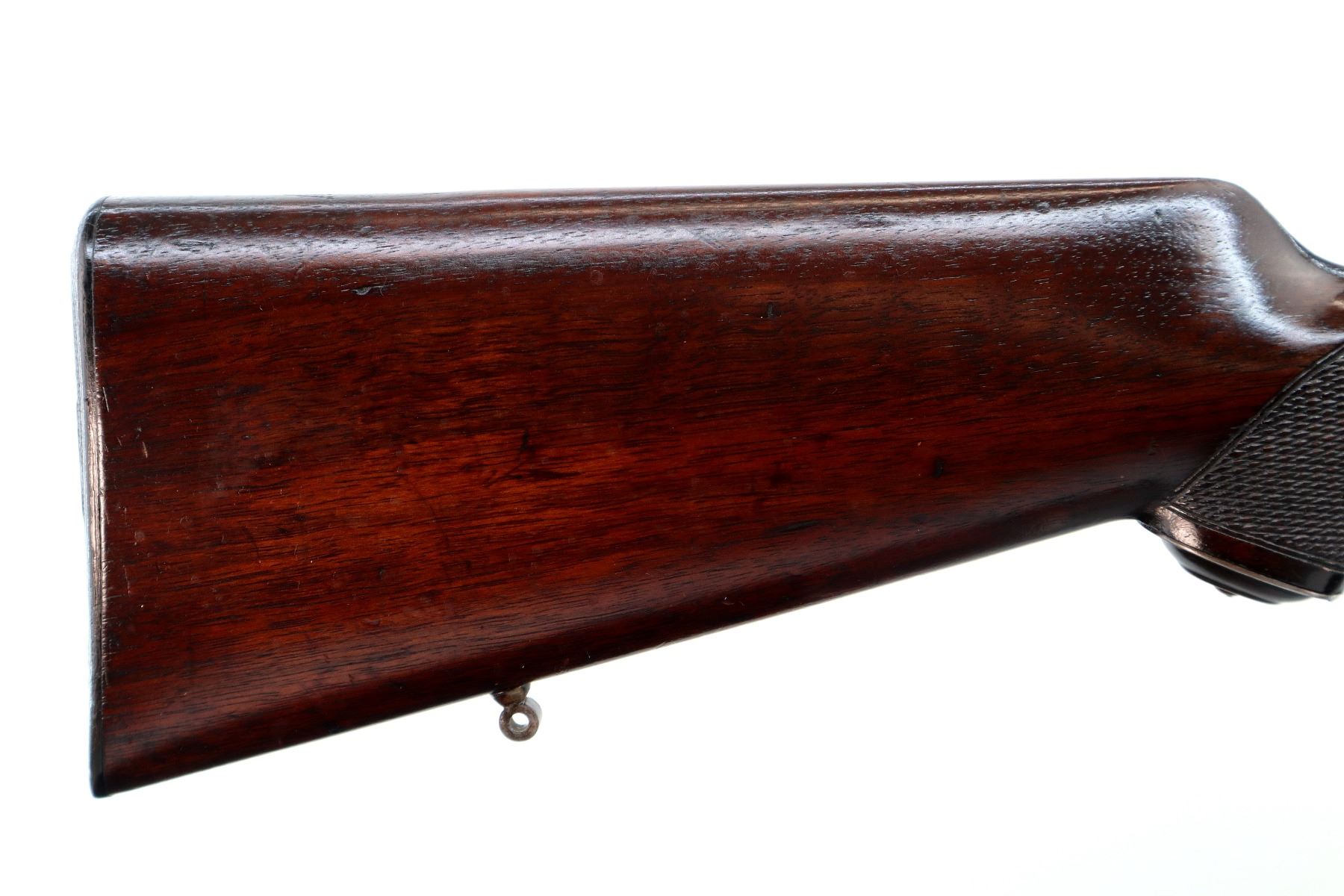 Main Description: Visible numbers match. Blade front sight with ramp, adjustable u notched rear sight, blued finish, turned down bolt handle with smooth knob. One piece sporter wood stock, checkered pistol grip, small chip behind upper tang, European cheek rest, checkered black polymer butt plate, 13.75" LOP, grip cap, hinged floor plate with opening lever, swivel studs.