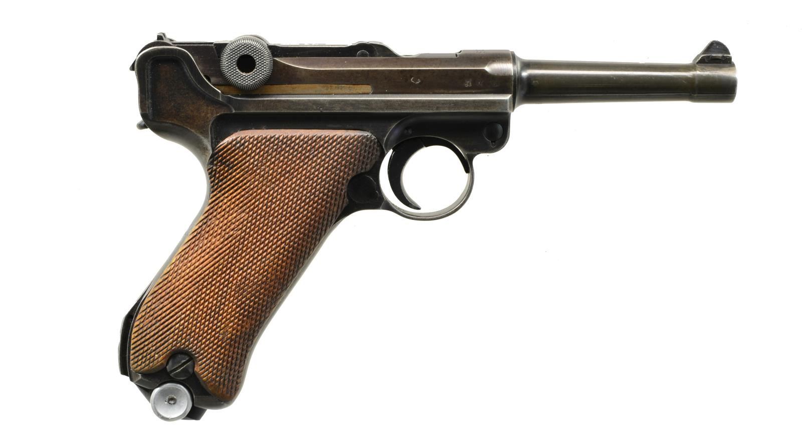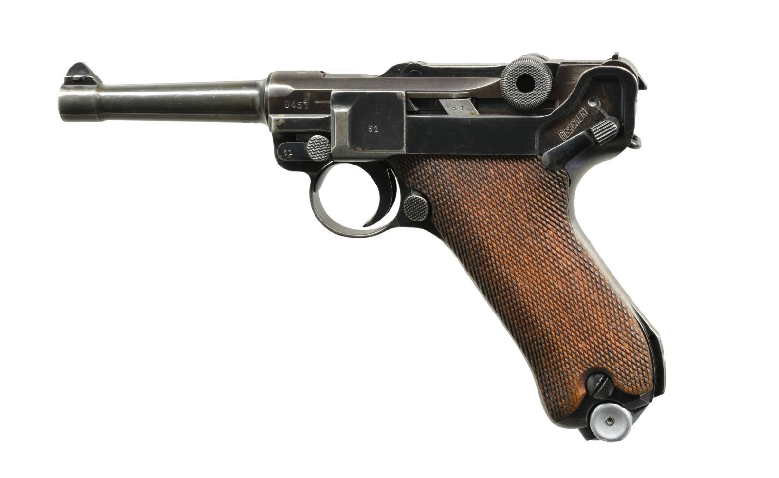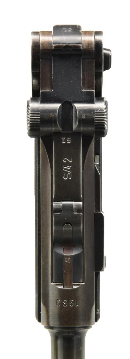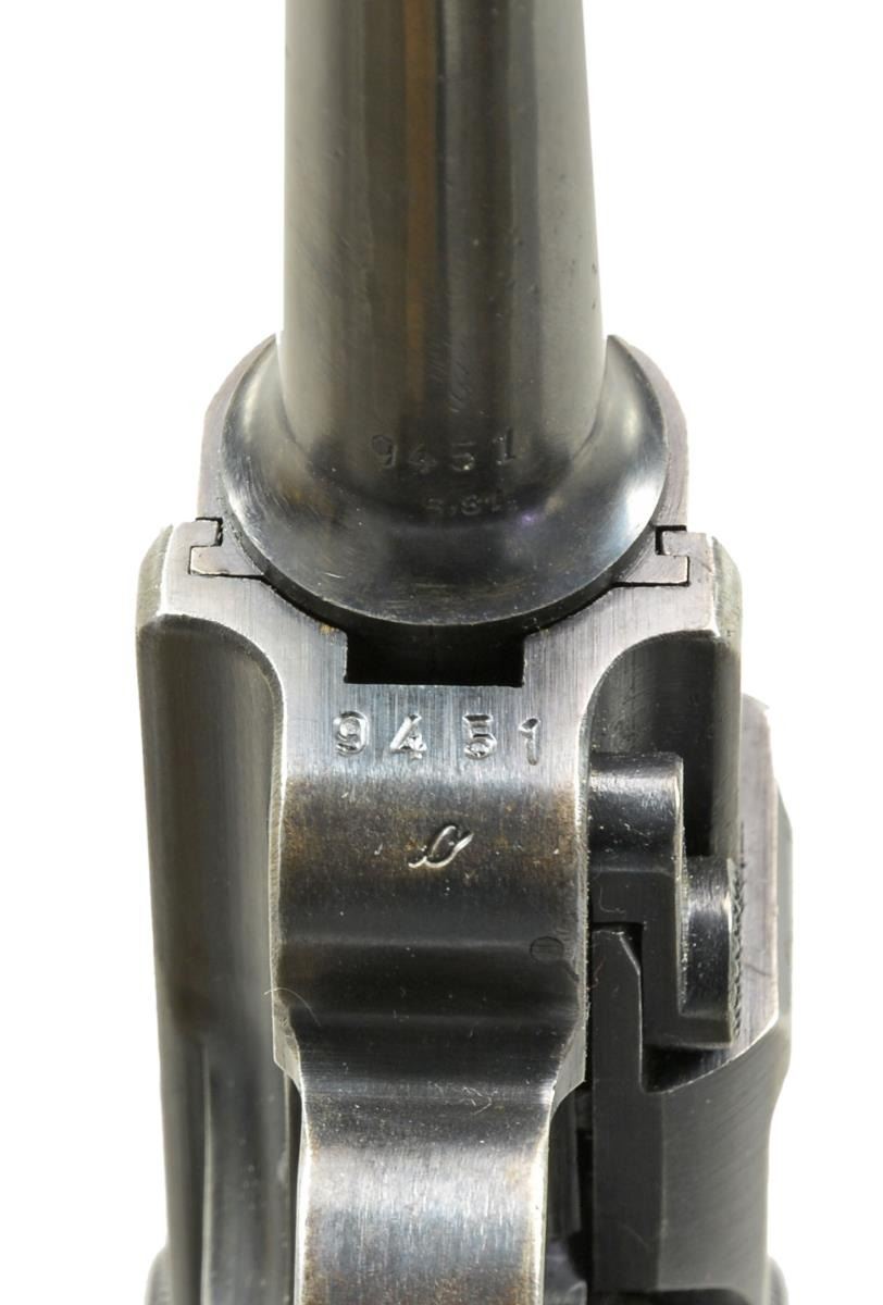 Cal. 9 mm Luger. S# 9451o. Bbl. 4". Dated 1939 as early variation w/ eagle 63 proofs & below "r" S# block. All blued finish except in the white safety bar. All metal parts matching numbered including rear toggle pivot. Left grip w/ lg. 51; right grip has faint somewhat smaller 65 & lg. # that appears to be 5 w/out visible 1. MAGS: 1 very good fxo, P.08 & eagle 37 marked extruded 8 rd. w/ unmarked aluminum base. CONDITION: good plus refinished appearance w/ mottled appearance to grips straps. Bbl. blued over prior pitting. Faded plum hued ejector. Pitting on frame under grips mostly at front strap; especially right side. Occasional peppery oxidation; mostly right side of frame. All markings sharp along w/ profile under trigger guard. Left grip has light diamond top marks & wear at bottom; right better appearing w/ only hand wear. Good plus bore w/ light wear & very faint frosting. (20-2141/NW). CURIO. $650-900.