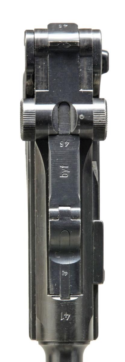 PISTOL. Cal. 9mm Luger. S# 3846r. Bbl. 4". Mfg. 1941 w/ early marks to include: eagle "655" proof. Approx. 25,000; mfg. 3,300n to 1,000. Proper all blue finish w/ P.08 on left frame flat. All matching #s including rear toggle pivot. MAGS: correct early fxo eagle 37 P.08 extruded mag. w/ early aluminum base numbered 3846r rather than unmarked plastic base of later models. UNATTACHED ACCESSORIES: very good eagle 655 proofed loading tool. Very good plus Moll Lederwarenfabrik black leather holster marked P.08 having buckle strap retention. Between belt loops marked "cxb / 41 / eagle WaA723". CONDITION: minimal thinning at some high points such as front of frame, side plate & stock lug. Overall near excellent w/ especially clear markings & contours. Near excellent grips & bore. Especially nice collectible Black Widow w/ early matching mag. (20-3349/NW). CURIO. $2,500-3,500.