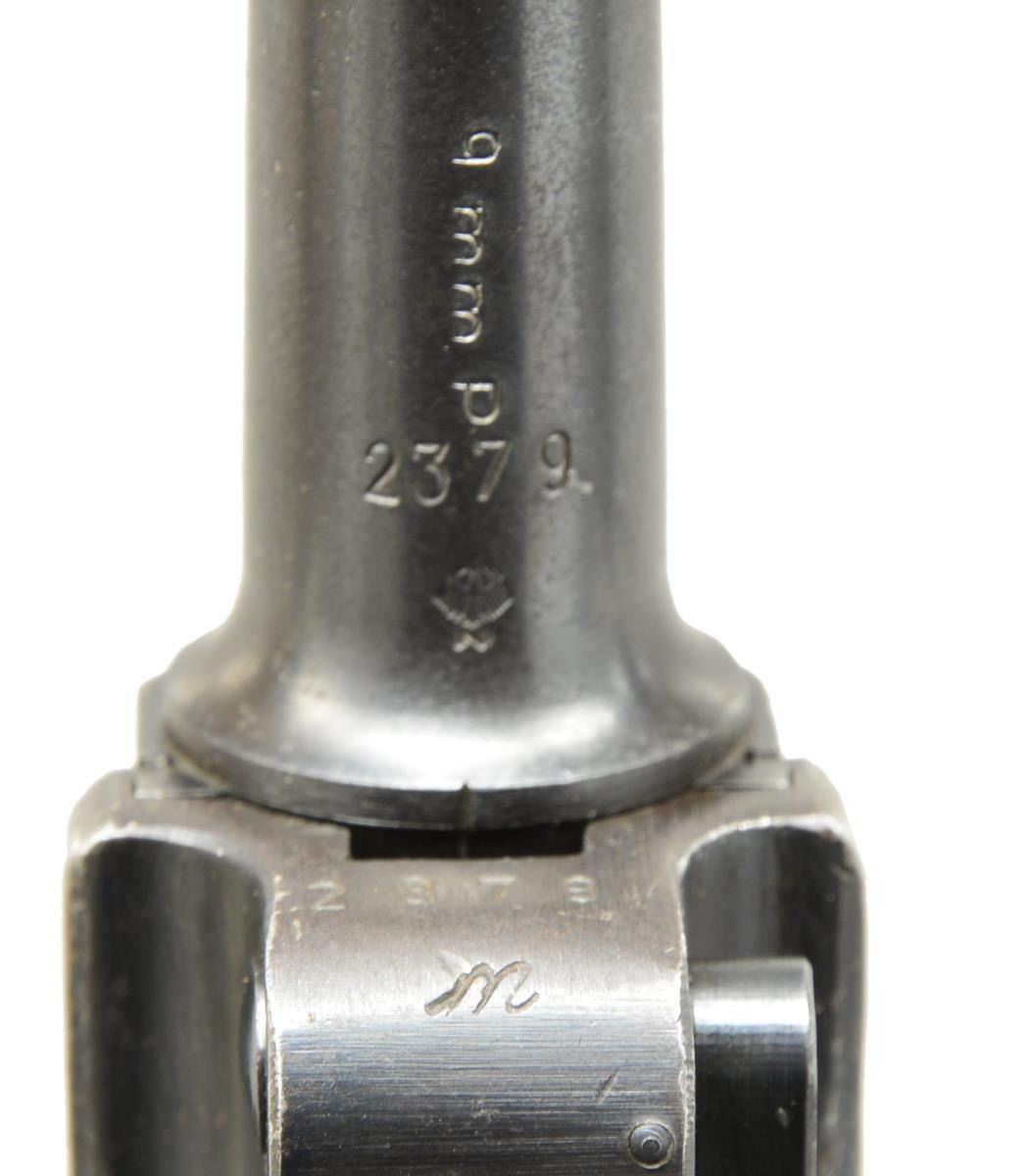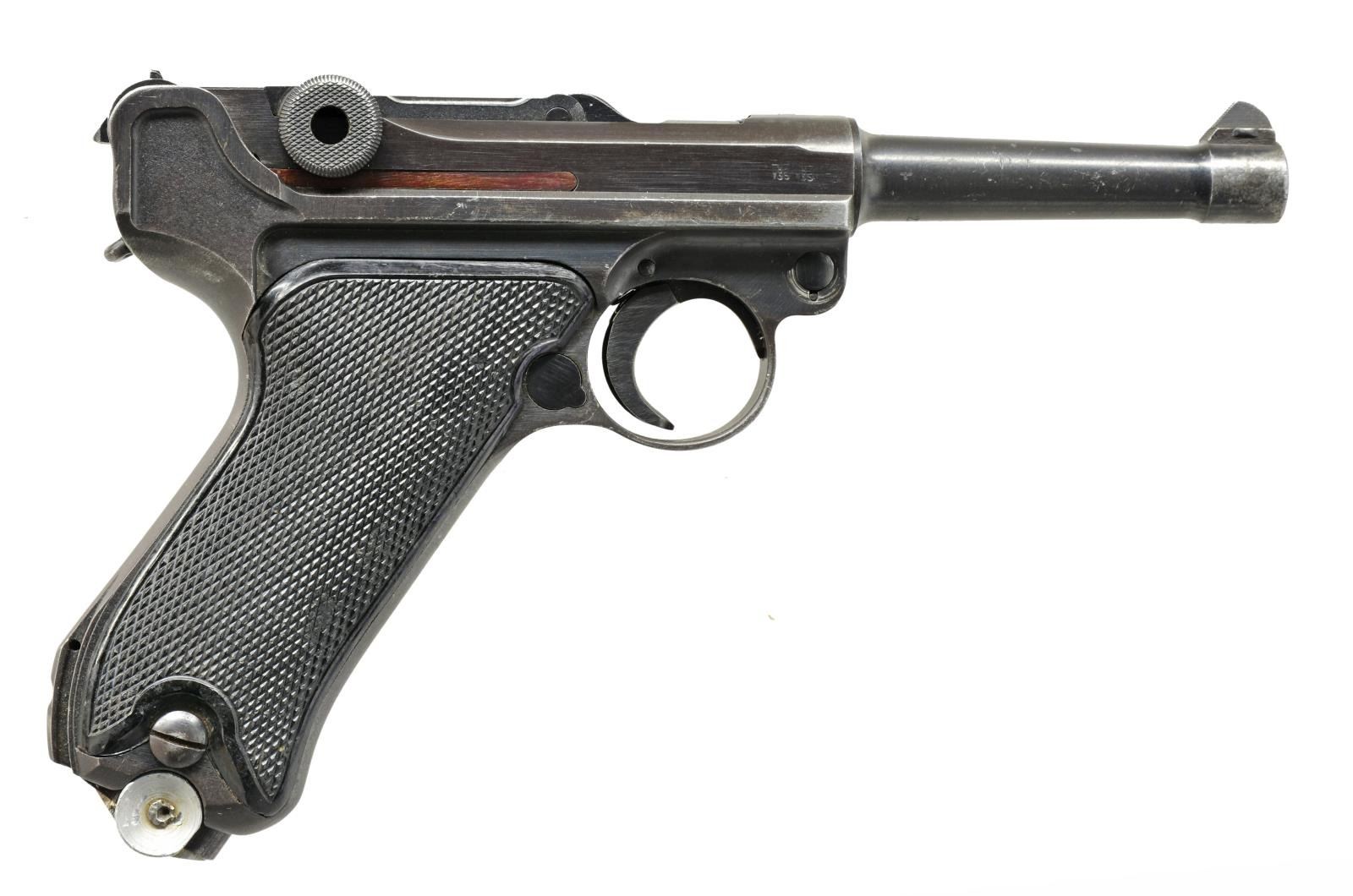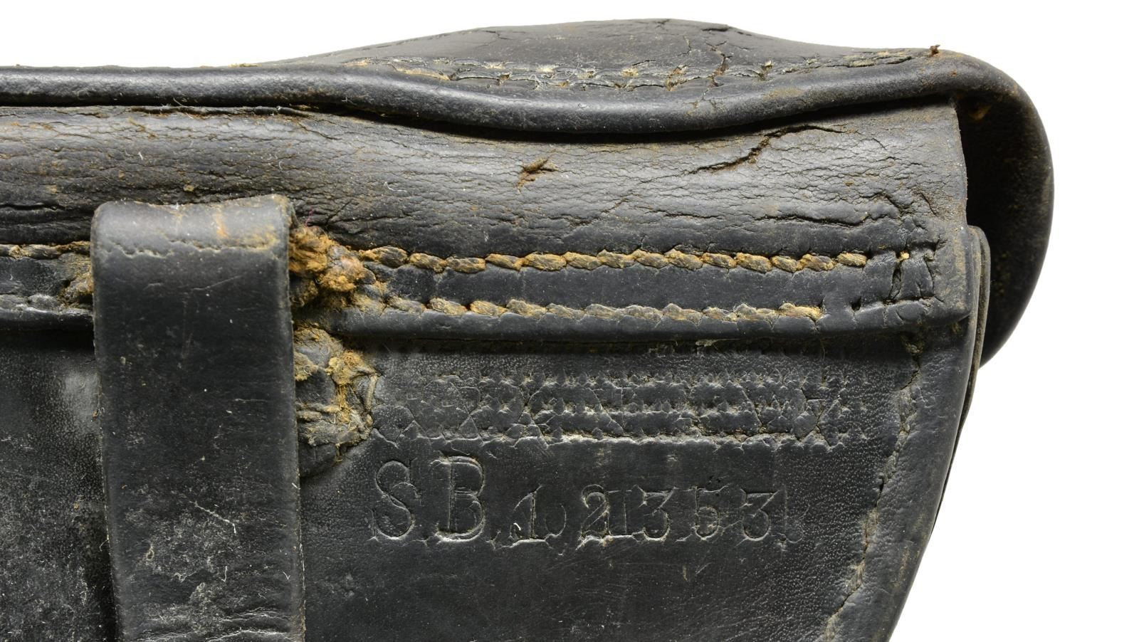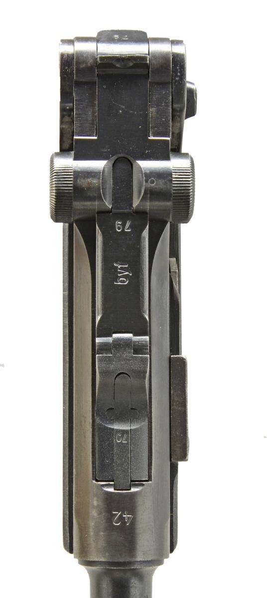 SEMI-AUTO PISTOL. Cal. 9mm Luger. S# 2379m. Bbl. 4". Mfg. 1942 w/ checkered black plastic grips. All matching numbers including rear toggle pivot. "42" Over chamber, "byf" on toggles, eagle 135 receiver proofs & "P.08" on left frame flat. Characteristic all blued finish. MAGS: 1 good blued extruded 8 rd., properly marked "fxo" & eagle "37". Non original appearing aluminum base w/ roughly installed retaining pin; correct is pinned black plastic. UNATTACHED ACCESSORIES: fair dark oiled flap holster w/ buckle & strap retention. Numerous leather repairs along w/ stud on flap from prior retention method. Underside of flap has "CARL TRENNER / BERLIN / 1918". Back of holster has x'd out previous unit marking & "S.B. 1 2 3.5 3." Tool pouch partially separated. CONDITION: good plus appearance of original finish w/ typical high point holster wear & traces of light peppery oxidation near muzzle of bbl. plus on sideplate. Very good grips w/ left best appearing; 2 sm. marks on right. Very good bore; occasional faint pitting. (21-223/NW). CURIO. $1,200-1,800.