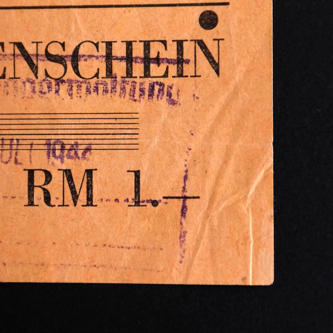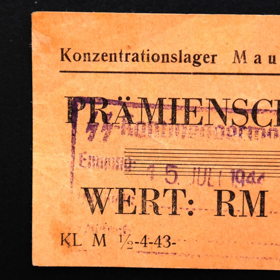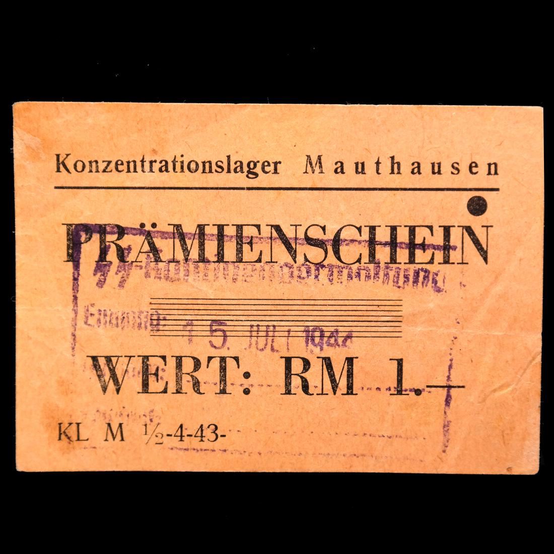 Konzentrationslager Mauthausen / Prmienschein / Wert: RM 1.- on salmon paper, violet SS-Kantinenverwaltung handstamp dated 15 Juli 1944, measures approx 75 by 53mm, some wrinkles and shallow thins, F-VF.