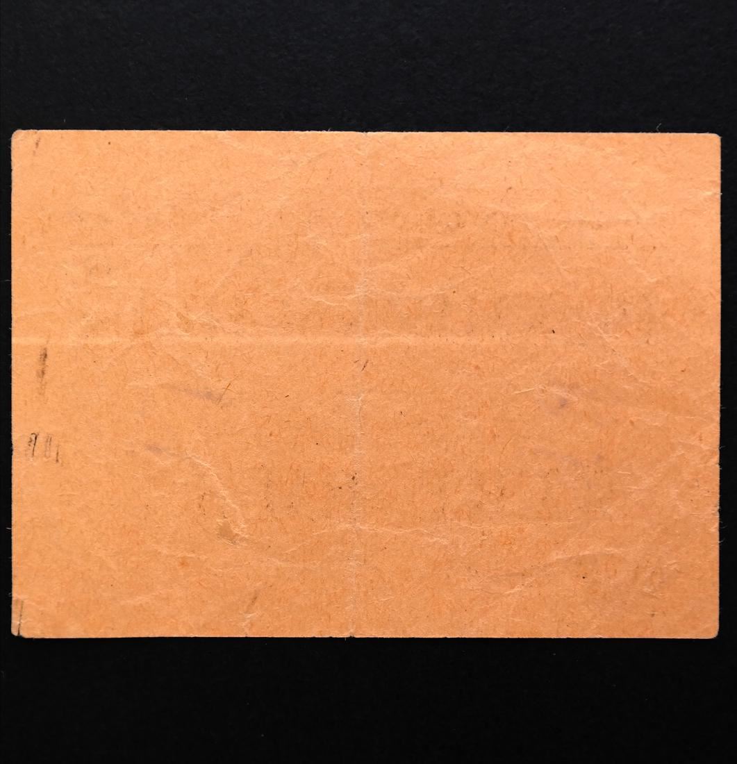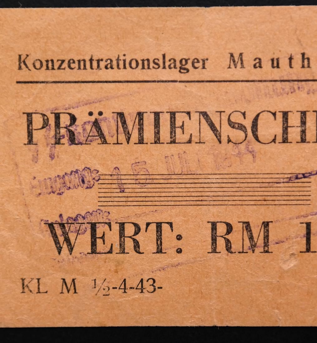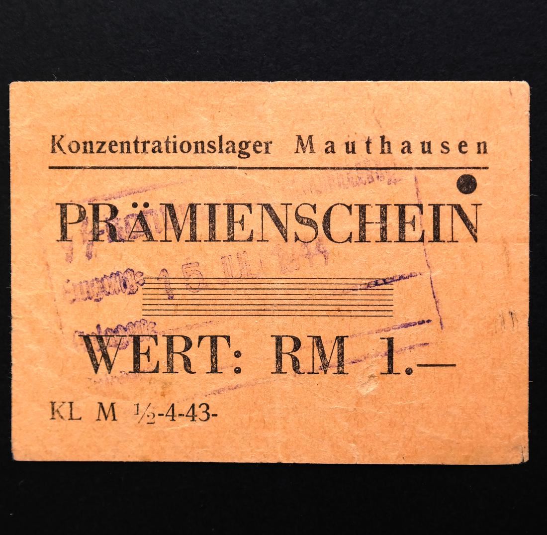 Konzentrationslager Mauthausen / Prmienschein / Wert: RM 1.- on salmon paper, violet SS-Kantinenverwaltung handstamp dated 15 Juli 1944, measures approx 75 by 55mm, vertical center fold, puncture near RM 1- and small cuts, F-VF.