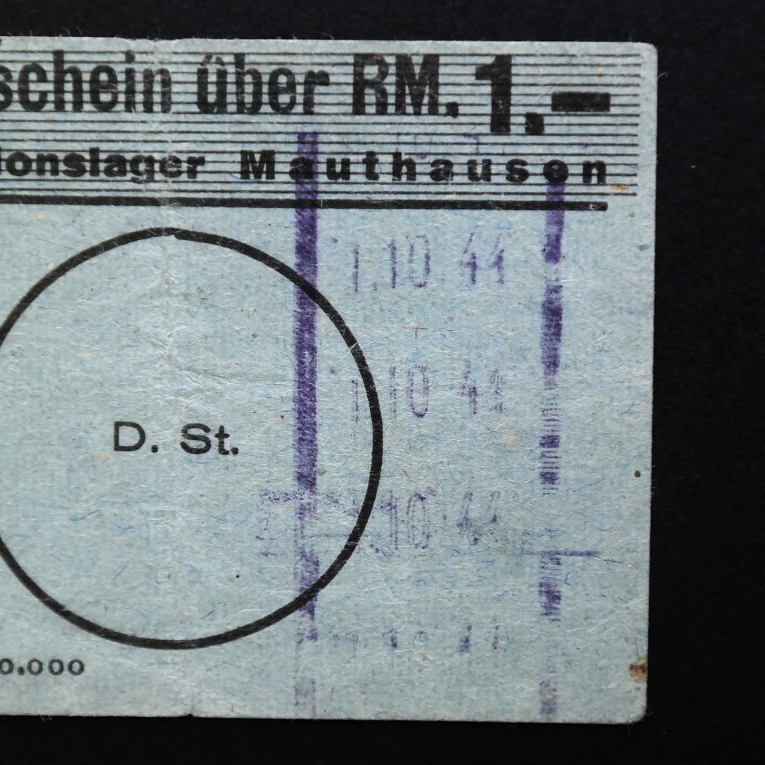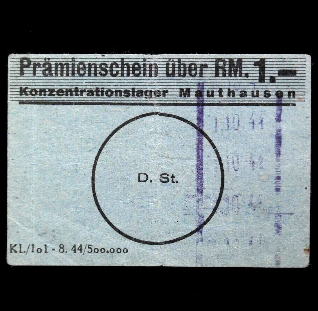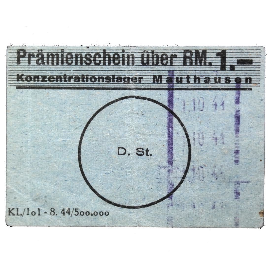 Prmienschein ber RM. 1.- / Konzentrationslager Mauthausen on grayish blue card, violet 1.10.44 roller handstamp, measures approx 74 by 52mm, some creases, sound and VF.