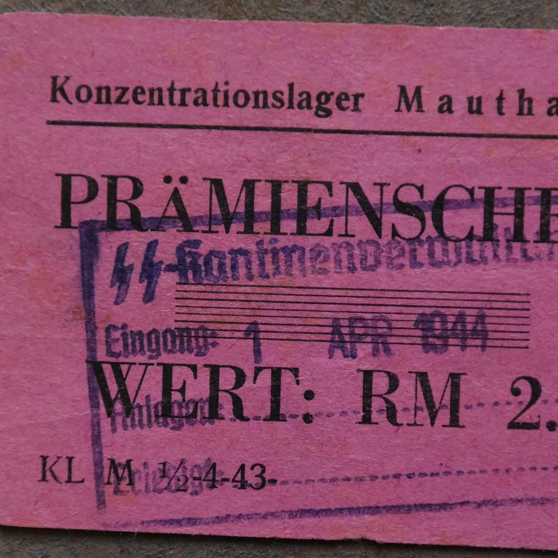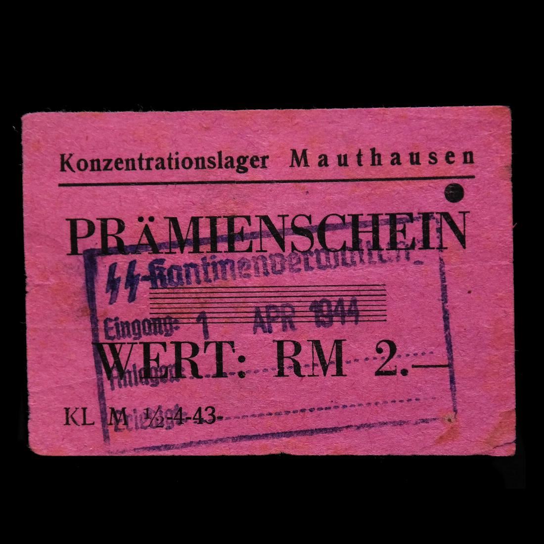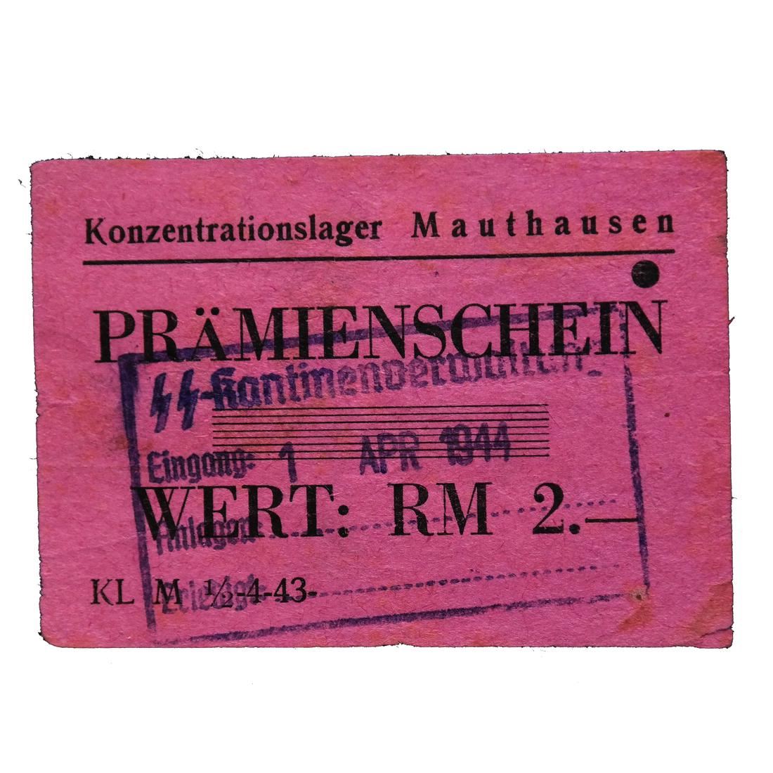 Konzentrationslager Mauthausen / Prmienschein / Wert: RM 2.- on magenta paper, violet SS-Kantinenverwaltung handstamp dated 1 Apr 1944, measures approx 74 by 52mm, light folds and some tiny edge tears, F-VF.