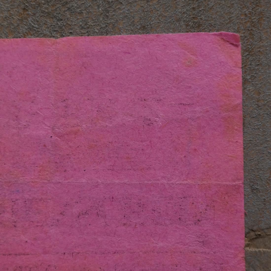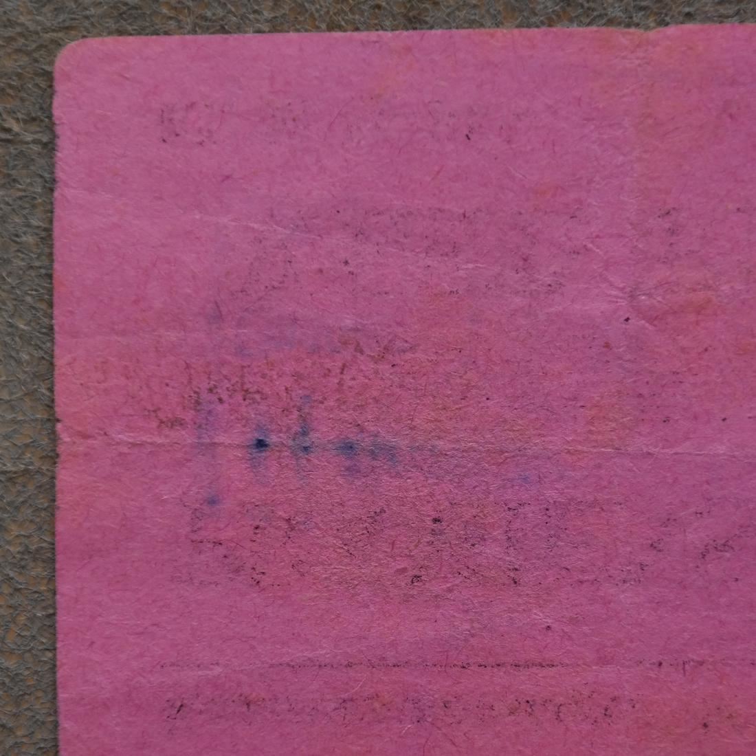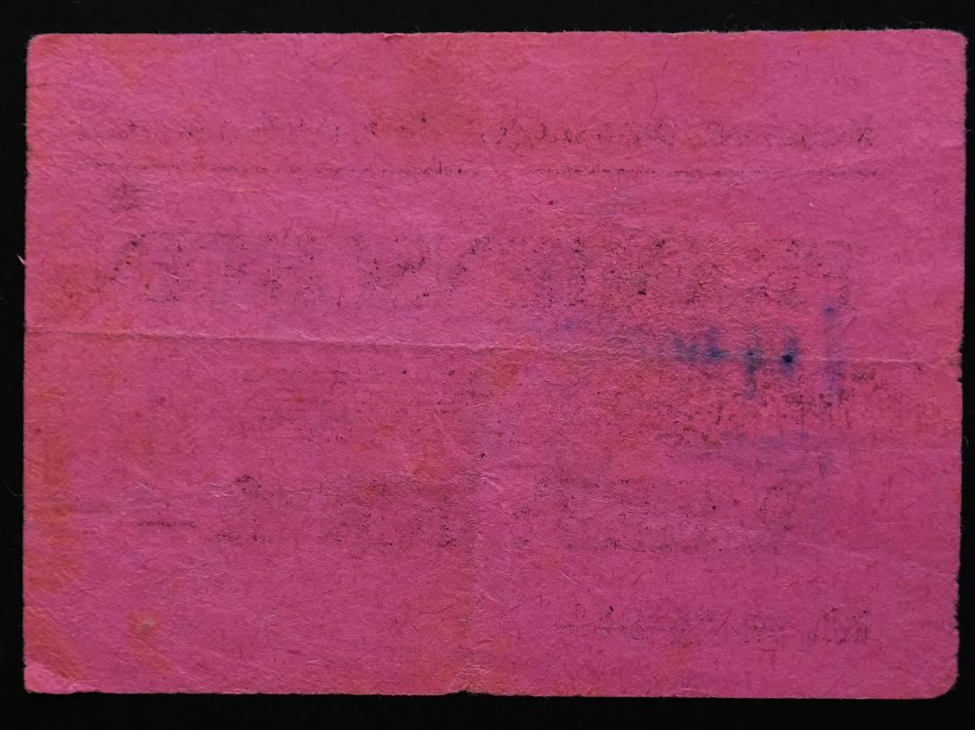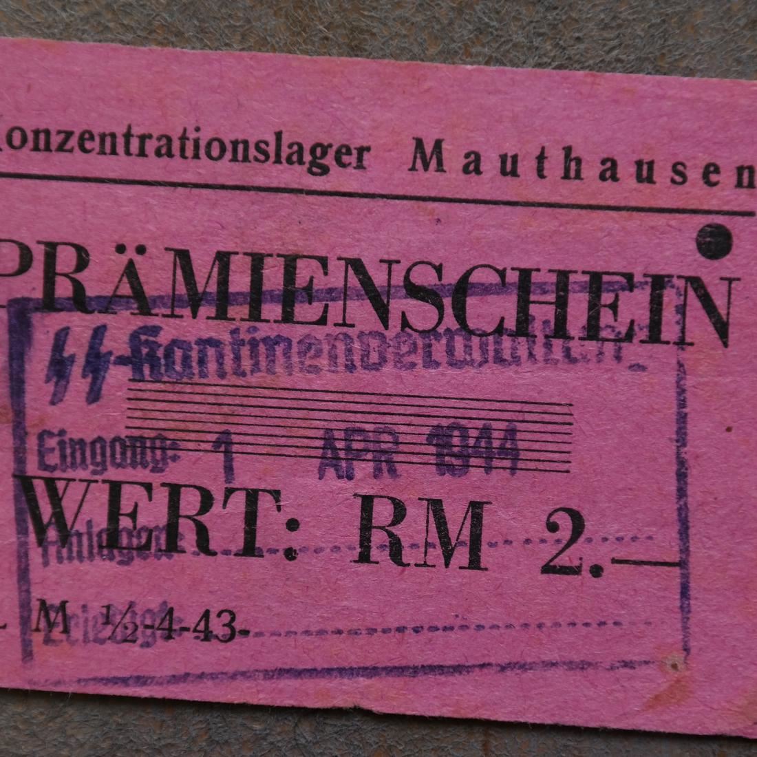 Konzentrationslager Mauthausen / Prmienschein / Wert: RM 2.- on magenta paper, violet SS-Kantinenverwaltung handstamp dated 1 Apr 1944, measures approx 74 by 52mm, light folds and some tiny edge tears, F-VF.