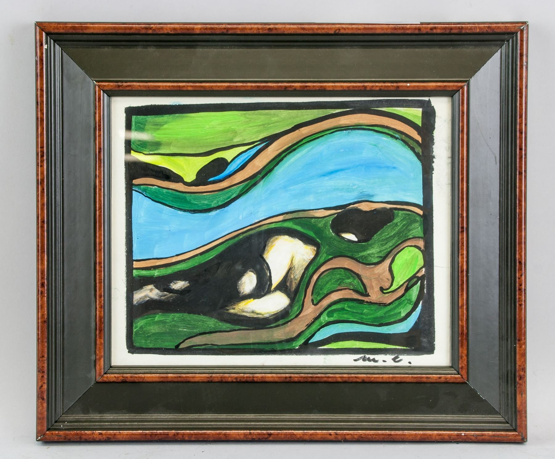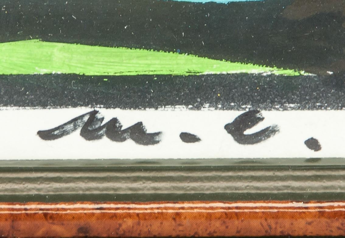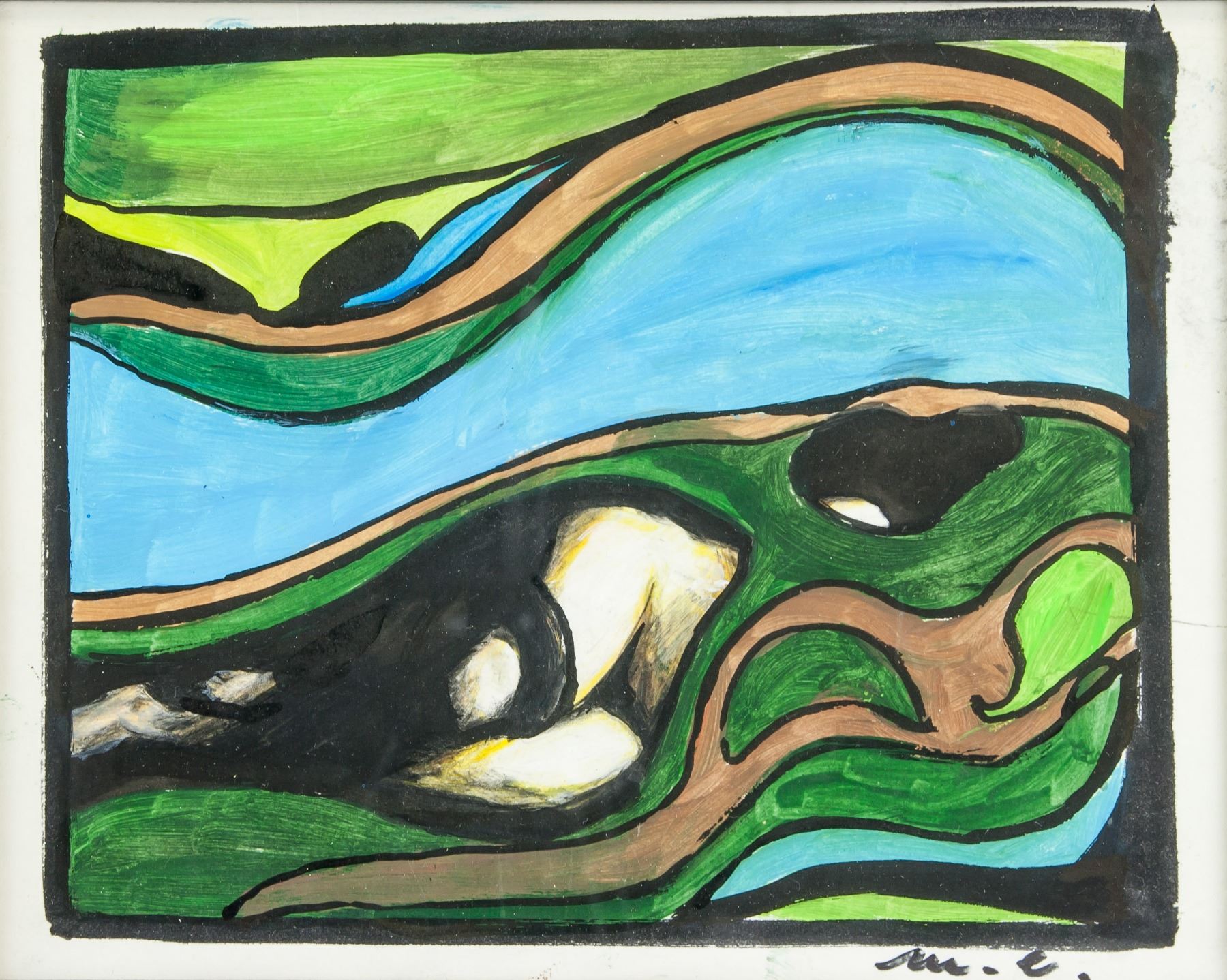 Oil on paper. Featuring a wavy river abstract composition. Signed and attr. Max Ernst (German, 1891-1976). 7.5 x 9.4 in. (19 x 24 cm). Surrealism. He worked in a variety of media including film, collage, painting, and frottage—a technique wherein he collected pencil rubbings of different objects surfaces as source material. “Creativity is that marvelous capacity to grasp mutually distinct realities and draw a spark from their juxtaposition,” he once reflected. Born on April 2, 1891 in Bruhl, Germany, Ernst and his friend the artist Jean (Hans) Arp began creating Dadaist works in Cologne during the late 1910s. Moving to Paris in 1922, he entered the milieu of several Surrealist artists, including Paul Eluard and Andre Breton. Motivated by Surrealist doctrine, the artist began making dream-like often disturbing paintings, as evinced in his The Elephant Celebes (1921) and Oedipus Rex (1922). Ernst moved to New York with his wife the famed art collector Peggy Guggenheim in the 1940s. In New York, he made one most acclaimed works Europe After the Rain (1940-1942), a psychological interpretation of war torn Europe. Notably, Ernst left Guggenheim to marry the young artist Dorothea Tanning in 1946. In 1954, he received the Grand Prize for painting at the Venice Biennale, and a major retrospective of his work followed the next year at the Solomon R. Guggenheim Museum in New York. He died on April 1, 1976 in Paris, France. Today, Ernst’s works are held in the collections of the National Gallery of Art in Washington, D.C., The Museum of Modern Art in New York, the Tate Gallery in London, and the Max Ernst Museum in Bruhl, Germany, among others. PROVENANCE: Southern Ontario estate
