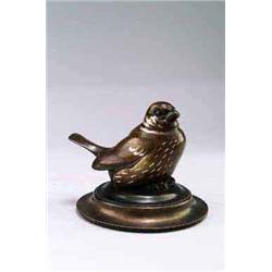 MAX ESSER 1885 - 1943 Spatz, Bronze, patiniert. Über rundem, profiliertem Tellerfuß Darstellung eines Spatzes, angedeutete Federn durch Silbertauschierung. H.: 11 cm, Ø 15 cm. Bez.: Künstlersign. und Jahreszahl M. ESSER 1936. 1936