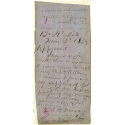 <b>601. SAMUEL B. MAXEY </b>Scarce, lengthy war-date A.E.S. removed from a document, 3" x 6 1/2", in part: "...<i>Br. Hd. Qrs., Mar. 2, 1863. Approved. I would respy ask that a Special Order issue directing Capt. Atkins to receive & forward all supplies of clothing &c. due the Tenn. portion of my command. I call attention to within reply of Col. Quarles. S. B. Maxey</i>". Also endorsed by Maj. <b>D. A. LYNN</b> of the 49th Tenn. at Franklin. Mounted, very good. <b> $400-600</b>