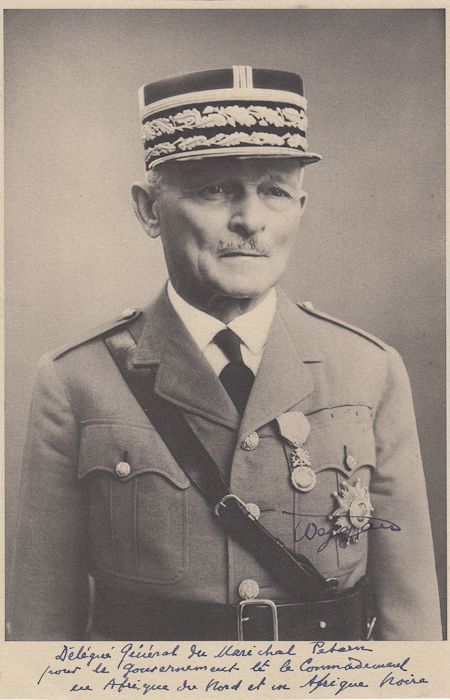 (1867 - 1965) French general who fought under Foch at the Marne, and in World War II replaced the panic-stricken Gamelin as chief of the general staff, captured by the Germans as he sought to join the Free French. Fine I.S.P. 5 1/4" x 8" b/w, a chest, up pose inscribed to a fellow general "...for the government and command in North Africa and Black Africa...". Fine.