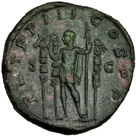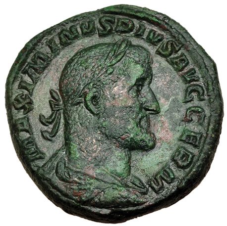 MAXIMINO I. Sestercio. Roma (237). R/ El Emperador a izq. con dos estandartes a izq. y otro a der.; P. M. TR. P. III COS. P. P., S.C. RIC-37. CH-67. Campos retocados. Pátina verde. MBC.