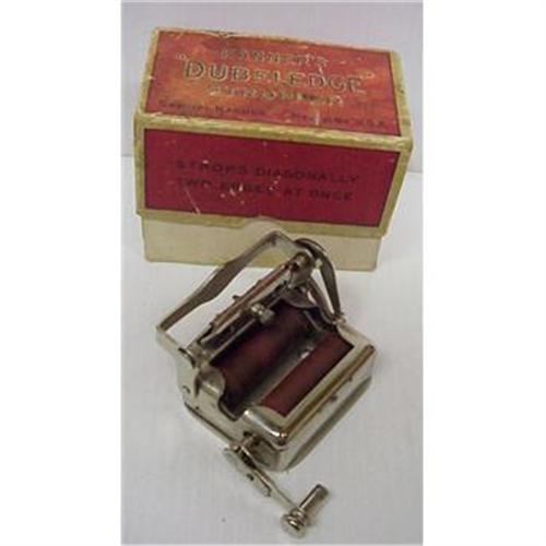 </font></strong>THIS IS VERY OLD CHROME STROPPER, (PAT JULY 9 1918) MADE BY KANNER'S MODEL FOR GILLETTE BLADES, REVERSES BLADE AUTOMATICALLY AND STROPS TWO EDGES AT ONCE ALSO STROPS GIAGONALLY. IN VERY GOOD CONDITION AS PER PICTURE AND IN WORKING ORDER, IT COMES WITH LOVELY ORIGINAL BOX WHICH IS SHOWING AGE BUT STILL LOVELY, INSIDE THE BOX IS STAMPED: COLLIN C LAING 290 VICTOR ST. 30-767 AGENT, MAY 11 1928 - MEASURES ABOUT 3 1/2" X 3" X 2" HIGH - THANK YOU FOR LOOKING. </font>