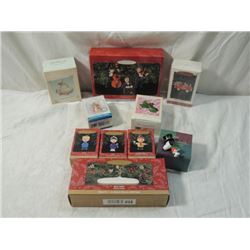 GREAT LOT OF HALLMARK CHRISTMAS ORNAMENTS. INCLUDING THE COMPLETE PEANUTS CHARLIE BROWN CHRISTMAS WITH TREE AND ALL FOUR FIGURES, 3 STOOGES SET NI