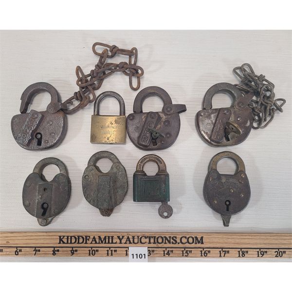 LOT OF 7 - RAILROAD SWITCH LOCKS & KEYS - INCL CPR, CNE & CNR, ETC. 1100 - LOT OF 7 - RAILROAD SWITCH LOCKS & KEYS - INCL CPR, CNE & CNR, ETC.
