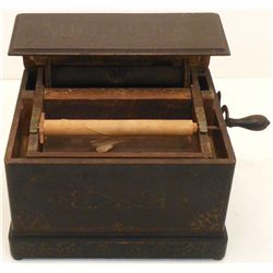 11" tall X 12" wide x 10" deep. Antique Melodia Roller Organ mechanical organette an early Gatley. Fabulous stenciling on walnut case...