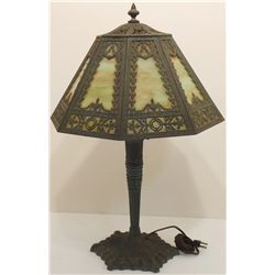 19 1/4" tall X 7 3/4" diameter base, shade is 9 1/2" tall X 16" across, unknown maker, six streaked glass panels, base and shade...