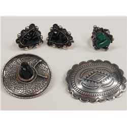 1- Sterling Silver Sombrero Pin with Black onyx. 2- Sterling Silver Oval Hand Chased Aztec-Style Pin. 3- Sterling Silver Earrings with Black Onyx. 4-