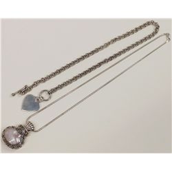1- 18" Sterling Silver Necklace with Marcasite and Pink Stone Pendant. 2- 16" Sterling Silver Link Necklace with Heart Pendant. Both are m...