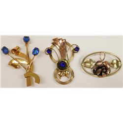Two Gold Filled Brooches with Blue Stones. One Gold Filled Brooch with a two tone floral design. All are in Great Condition.