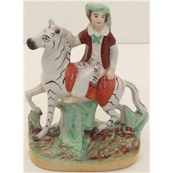 7 1/2" tall x 6" wide, circa early 1900's, Staffordshire figural man riding a zebra, he dressed in brightly colored Turkish costume. M...