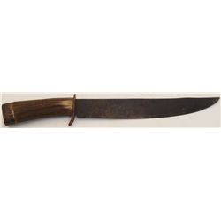16 1/4" total length with a 11" blade, modern Bowie style knife with antler handle, unmarked, blade has some tarnish. Overall great condit...