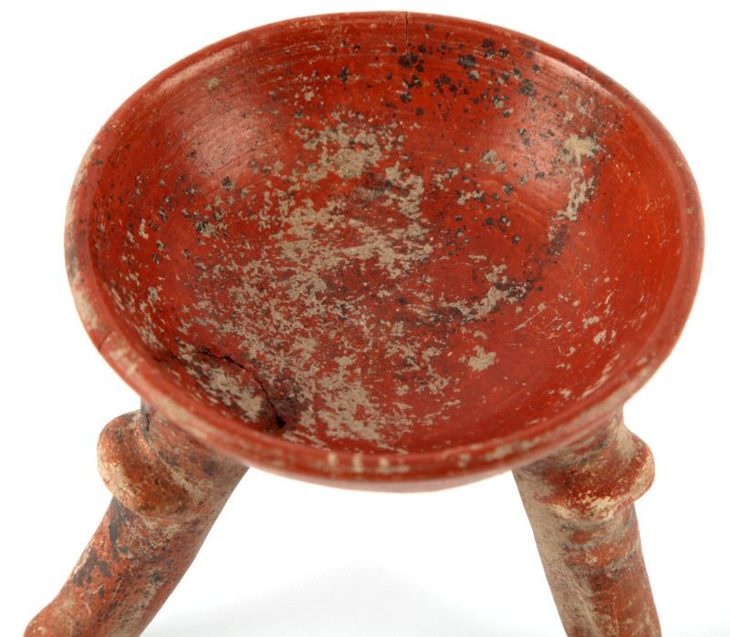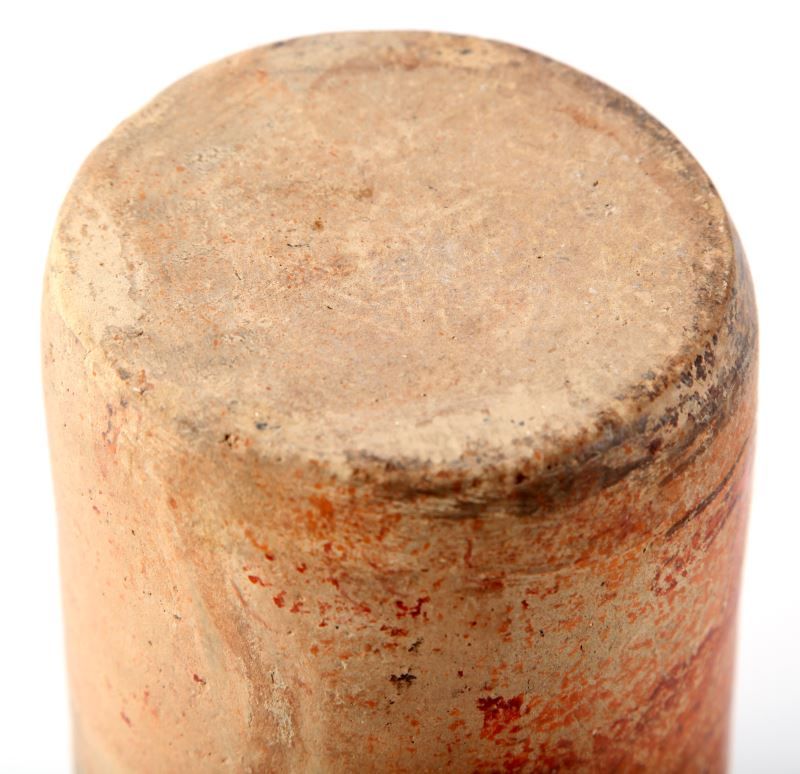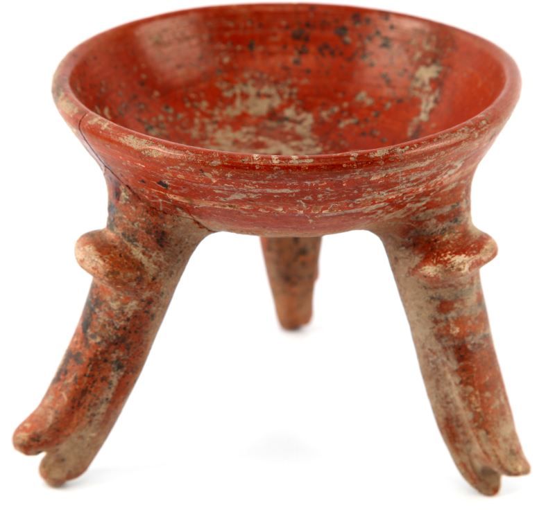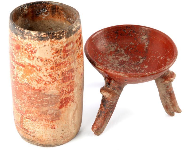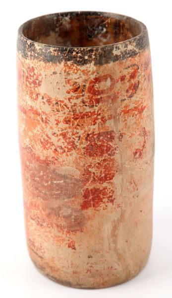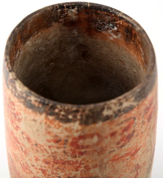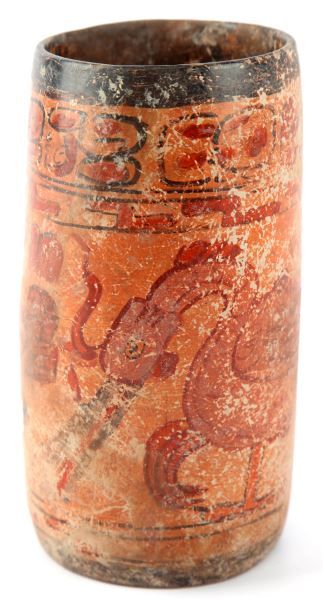 Pre-Columbian Mayan Culture polychrome cylinder jar, decorated in geometric patterns and birds. Measures approximately 8 inches in height, and 3.75 inches in diameter. Some hairline fissures, otherwise good condition.
